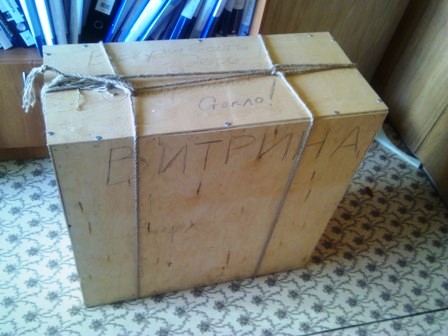 Витрина полностью готова к перевозке. Ящик запечатан и перевязан бечевкой для удобства перемещения и погрузки-выгрузки