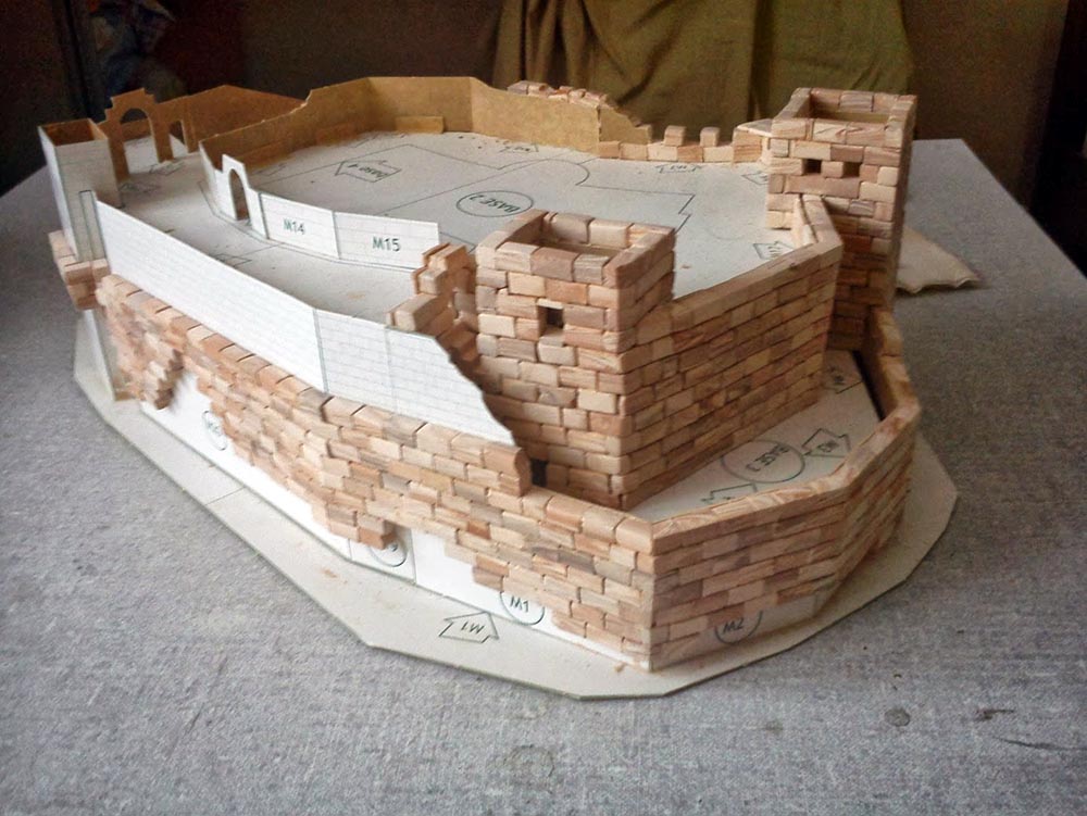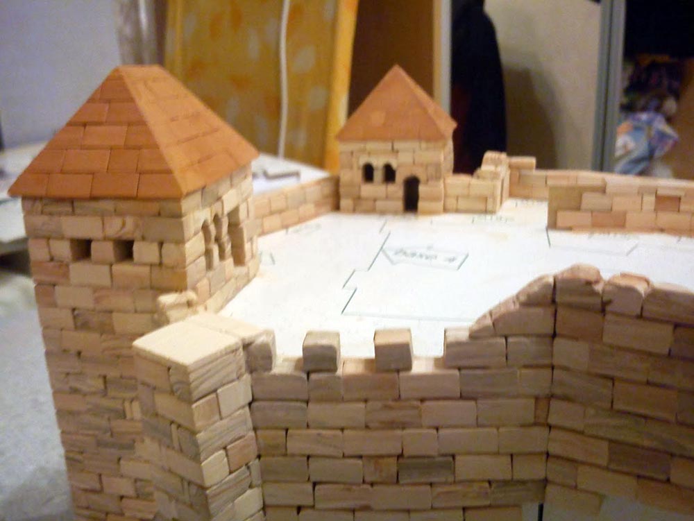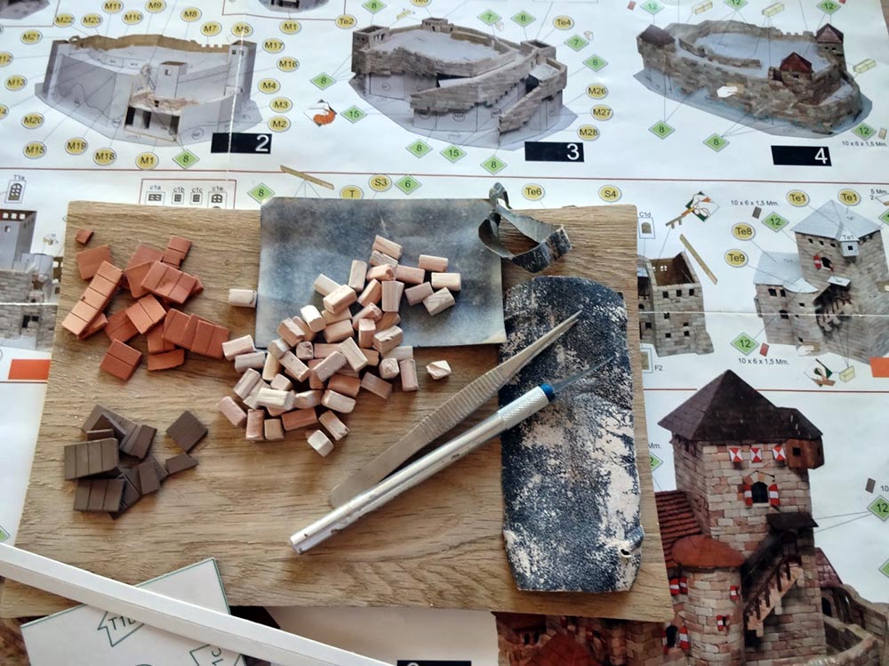 На каждой стене есть сетка, указывающая, что здесь должен быть кирпич. Старайтесь соблюдать прямоту ряда по этой сетке! Если начнётся искривление ряда, тут же – надфиль и нож в руки - и править кирпичи. Наметившаяся кривизна прогрессирует с пугающей динамикой. Я обычно правлю не реже чем через пять рядов, а то и через три ряда - лучше предупредить, чем мучиться и стачивать горбы. Особенно надо быть внимательным на предпоследнем ряде, тем более если стена увенчана бойницами. И не жалейте клей! Я иногда просто проливаю ряд со стороны каркаса, клей быстро уходит внутрь и ещё лучше скрепляет ряды.