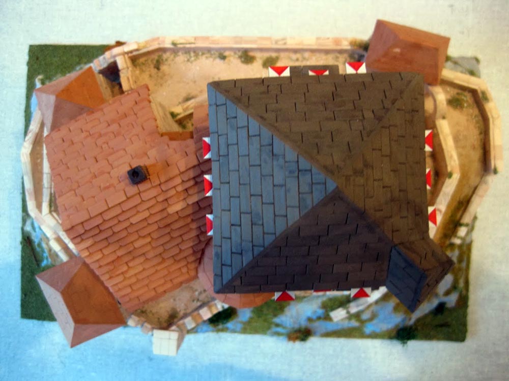 Ну что ж, стены сделаны и под крыши подведены, окна-двери подточены, пора бы заняться кровельными работами. Для этого сначала ставим картонные основания крыш, а потом укладываем на них черепицу. Мне заниматься кровлями нравится даже больше, чем стенами. Во-первых, они не такие большие, чтобы они надоели, а во-вторых, именно здесь требуется разумная аккуратность. Ведь плиточки должны лежать ровно, без волн, к тому же нужно постараться как можно лучше соблюсти разбежку швов. На стене это не так заметно, но кровля – она привлекает гораздо больше внимания. Потому здесь очень аккуратно надо подходить к подбору ширины черепичек, каждый ряд необходимо ровнять после установки.