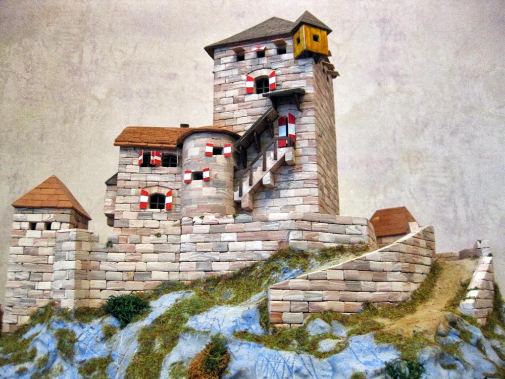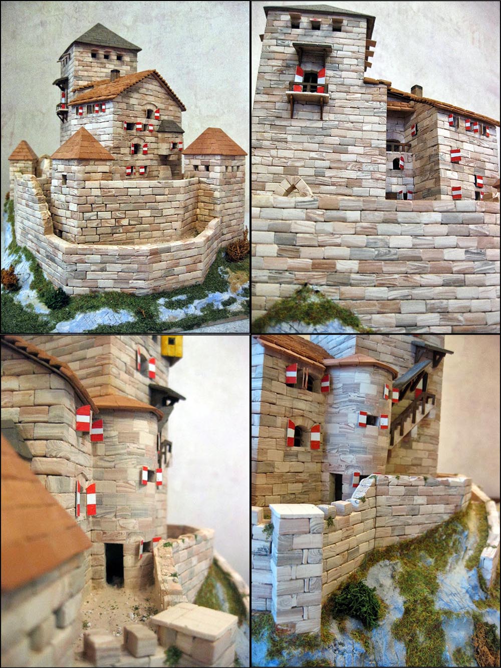Основные элементы набора - это кирпичики 10х5х5мм и плоская «черепица» 11х6х1мм, причём черепица бывает трёх цветов – светлая, коричневая и чёрная. Также в наборе могут оказаться, к примеру, лестницы, элементы арок, террейн, сухая краска, а также декоративные элементы, как керамические, так и картонные. Всего число элементов может перевалить за 7 тысяч штук, но обычный средний набор – это около 3-4 тысяч элементов. Производитель предлагает нам создать нечто очень красивое из этого невзрачного, громоздкого и пыльного набора. И далее на примере собранного мной замка Burg Branzoll я в общих словах расскажу, как делается такая красота.