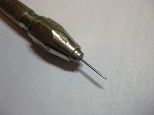 Далее несколько слов о сверлышке для сверления отверстий под нити. Я использовал сверло 0,3 мм из этого набора. Так как моя сверлилка не зажимает столь мелкие сверла, да и сверлить ей такую мелочь не слишком то удобно, проблему решил просто: взял рейку ореха, проковырял канавку и вклеил сверло, затем сверху на суперклее приклеил такую же рейку. Полученную рукоять обработал ножичком, получив микросверлилку.