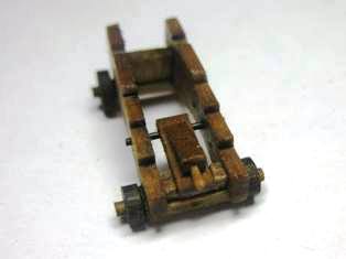 Рукоятку клина я выточил из зубочистки. Колеса выполнил из подходящих по диаметру круглых заготовок из набора, нарезав заготовки на таблетки посредством отрезного диска, обработал мелкой шкуркой и просверлил отверстия под оси. Сами оси выточены заодно с деталями лафета, как показано на схеме. На этой схеме все детали из дерева, кроме болта, он залит серым цветом. Его я сделал из скрепки и зачернил Brass Black.