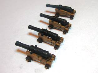 На Баунти всего 4 четырехфунтовых орудия на верхней палубе. В виду их малочисленности орудия было решено максимально, насколько это возможно в данном масштабе, детализировать, изготовив новые деревянные лафеты по анатомии Маккея и выполнить полную обвязку. Amati предлагает установить стандартные пушки на металлических лафетах. И стволы, и лафеты в наборе анодированы под бронзу.