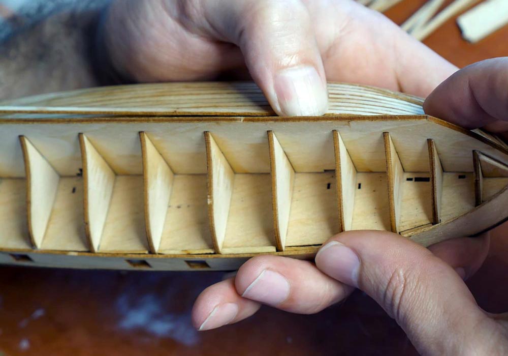 Постройка корпуса модели парусника достоверно повторяет принципы традиционного судостроительного искусства. Всё начинается с установки шпангоутов на киль. Как и на настоящих верфях, эти «рёбра» задают обводы корпуса и обеспечивают правильное распределение нагрузок по всей конструкции.