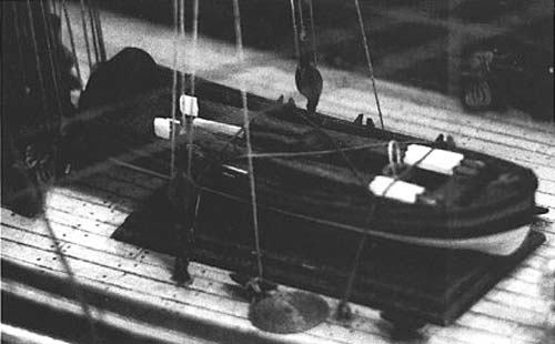 Судовая шлюпка была приобретена как отдельный небольшой комплект. Однако качество дерева было очень плохое и прилагаемая инструкция дала больше вреда, чем пользы, поскольку переборки были в неправильной последовательности и располагались на стапеле неверно. В конце концов я сумел найти приемлемую форму, напоминающую шлюпки с изображения Ван де Вельда. Весла были сделаны из оставшейся заготовки, но чтобы придать им форму согласно Мондфельду, пришлось сточить примерно 60% материала.
