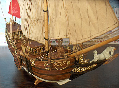 Неглупо поступают те фирмы, что кладут маленькие каталоги в модель корабля. Когда-то, наткнувшись в таком каталоге на эту яхту, я оказался под сильным впечатлением. Обилие золоченых украшений, ажурные застекленные галереи, яркие флаги, изящные пропорции – и небольшие размеры (длина около 40 см и высота на подставке около 50 см) при несложном, хотя и оригинальном такелаже единственной мачты. При этом модели старинных яхт вообще-то редкость, а модель парусника с такой ценой при такой деталировке – вообще исключение. Есть у других производителей еще несколько королевских яхт, возможно, они и лучше сделаны, но цены выше в разы.