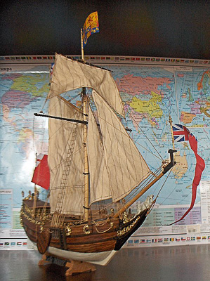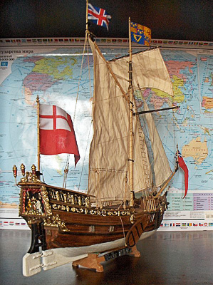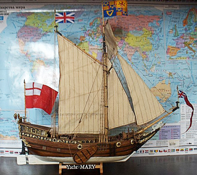 Немного об истории судна. Кто читал книги Дюма о мушкетерах, тот вспомнит историю казненного английского короля Карла I Стюарта, его гонителя Кромвеля и сына короля, изгнанника Карла II. Долгое время молодой принц прожил в Голландии. Яхтингом там он увлекся всерьез и на всю жизнь, и Ост-Индская компания подарила возвратившемуся домой принцу, ставшему таки королем, эту специально построенную яхту. Карл ходил на яхте на морские смотры, участвовал в гонках (соревновался со своими знатными родственниками) – в общем, очень любил это судно. Но, к сожалению, через десять лет яхта погибла на скалах, унеся жизни половины экипажа. В прошлом веке ее нашли на дне – жалкие остатки.