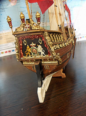 Декор очень прилично отлит, нуждается разве только в небольшой обточке швов литья (подкрасить можно любой золотой модельной краской) – но кормовой герб с окантовкой меньше положенного размера (корма точно легла в чертежи, так что это неточность литья). Пришлось осторожно разломить его на три части (звери с гербом и края рамки), приклеить на корму и заделать разрывы эпоксилином, придав ему "тканево-складчатую" фактуру. Это нетрудно, но досадно. Литые резные окошки кормовых галерей немного короче положенного – надставил с кормы рейкой, металл окошек мягкий, их можно легко подгонять. Вместо готовых голубых окошек я сделал настоящие "переплеты" из проволоки, а остеклил темной пленкой – от старых ненужных дискет. Нудное занятие, хотя и не жалею. Черные углы между оконными проемами покрасил тонким черным перманент-маркером для CD-дисков – он позволяет не зачернить выпуклую золоченую "резьбу". Герб и его обрамление на корме покрыл не краской, а цветными прозрачными лаками для моделей японской фирмы "Tamiya" – они смотрятся как-то праздничнее. Красным лаком отделал и стекла кормовых фонариков.