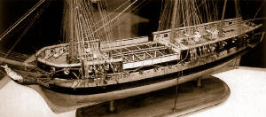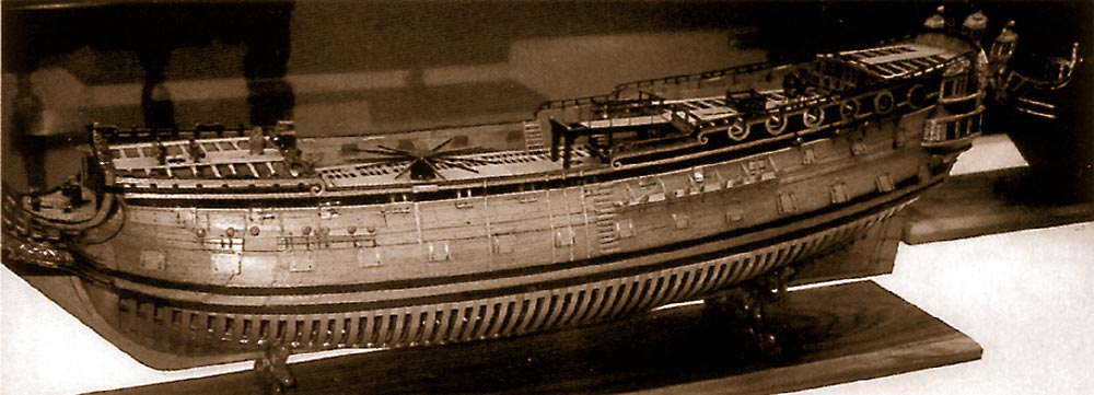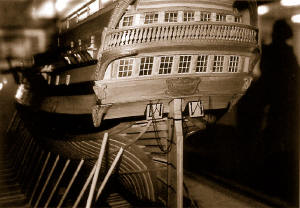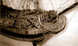 Chesapeake Эта модель была специально заказана для подарка капитану Филиппу Бруку (Phillip Broke) после захвата Chesapeake. Полковник Роджерс выкупил эту модель у одного из потомков Брука, лорда Willoughby de Broke. На этой фотографии показана корма корабля, галерея, украшения в виде скрещенных флагов и двух купидонов с обеих сторон, спущенный веревочный трап, цепные штур-тросы руля, прорез на пере руля и два пушечных порта в корме. |