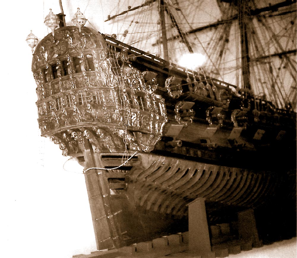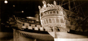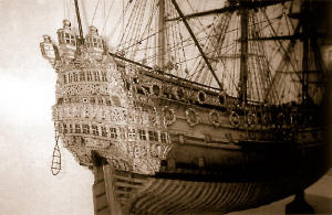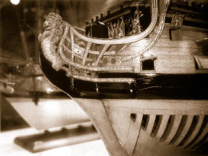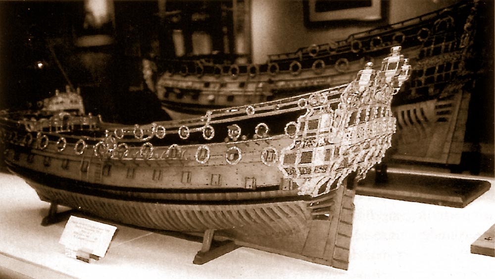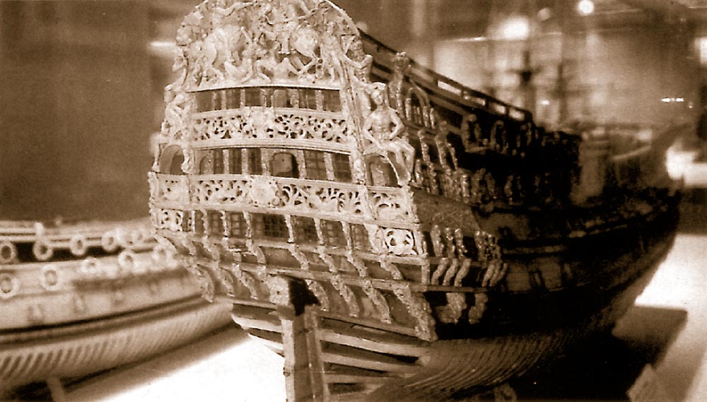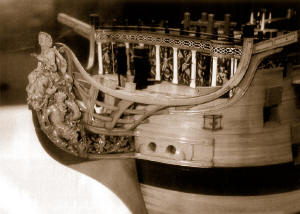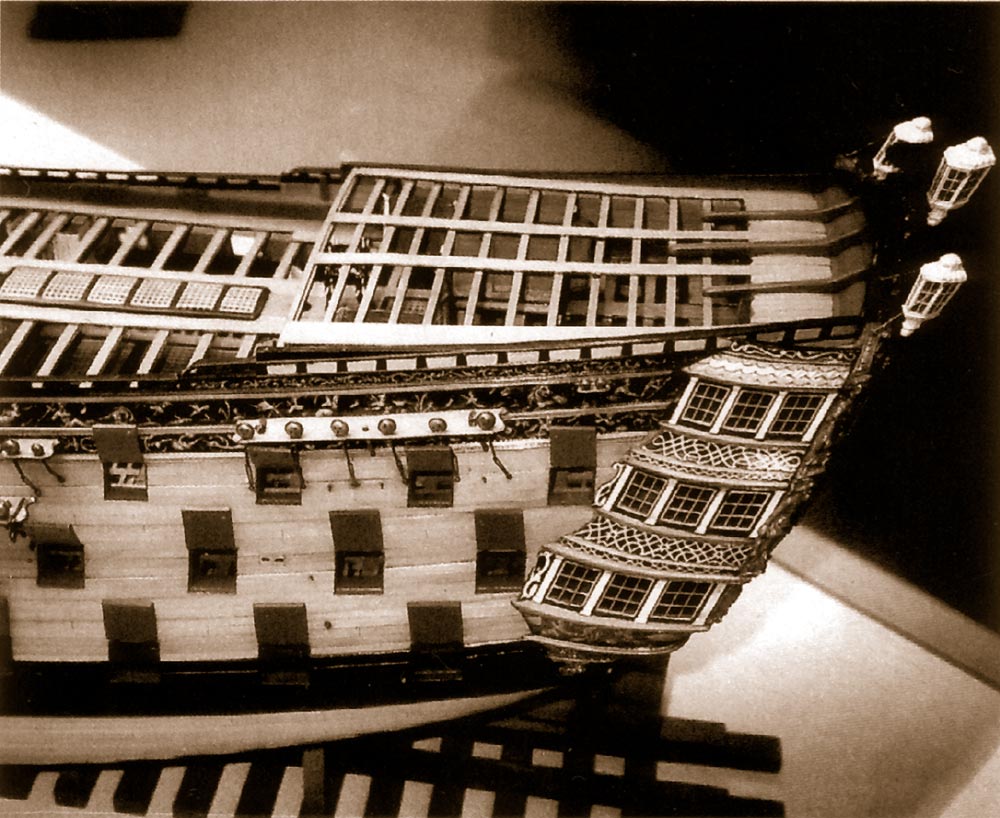 Предыдущая модель, вид на корму показывает богатую резьбу транца и пилястров. Обратите внимание на необычные, в виде изогнутой капли, нижние окончания квартергалереи. |
