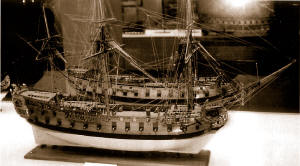 Bon Homme Richard Американский 70-ти пушечный корабль, 1779 год. Хотя эта модель является исключением в коллекции Роджерса (она выполнена в наше время), но она стоит рядом со всеми другими моделями и обычный посетитель не способен отличить ее от других. Bon Homme Richard, переоборудованный из французского торгового судна le Duc De Duras и переданный американцам, является хорошим дополнением к моделям коллекции, намного старшим его. Эта великолепная модель была построена канадским моделистом Бобом Куком (Bob Cook). Данная фотография показывает квартергалерею правого борта и три длинных пушки на нижней палубе. Модель представлена на стапеле с кирпичным основанием, подпорками и рельсами. |