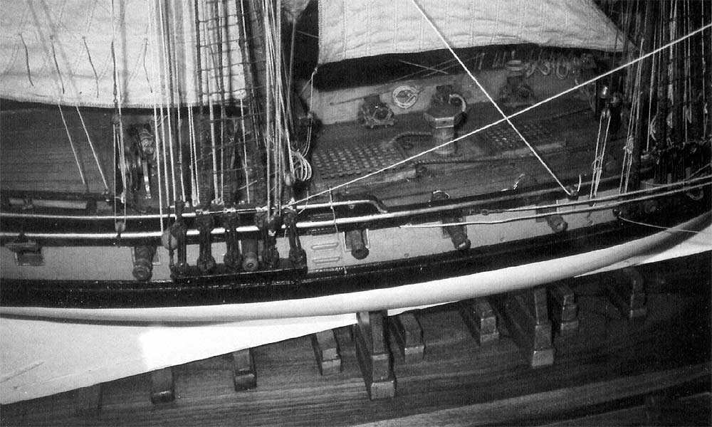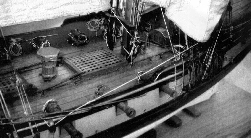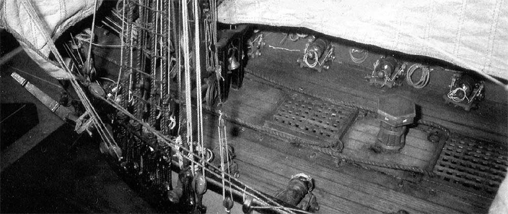 Вид на ванты фок-мачты, шпиль и на якорный канат с кабалярингом. Доски палубы производят впечатление очень широких. Палуба выполнена из дуба и обработана маслом, шпиль окрашен в красный цвет с позолоченными скрепляющими обручами. Фальшборта изнутри красные, как и комингсы люков. |