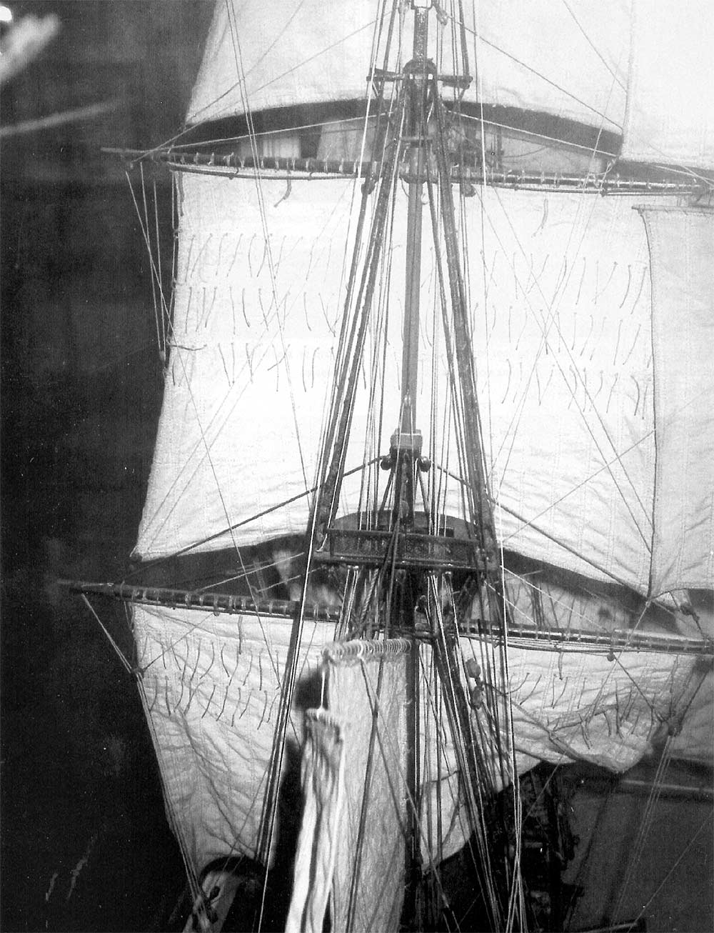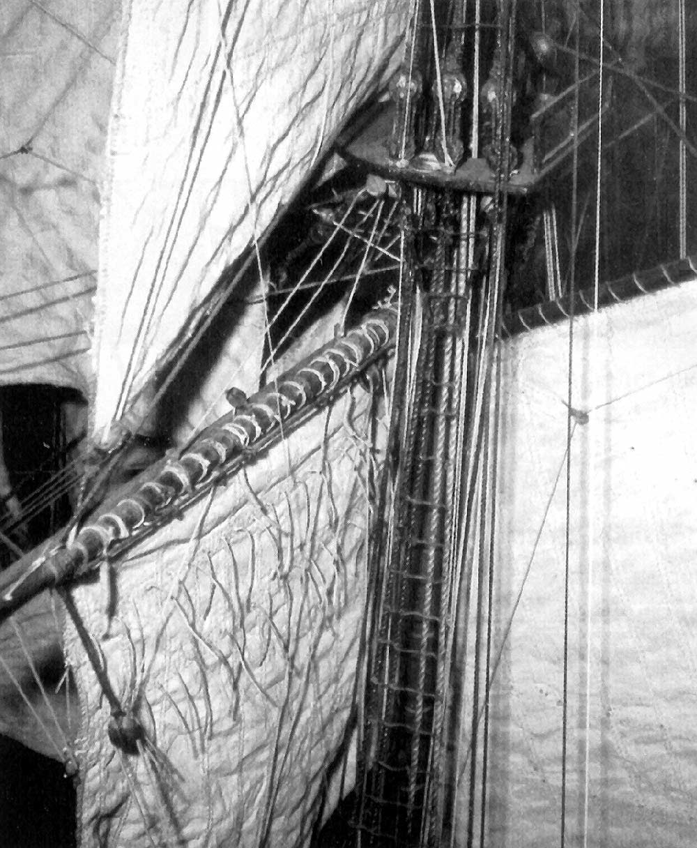 Вид на грот-рею и марс. Обратите внимание на богатство деталировки парусов: швы, боуты, риф-сезни и шкаторины. |