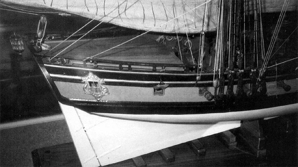 Вид на корму (не очень удачный). Подзор кормы и транец черные с позолотой. Рамы окон и название корабля тоже позолочены. Центральное и оба крайних окна фальшивые, они только нарисованы, реально их не было. |