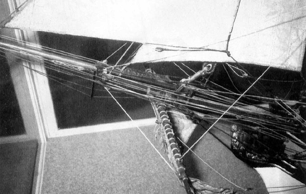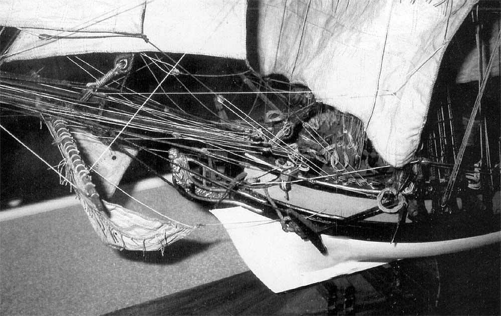 Крупный план утлегаря, блинда и такелажа фок-штага. Обратите внимание на анахроничный мартин-гик. |