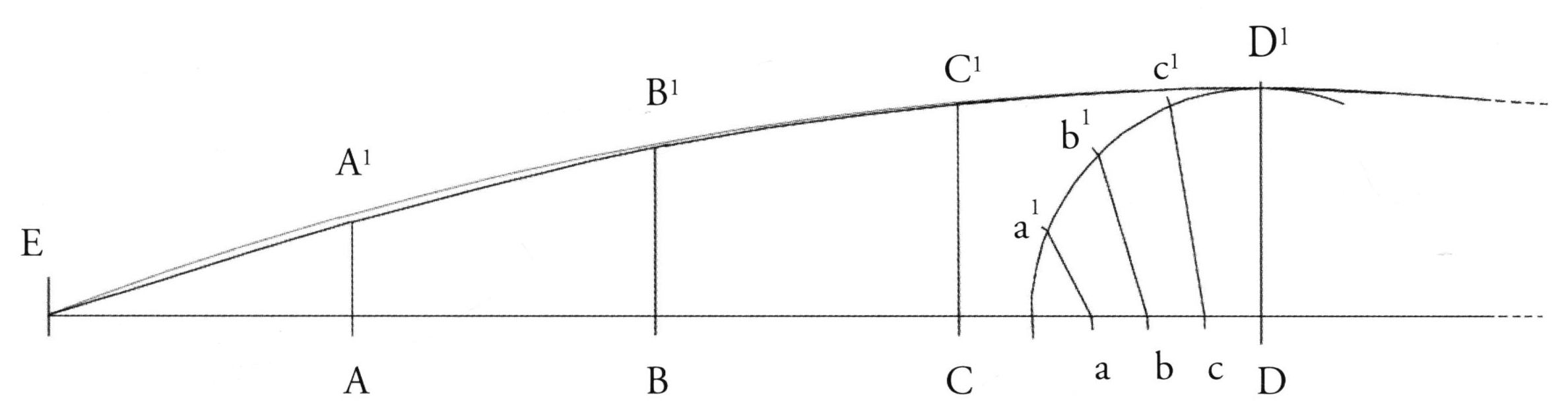 11. При помощи гибкой рейки или лекала нарисуйте кривую между концевыми точками и точками, отмеченными на перпендикулярах (E, A’, B’, C’, D’ и т.д.).