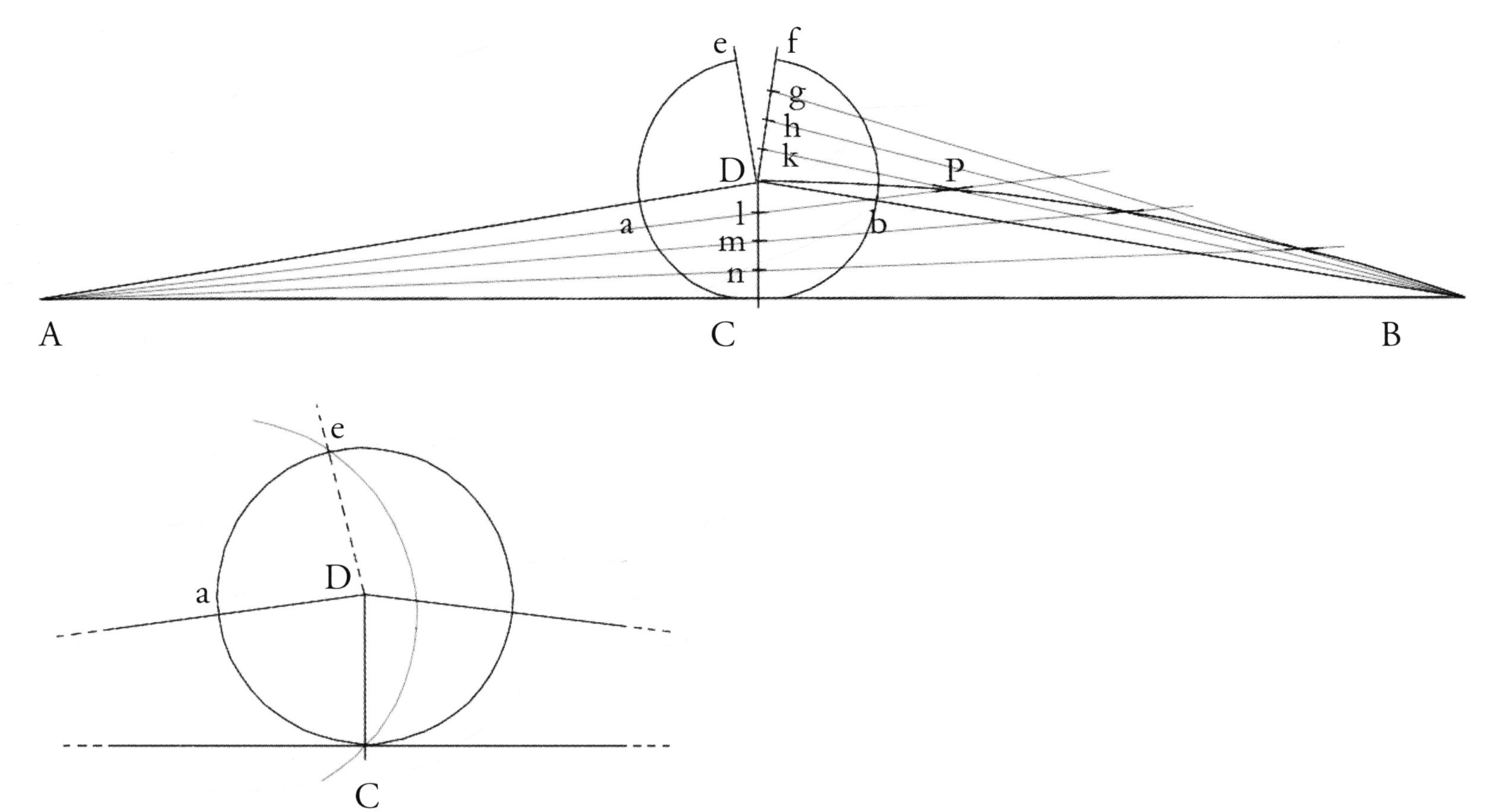 Нарисуйте линию построения Bk. Теперь нарисуйте ещё одну линию построения Al, пока та не пересечёт линию Bk в точке Р. Повторите работу, построив линии Bh и Am, Bg и An и т.д., чтобы получить ряд точек пересечения. Теперь повторите это на другой половине бимса аналогичным образом. Соедините все точки пересечения при помощи гибкой рейки или лекала, чтобы получить требуемую форму погиби.