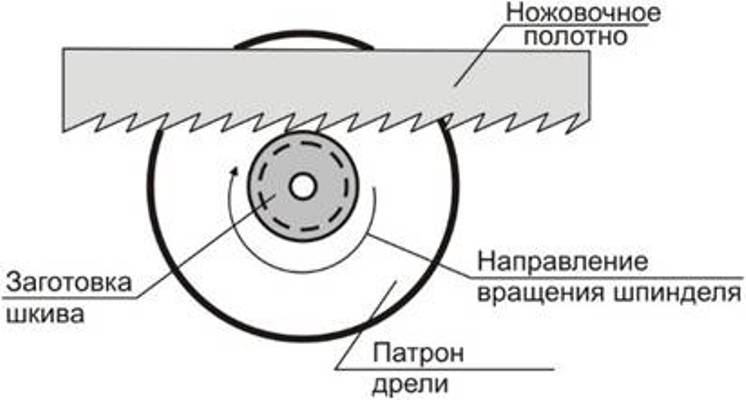 Эту операцию необходимо проводить предельно аккуратно, т.к. ножовочное полотно может уйти в сторону. Зубья ножовочного полотна должны быть направлены навстречу вращения шпинделя дрели, как показано на схеме.
