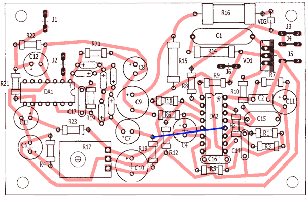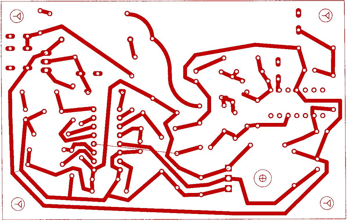 Подробное описание применения микросхемы TDA1085C читайте в DataSheet. Регулятор смонтирован на печатной плате. К сожалению, исходные файлы в формате Eagle Layout Editor не сохранились, поэтому рисунок печатной платы и схема расположения элементов были восстановлены из сохранившихся бумажных копий. Налаживание устройства несложно. УСТРОЙТВО ИМЕЕТ БЕСТРАНСФОРМАТОРНОЕ ПИТАНИЕ, ПОЭТОМУ ПРИ НАЛАЖИВАНИИ НЕОБХОДИМО СТРОГО СОБЛЮДАТЬ МЕРЫ БЕЗОПАСНОСТИ ПРИ РАБОТЕ С ЭЛЕКТРИЧЕСКИМИ УСТРОЙСТВАМИ ! После проверки правильности монтажа регулятор подключается к сети без двигателя и измеряется напряжение на выводе 9 м\сх DA2. Если регулятор напряжения питания работает нормально, на выводе 9 должно быть около 15v. Далее настраивается датчик оборотов. Двигатель включается в сеть через трансформатор мощностью 200w и выходным напряжением 50-70v или через регулятор мощности (в крайнем случае можно и прямо в сеть, но двигатель при этом будет сильно шуметь). К выводу 12 м\сх DA1 подключается осциллограф для наблюдения за формой импульсов датчика. Далее, перемещением магнитной головки относительно шестерни добиваются максимальной и стабильной амплитуды импульсов тахогенератора. После этого к регулятору подключается двигатель и вращением переменного резистора R17 проверяется диапазон регулировки оборотов. Скорее всего, придется подбирать емкость конденсатора C14 для получения требуемого диапазона регулировки. © Игорь Капинос, 2005 |