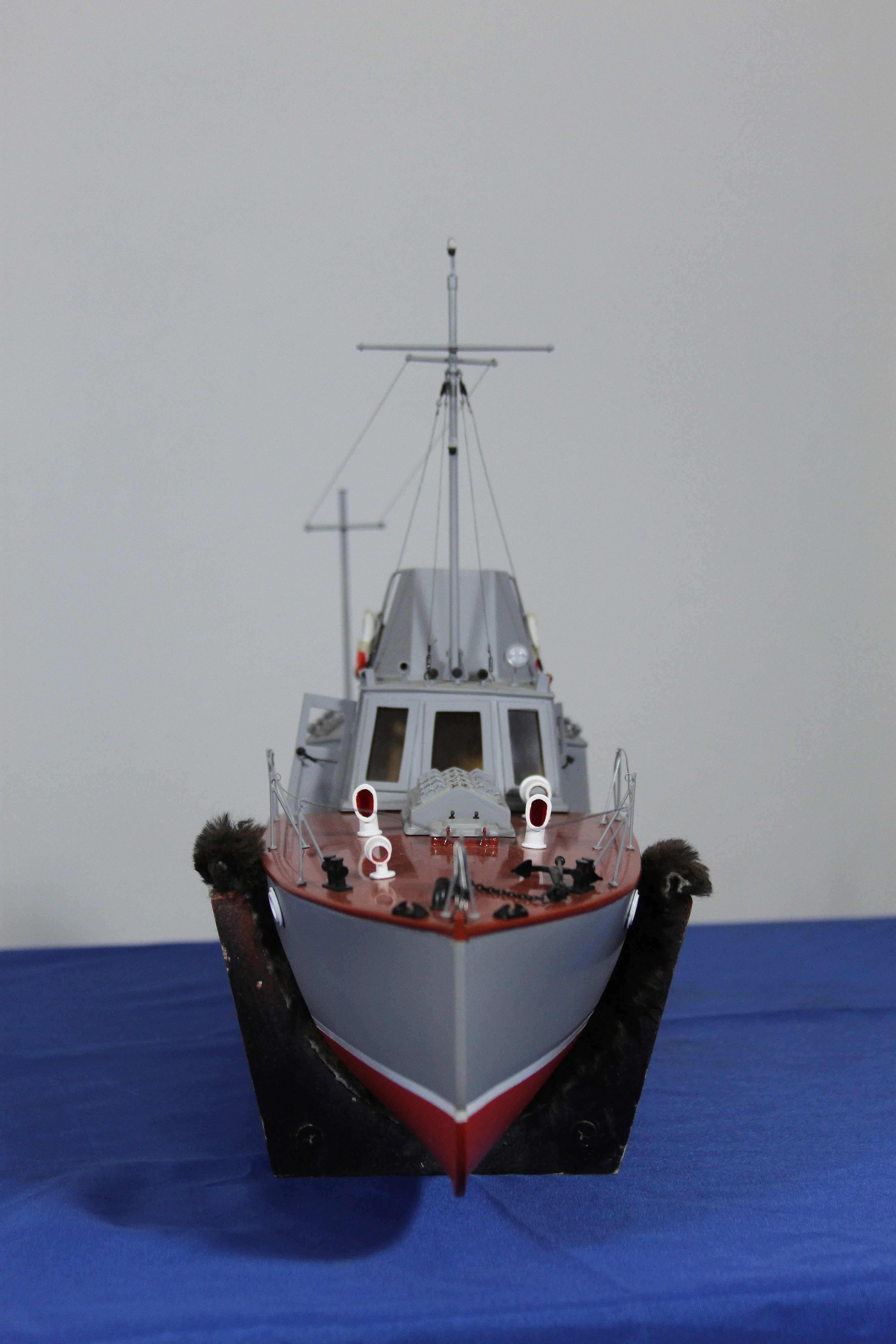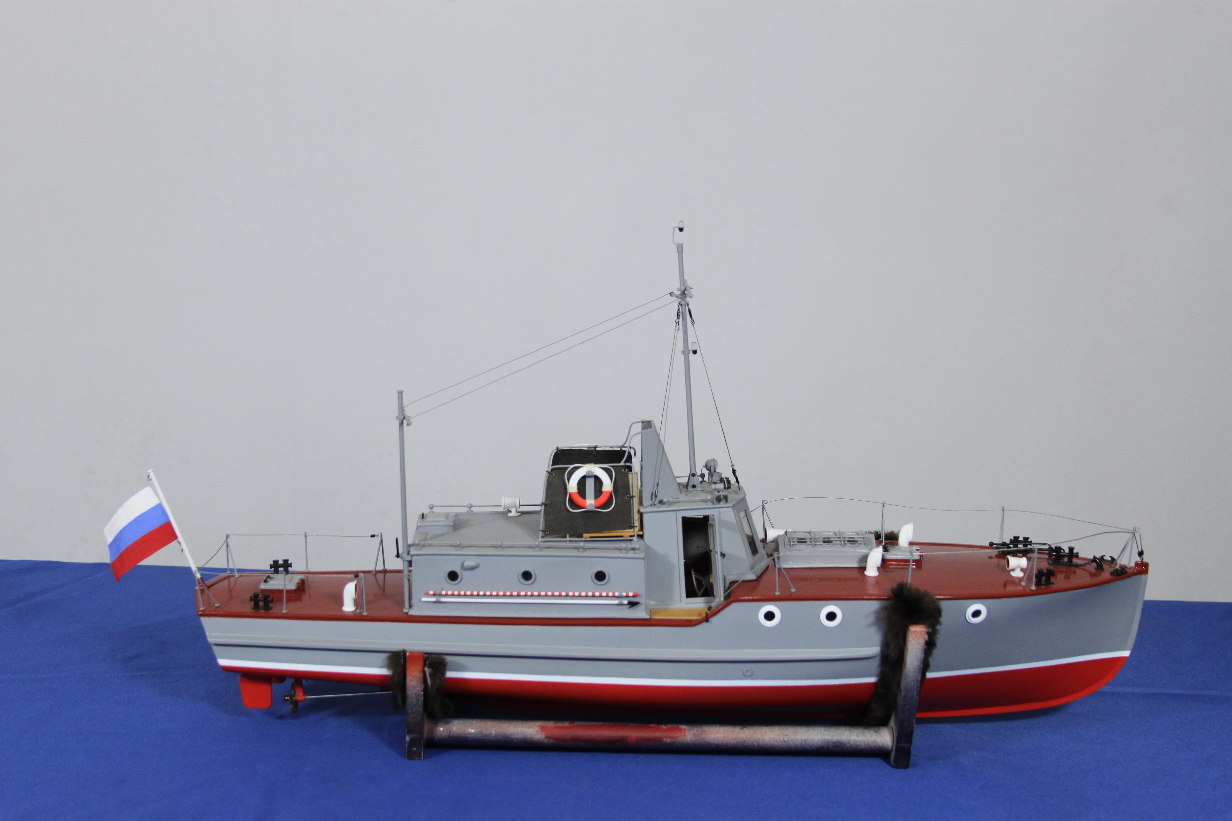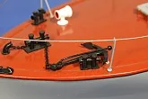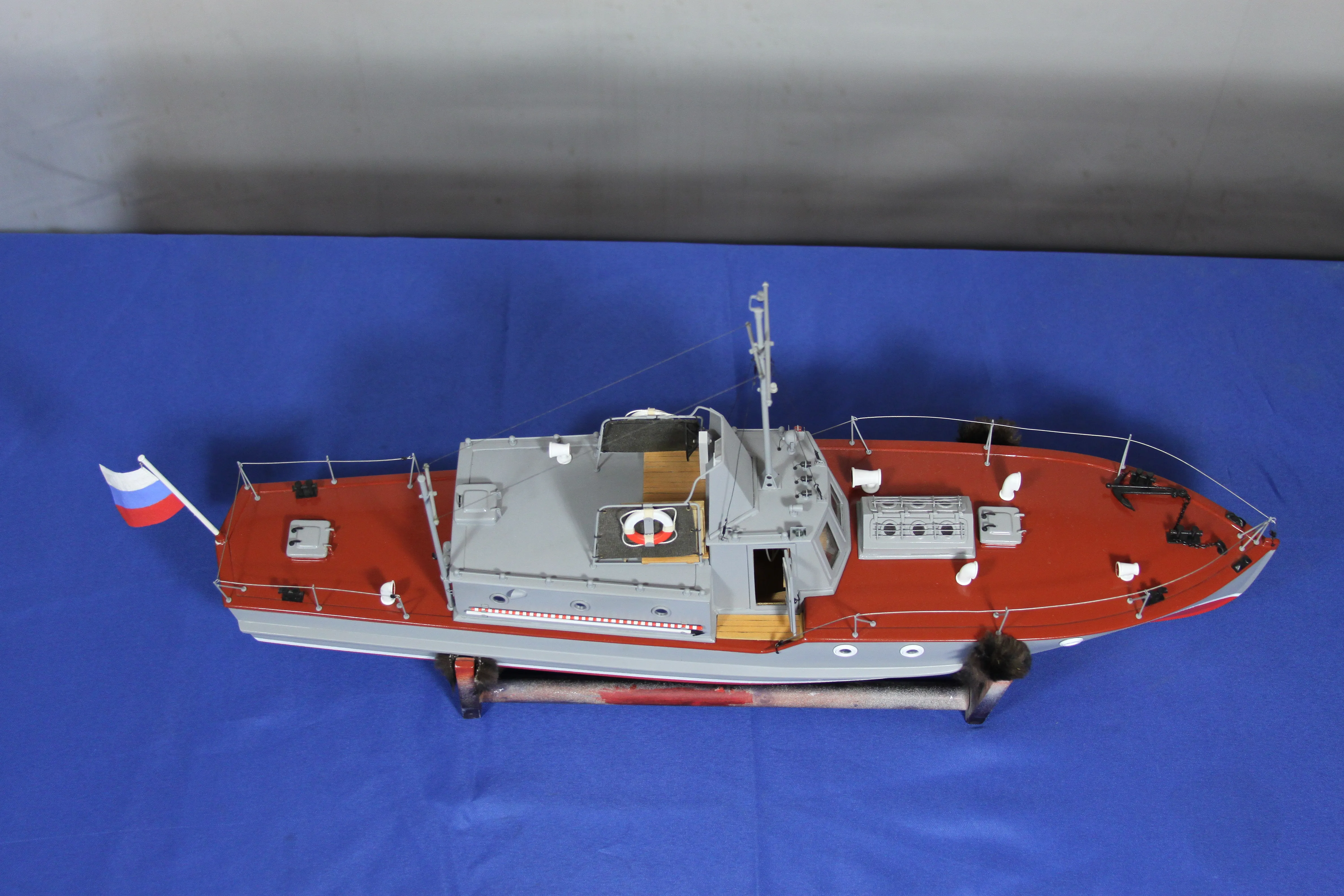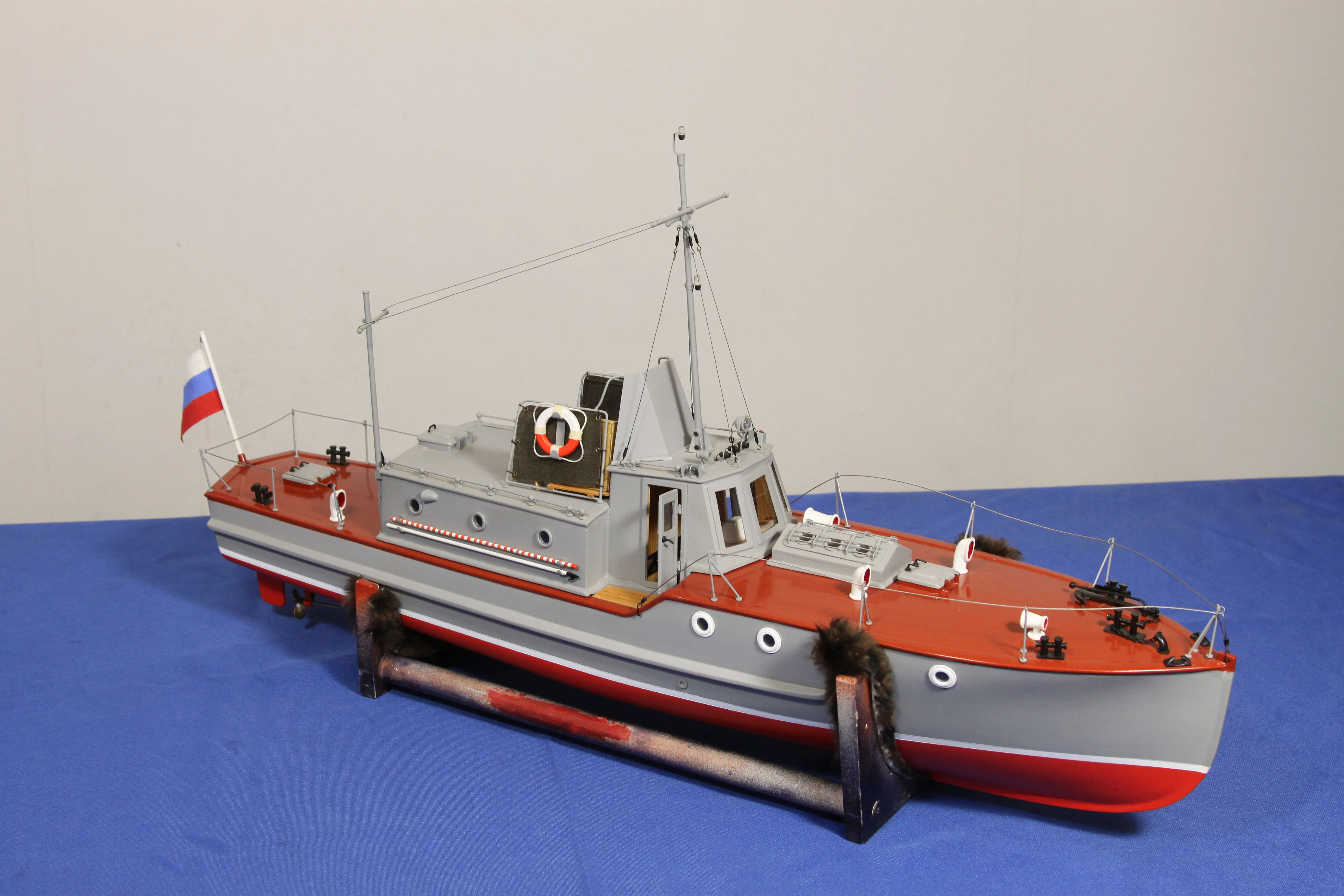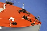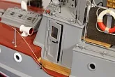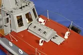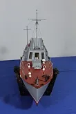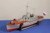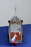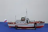 Модель изготовлена с нуля по чертежам из журнала "Моделист конструктор". Корпус, палуба и рубка сделаны из стеклопластика. Люка выдавлены из меди, леерные ограждения из проволоки, якорь из текстолита, иллюминаторы выточены из дюралюминия, фара-прожектор из латуни и оргстекла, компас из текстолита и оргстекла. Модель покрашена красками фирмы "Sikkens". Масштаб 1:23.