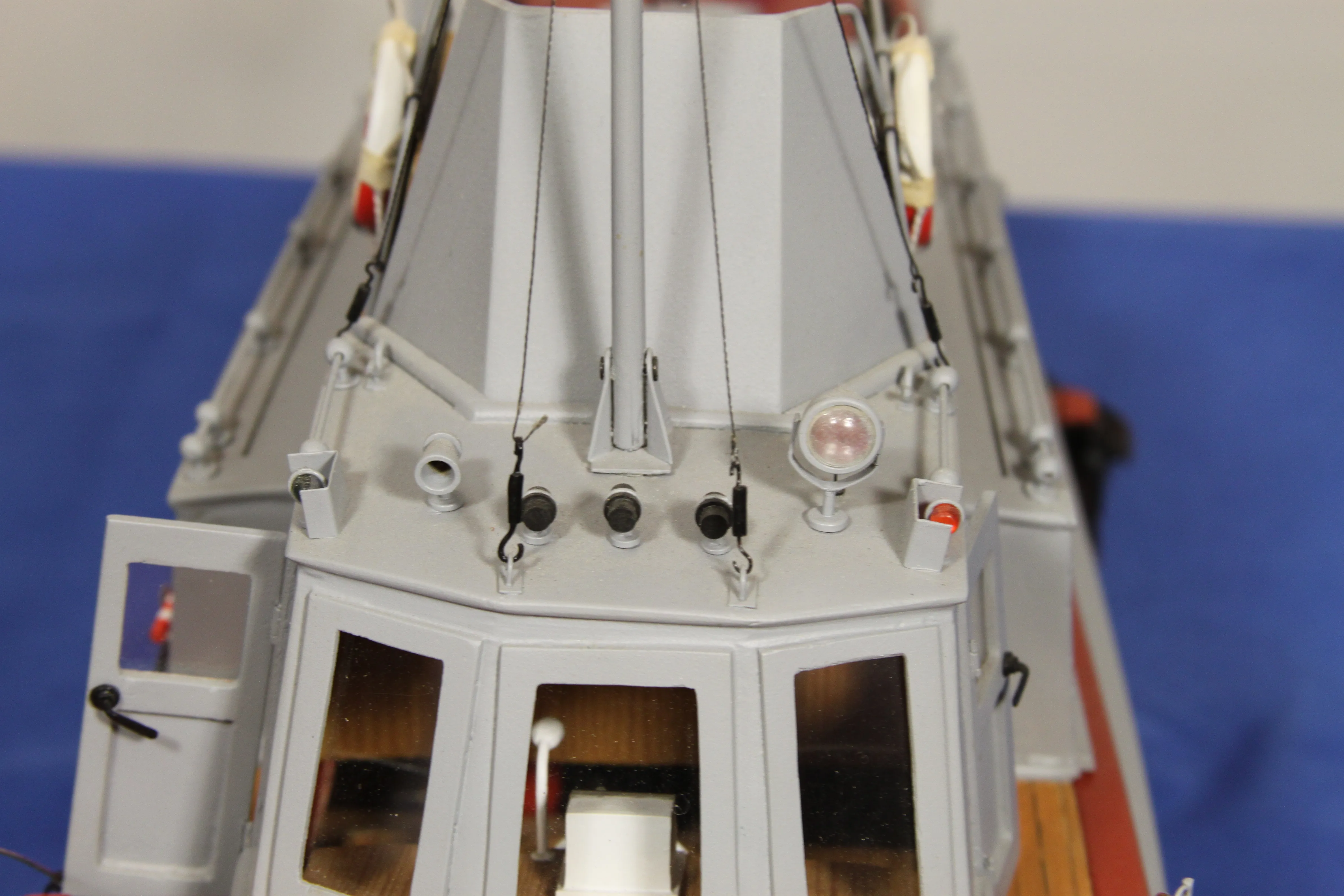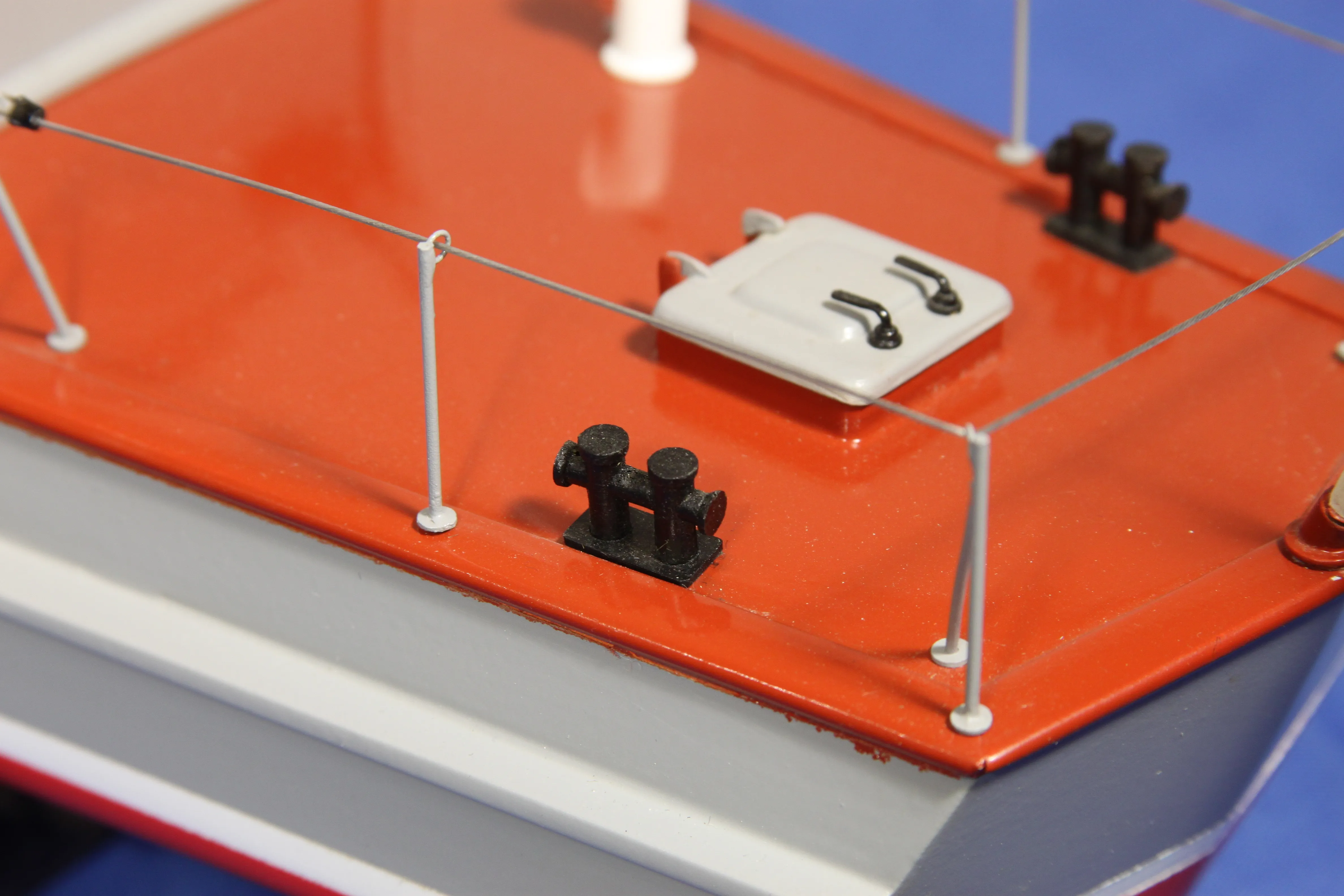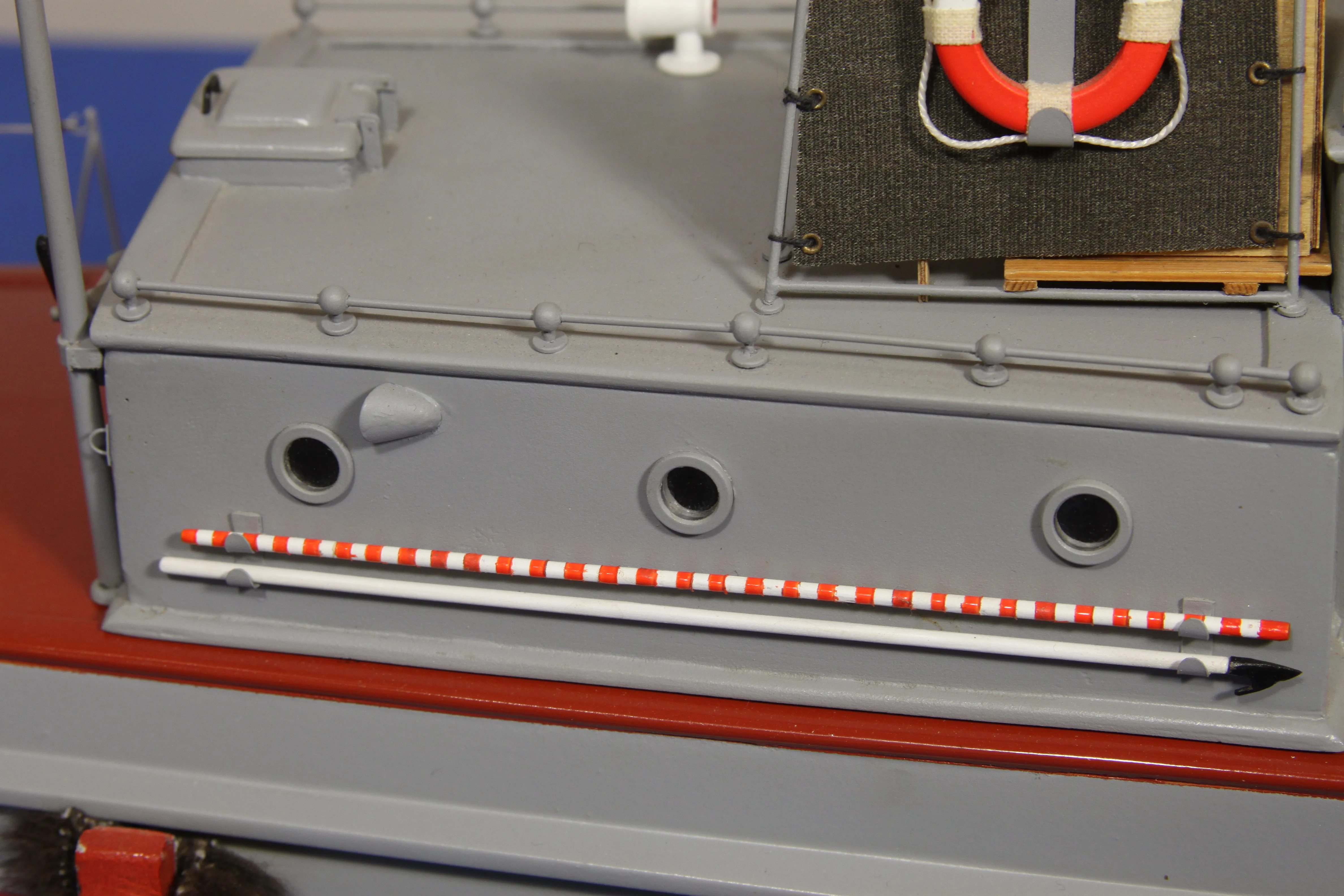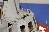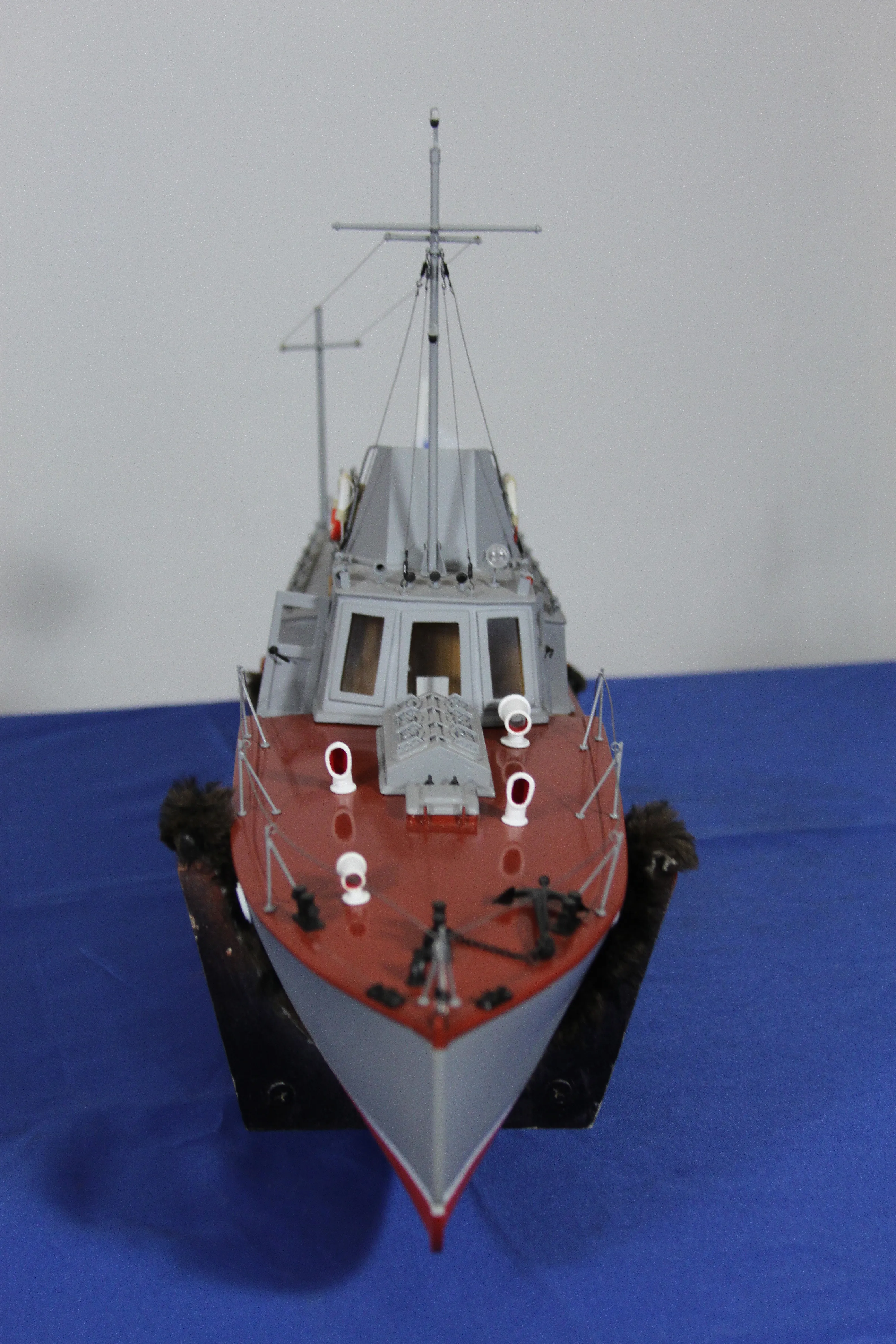 Модель изготовлена с нуля по чертежам из журнала "Моделист конструктор". Корпус, палуба и рубка сделаны из стеклопластика. Люка выдавлены из меди, леерные ограждения из проволоки, якорь из текстолита, иллюминаторы выточены из дюралюминия, фара-прожектор из латуни и оргстекла, компас из текстолита и оргстекла. Модель покрашена красками фирмы "Sikkens". Масштаб 1:23.