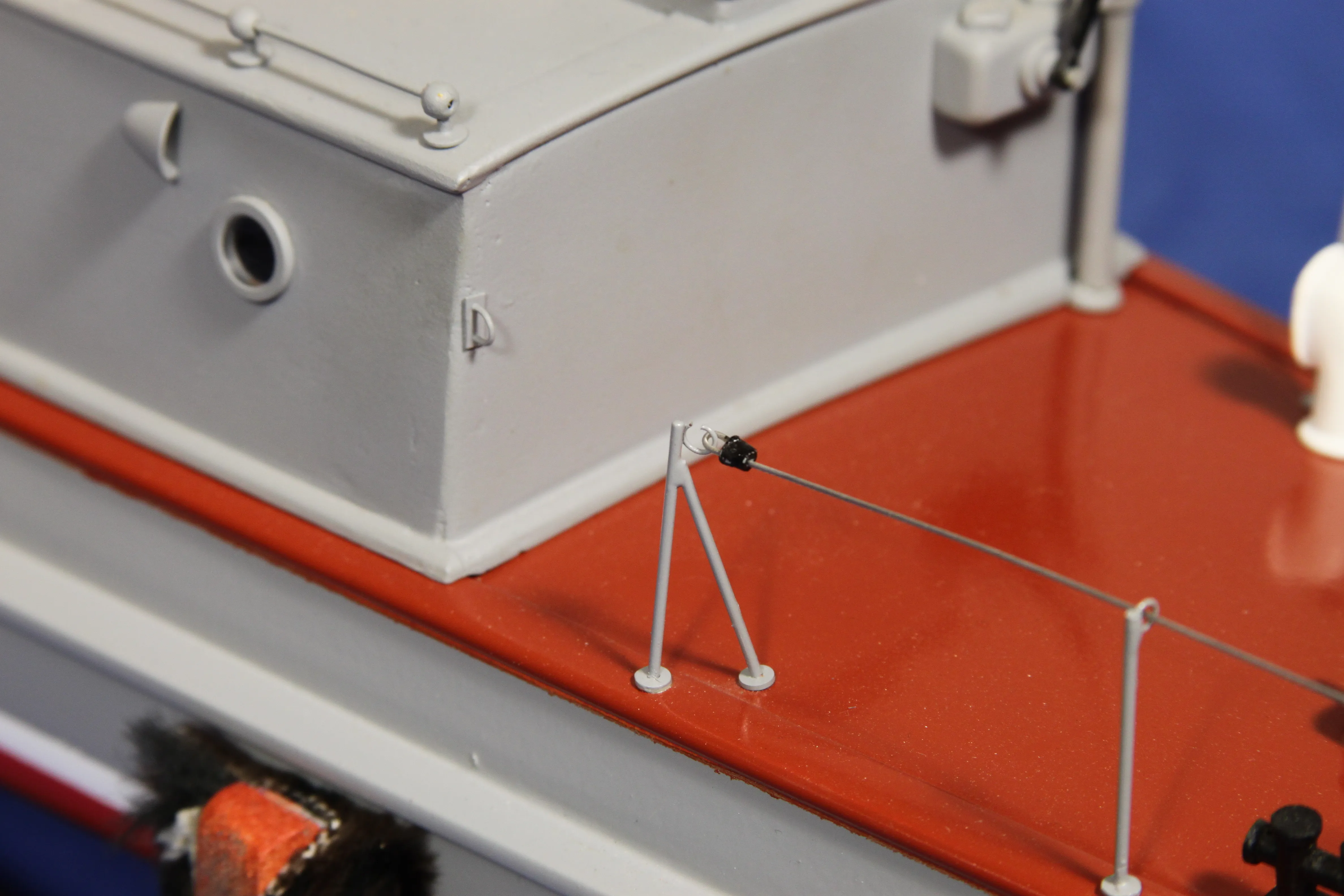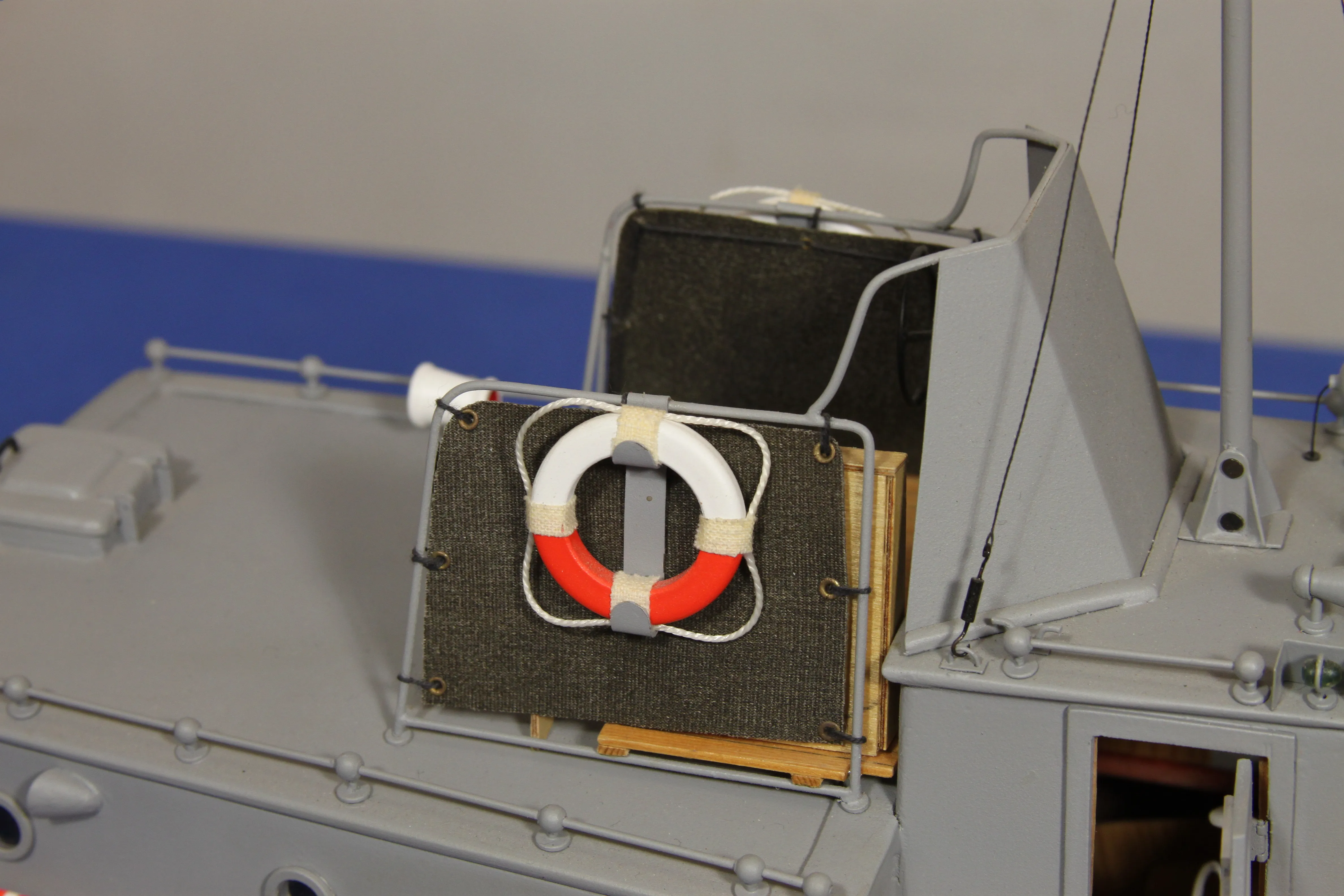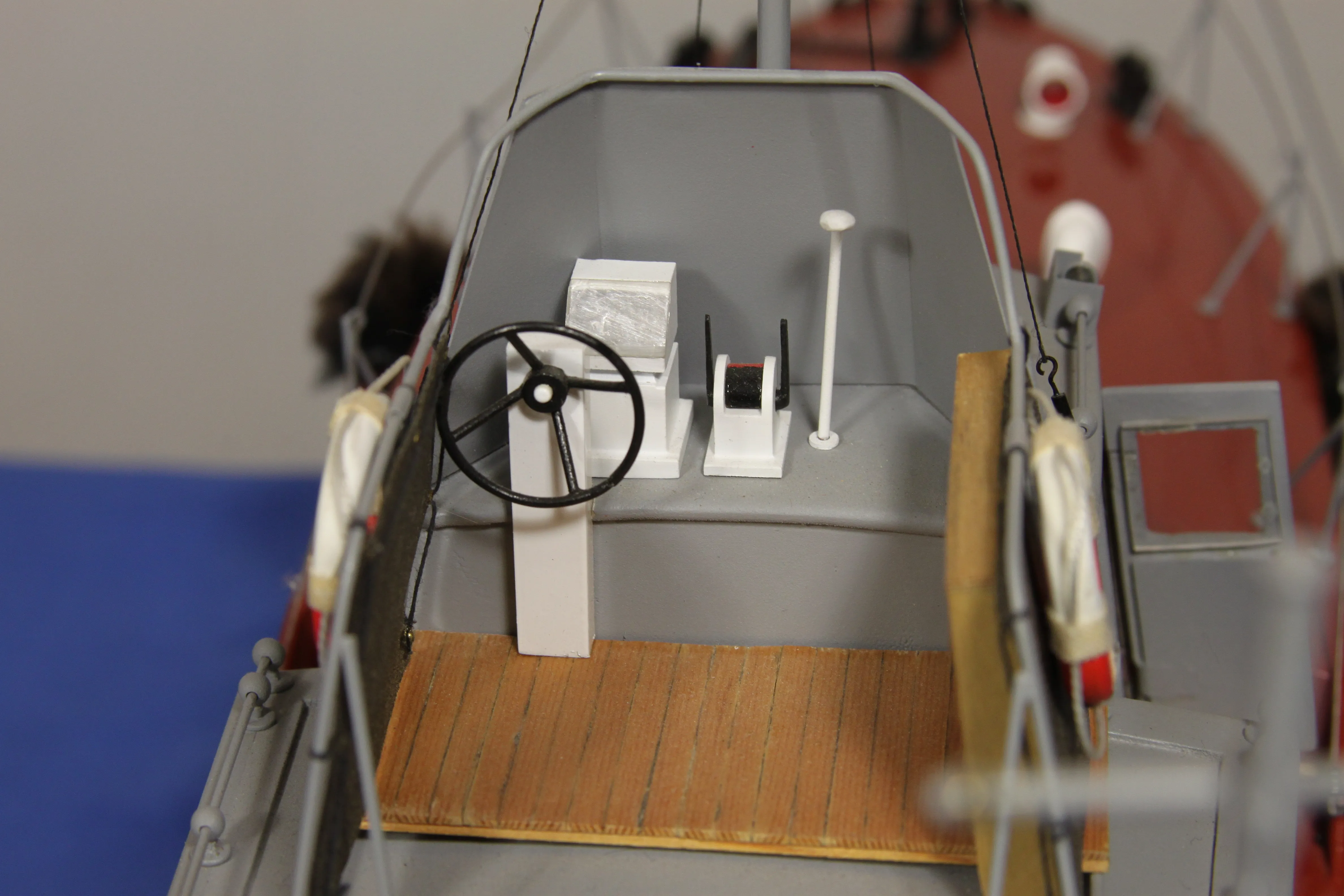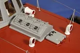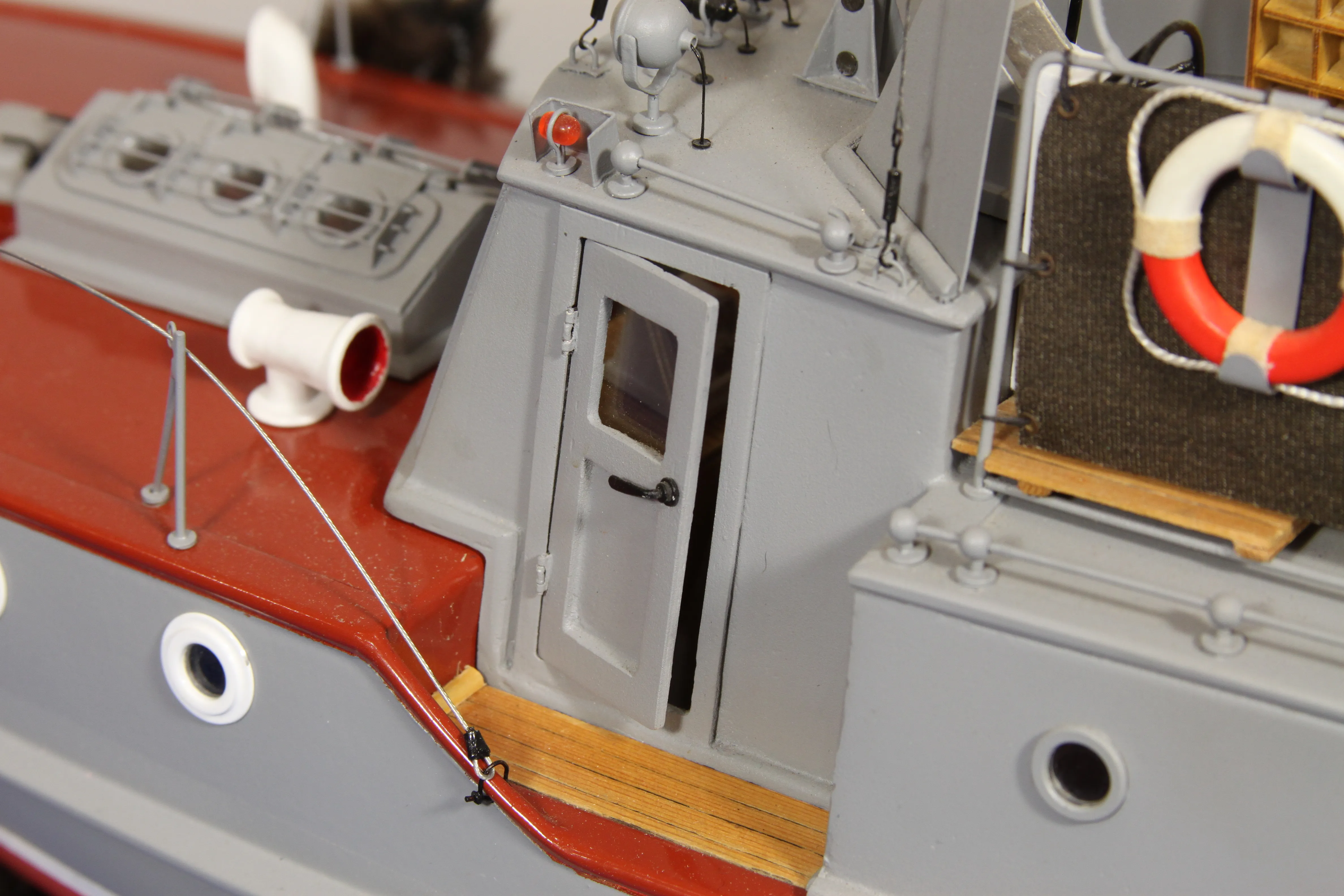 Модель изготовлена с нуля по чертежам из журнала "Моделист конструктор". Корпус, палуба и рубка сделаны из стеклопластика. Люка выдавлены из меди, леерные ограждения из проволоки, якорь из текстолита, иллюминаторы выточены из дюралюминия, фара-прожектор из латуни и оргстекла, компас из текстолита и оргстекла. Модель покрашена красками фирмы "Sikkens". Масштаб 1:23.