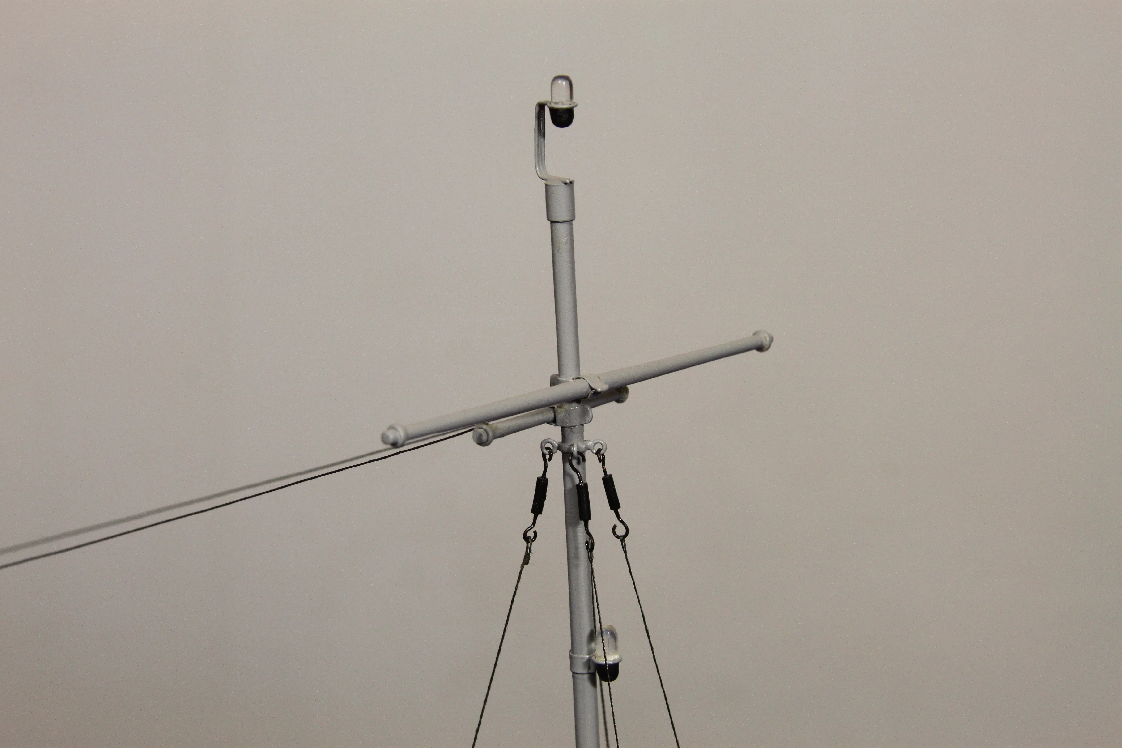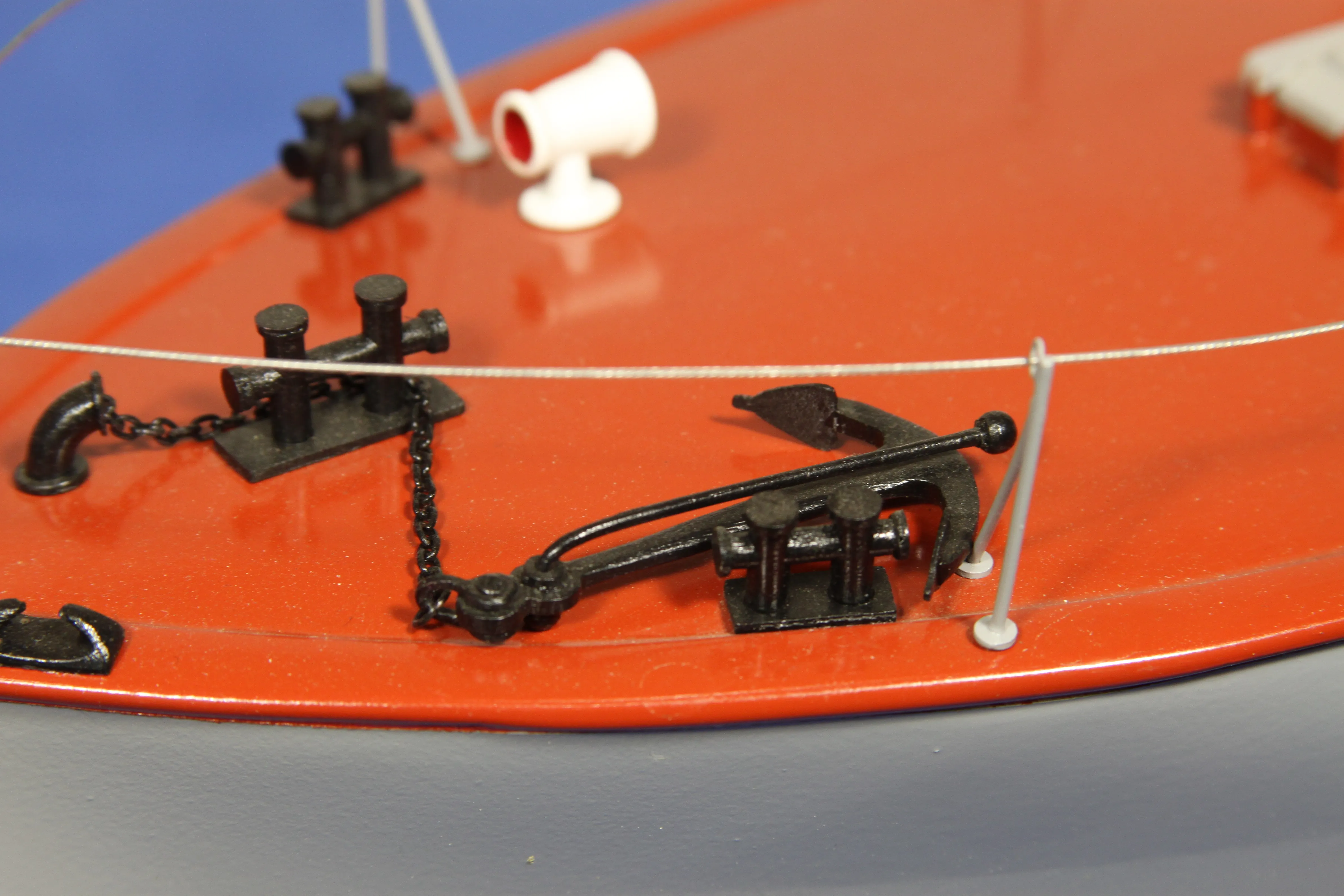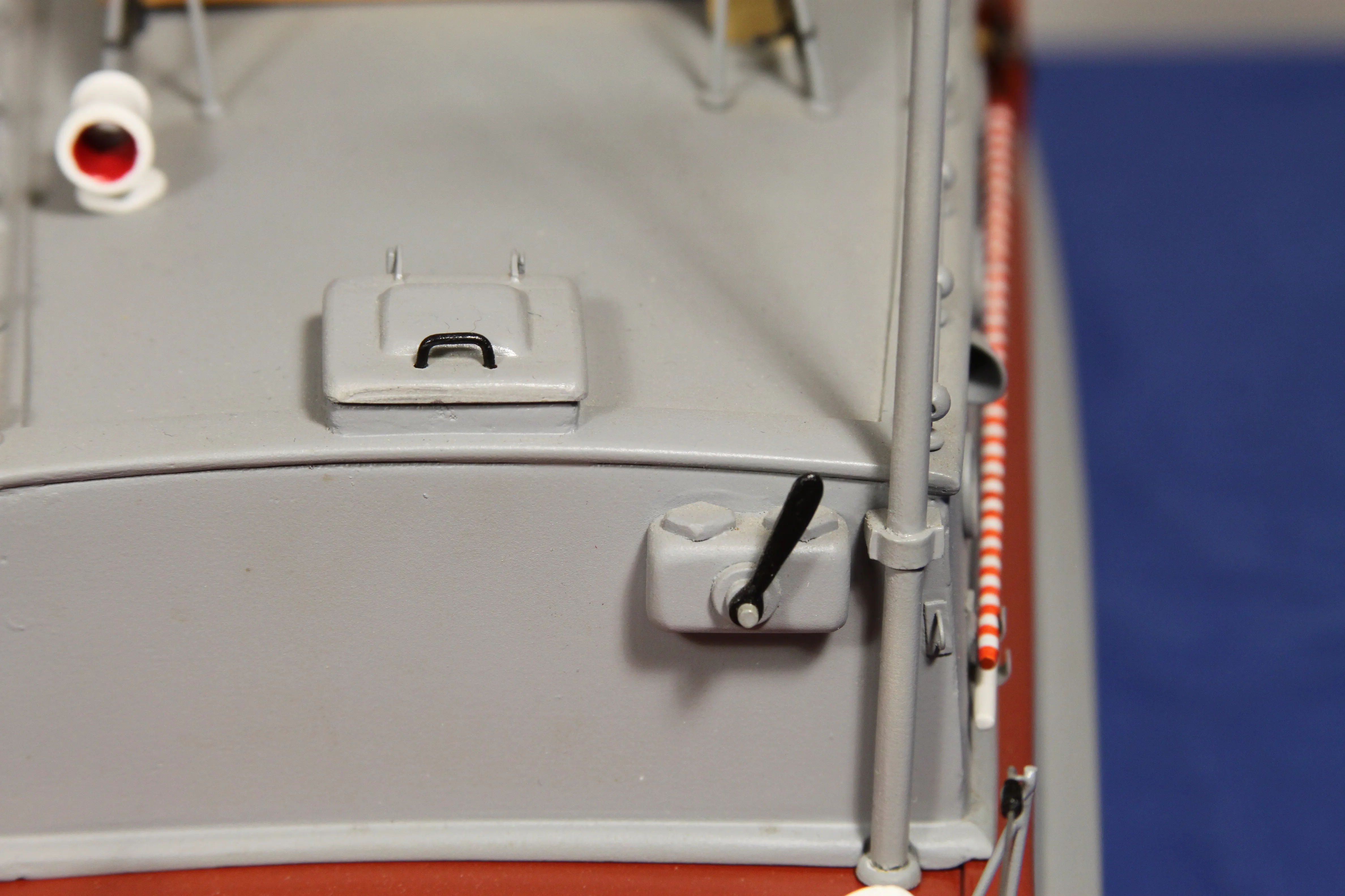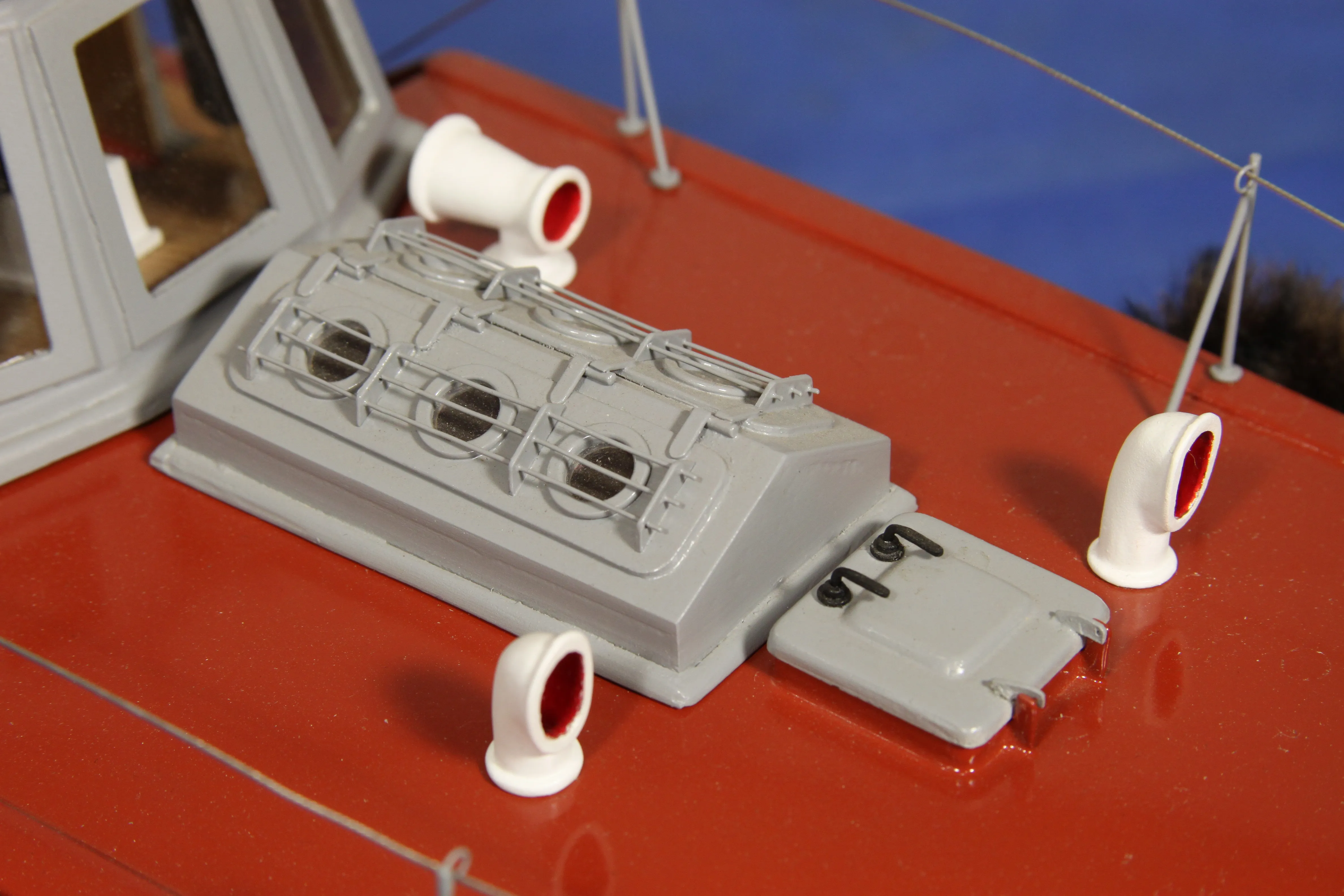 Модель изготовлена с нуля по чертежам из журнала "Моделист конструктор". Корпус, палуба и рубка сделаны из стеклопластика. Люка выдавлены из меди, леерные ограждения из проволоки, якорь из текстолита, иллюминаторы выточены из дюралюминия, фара-прожектор из латуни и оргстекла, компас из текстолита и оргстекла. Модель покрашена красками фирмы "Sikkens". Масштаб 1:23.