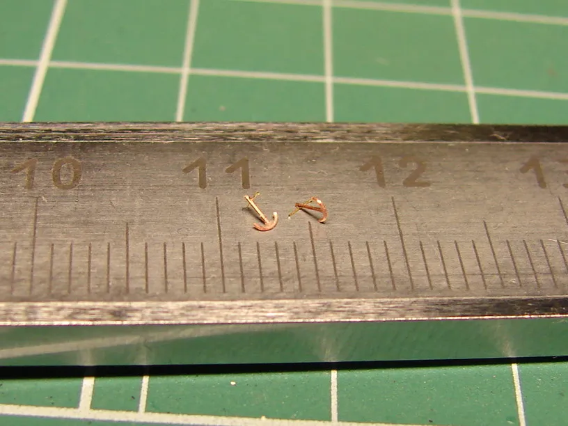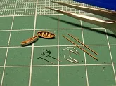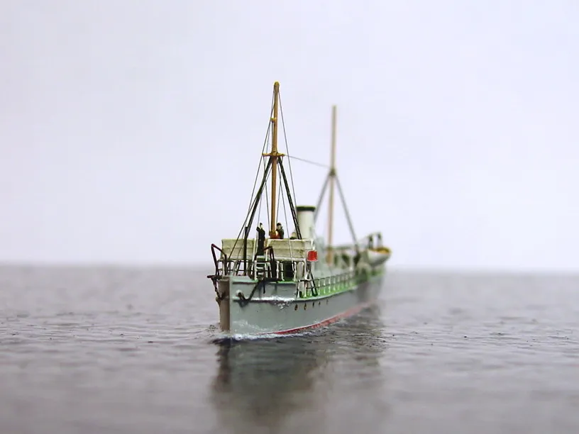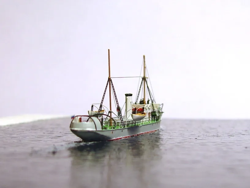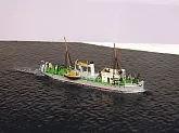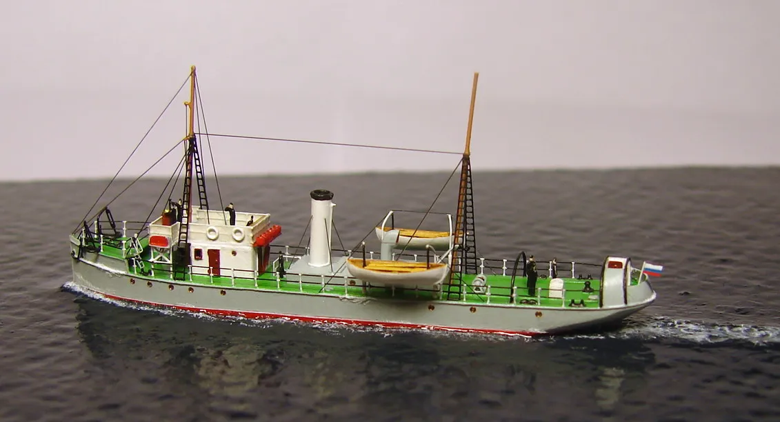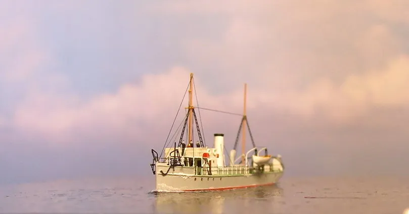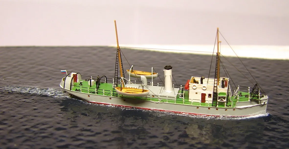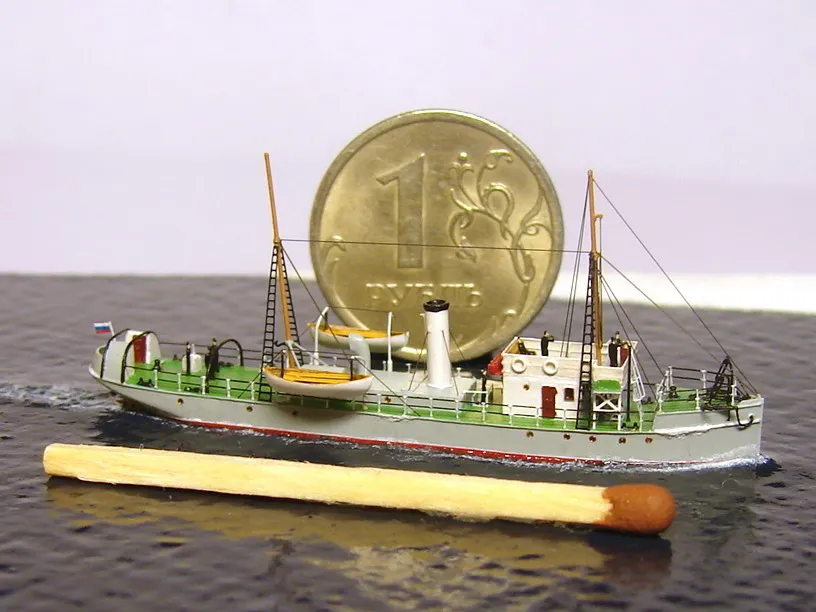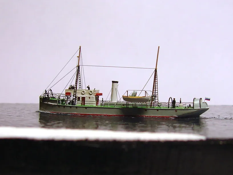 Из набора использовалось только четыре детали – корпус с отлитыми на нём надстройками, две шлюпки и вентиляционный раструб с небольшими доработками. Остальная деталировка сделана самостоятельно: якоря, якорные цепи, дымовая труба, кнехты, киповые планки, шпили, люки, буксирные дуги, мачты, пожарный инвентарь и вёдра, шлюпбалки и кранбалки, иллюминаторы, скамейка, компас, вёсла. Из фототравленных деталей на модели сделаны: две вьюшки, леерное ограждение, трапы, двери, окна ходовой рубки, ванты и тали, фигурки человечков. Фототравление использовалось от GMM и WEM. Флаг сделан из самодельной декали.