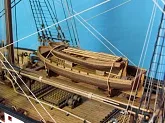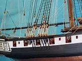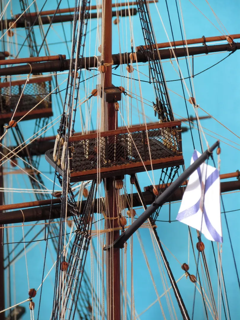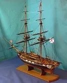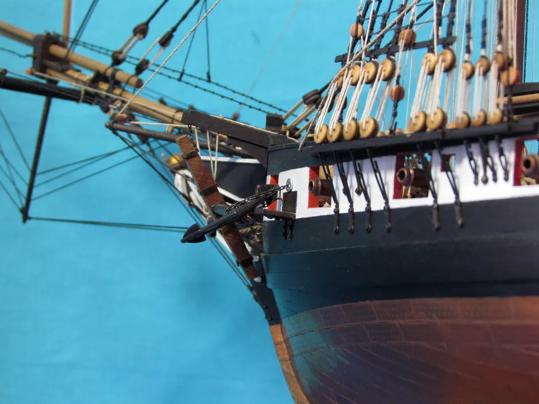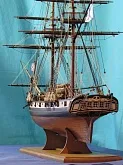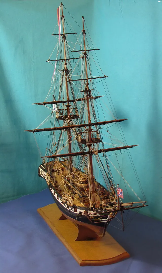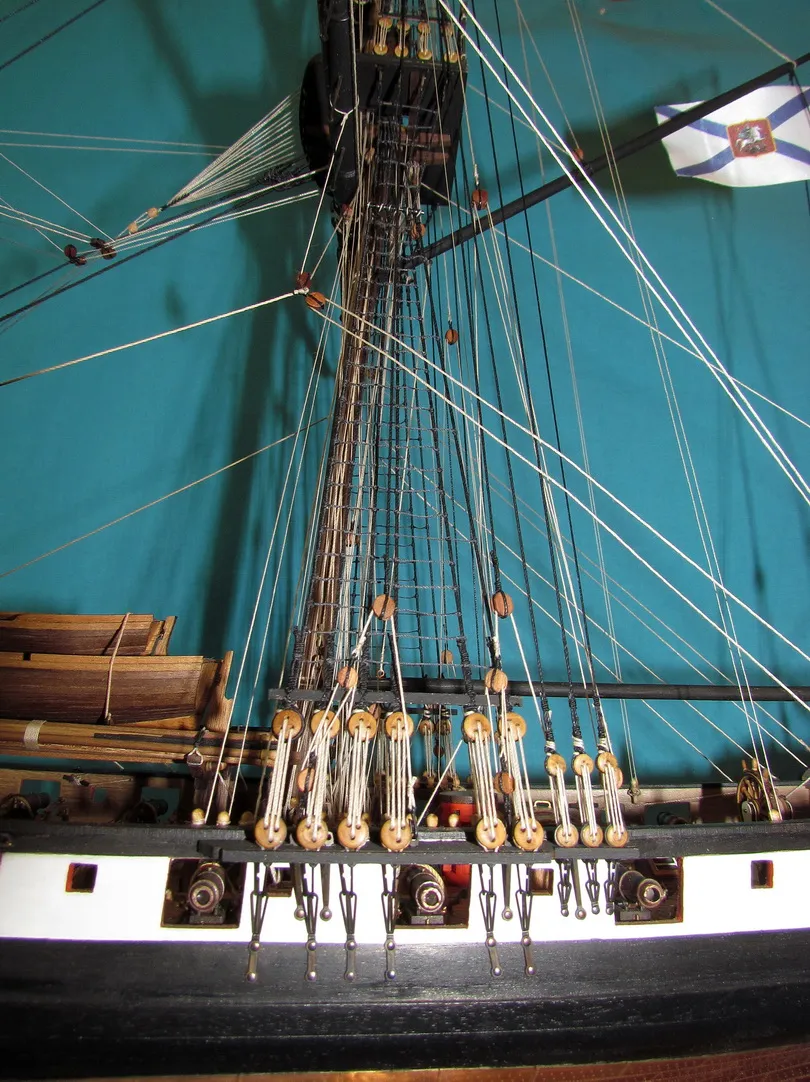 Моя первая деревянная модель. Модель выполнена из набора Амати в масштабе 1/64, глобальных переделок не планировалось, но некоторые доработки и переделки все же имели место. Штурвал и помпы сделаны заново, изготовлена якорная машинка, мусинги штагов плетеные, сделаны кольца для брюка в вингардах каронад, выполнена полная обвязка орудий, переразмерен такелаж, выполнен настил марсовых площадок и доработано ограждение марсов, на вантах установлена деревянная распорка и швиц-сарвень, выполнена клетневка вант и огонов. Во время изготовления изучал и применял информацию из таких книг как: Глотов "Изъяснение принадлежностей к Вооружению корабля", Ильин "Практическая морская артиллерия", Посьет "Вооружение военных судов".