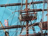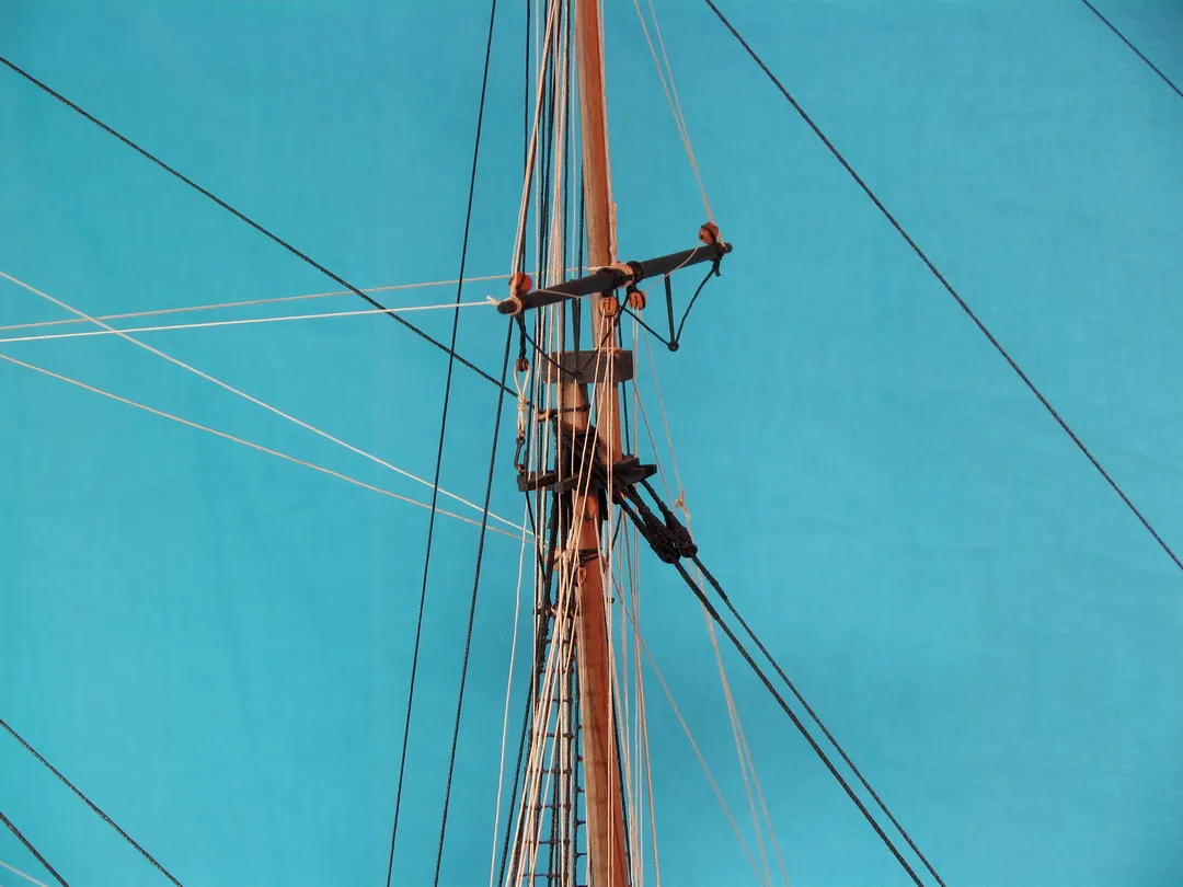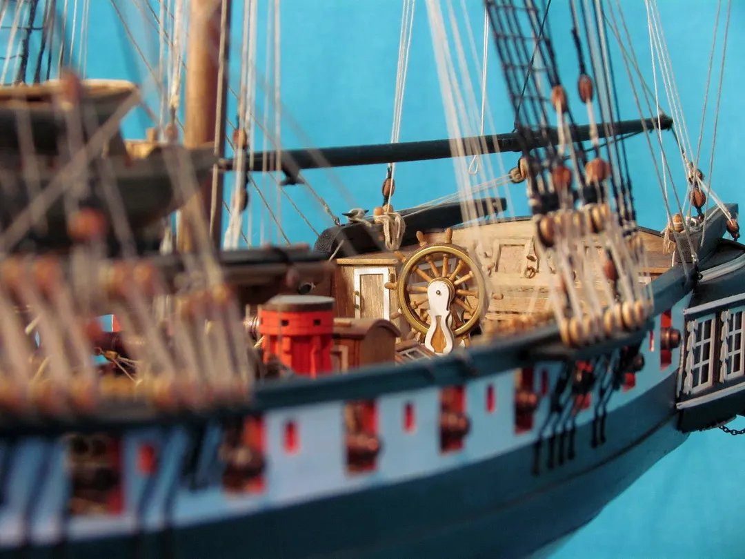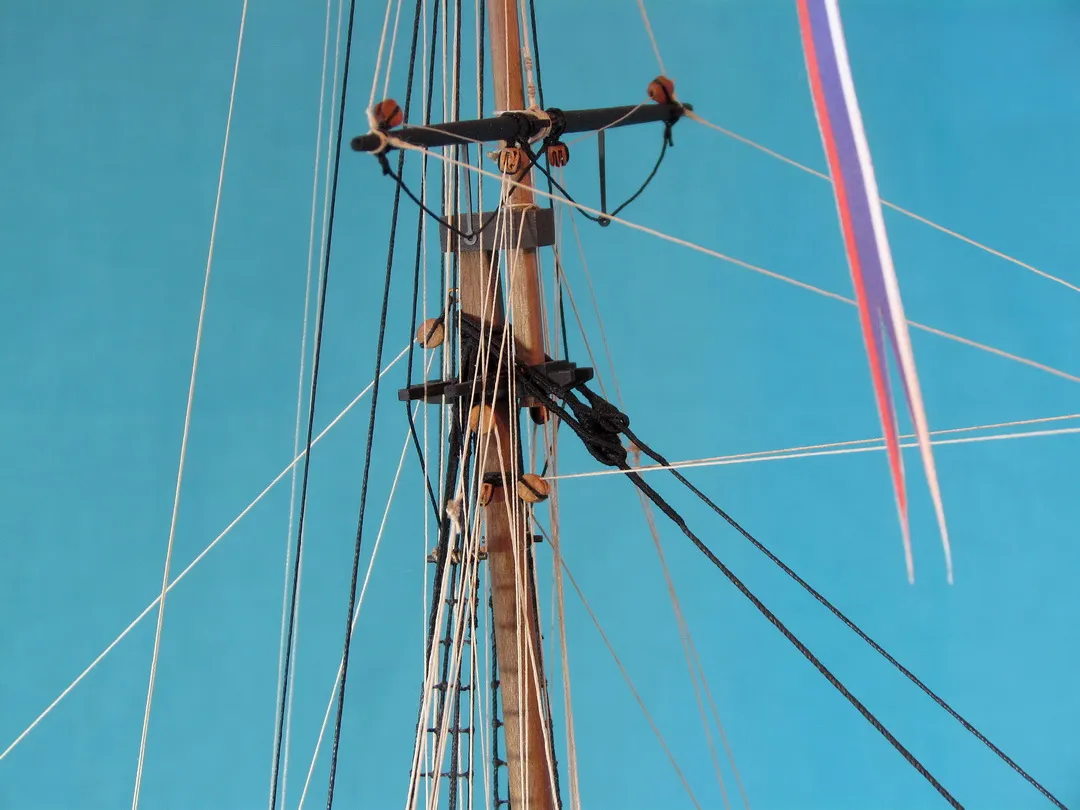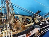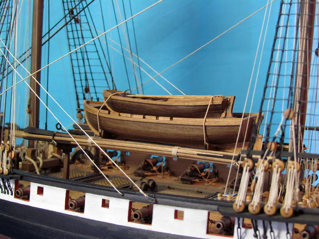 Моя первая деревянная модель. Модель выполнена из набора Амати в масштабе 1/64, глобальных переделок не планировалось, но некоторые доработки и переделки все же имели место. Штурвал и помпы сделаны заново, изготовлена якорная машинка, мусинги штагов плетеные, сделаны кольца для брюка в вингардах каронад, выполнена полная обвязка орудий, переразмерен такелаж, выполнен настил марсовых площадок и доработано ограждение марсов, на вантах установлена деревянная распорка и швиц-сарвень, выполнена клетневка вант и огонов. Во время изготовления изучал и применял информацию из таких книг как: Глотов "Изъяснение принадлежностей к Вооружению корабля", Ильин "Практическая морская артиллерия", Посьет "Вооружение военных судов".