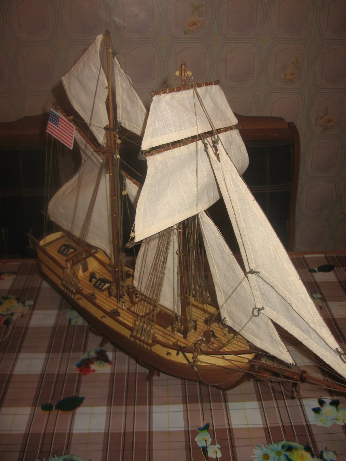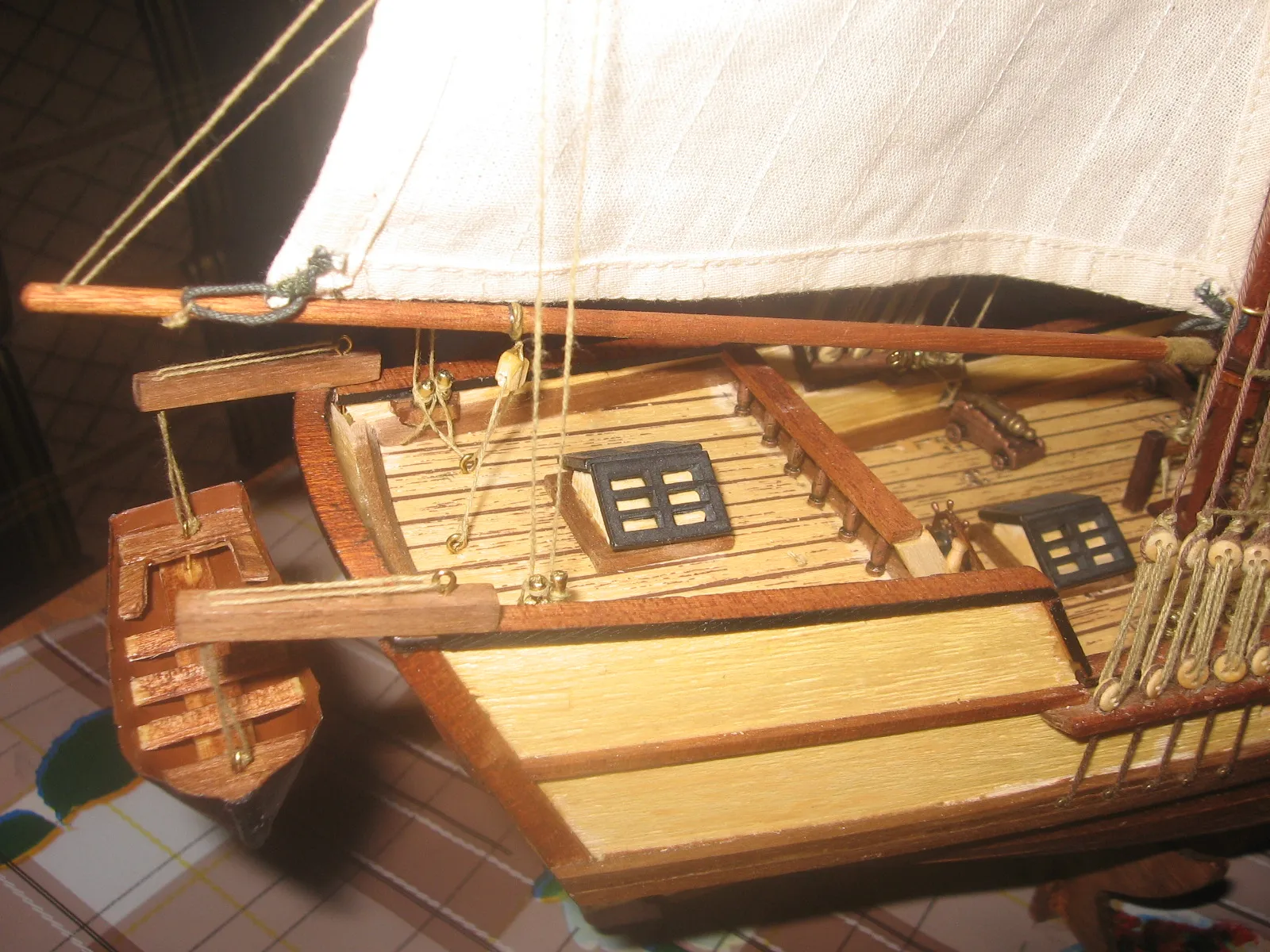 Это первая моя модель из набора. Модель фирмы "OcCre". Схема сборки представляет все основные этапы сборки модели на понятном для моделистов языке. Внёс небольшие изменения... Сделал трап из дерева, шток на якоре тоже из дерева, дверь в каюту сделал новую, шлюпку изготовил по принципу папье-маше, прошпаклевал палубу, чтобы более чётко выделить места разделения палубных досок, а прибивал палубные доски швейными булавками с плоской головкой, всё судно покрыл бесцветным пчелиным воском. Все эти изменения были внесены на основе знаний, полученных в результате общения на форуме "Верфь на столе"! С уважением Алексей Золотняков!