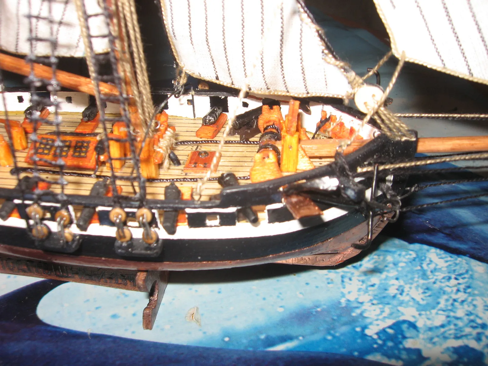 Модель строилась по чертежам бумажных кораблей фирмы SHIPWORKS, приобретённых в "Верфи на столе". При изготовлении использовал фанеру 3мм, шпон и др. Краски использовал акриловые. Днище покрыто медной лентой 6 мм, приобретённой в "Верфи на столе", места прибивания к днищу имитировал с помощью швейного колёсика для разметки ткани. С помощью ручной горелки изготовил металлический якорь. И впервые выливал пушки.