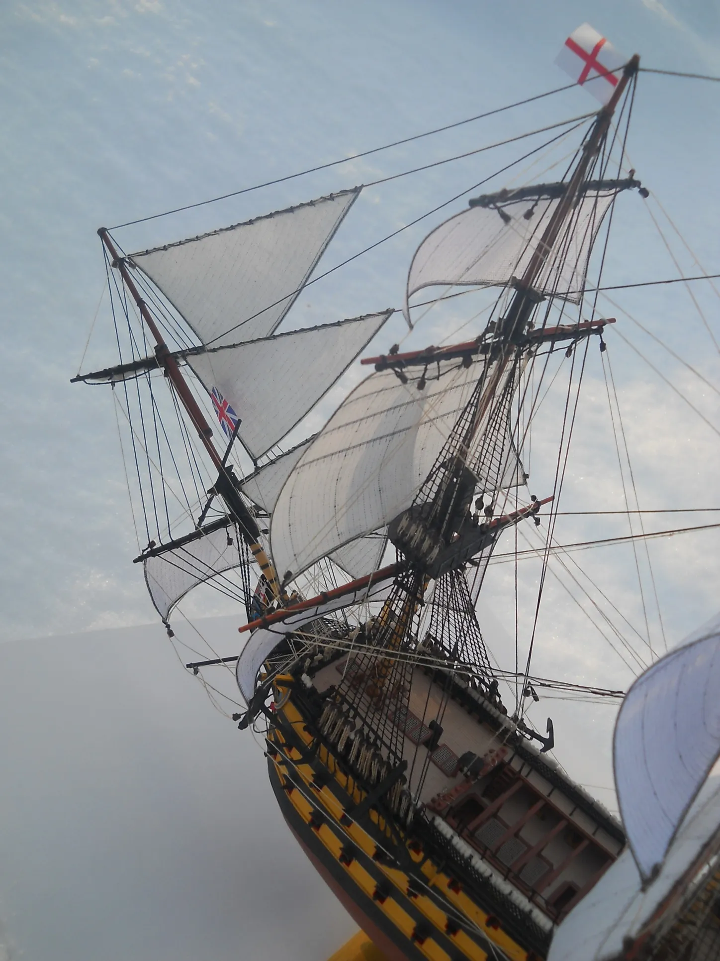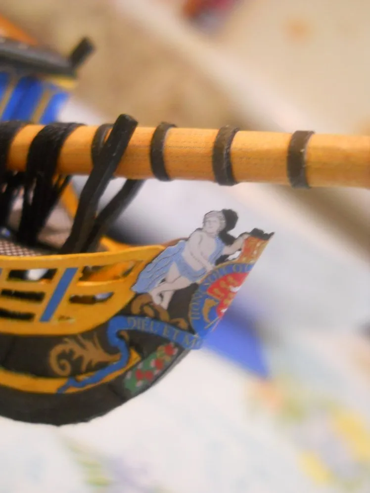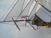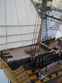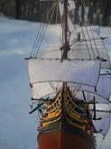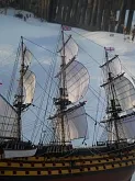 модель делалась из журнала "Maly Modelarz (2005.10-11-12)" с доработками: про грунтовано, прошпаклевано и покрашено днище корпуса. доработан такелаж корабля. паруса: пропитанная клеем пва ткань, распечатанные на принтере. юферсы и блоки сделаны из пластика. рангоут бумажный со вставленной стальной проволокой внутрь мачт и рей.