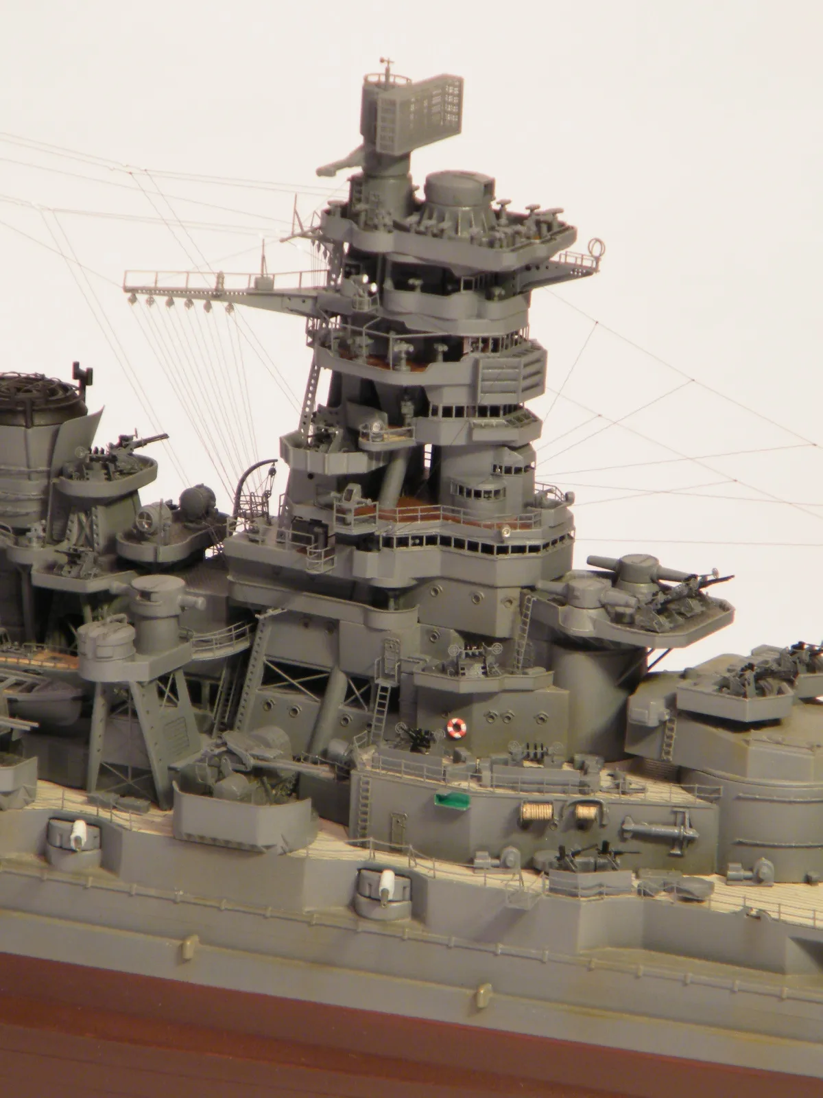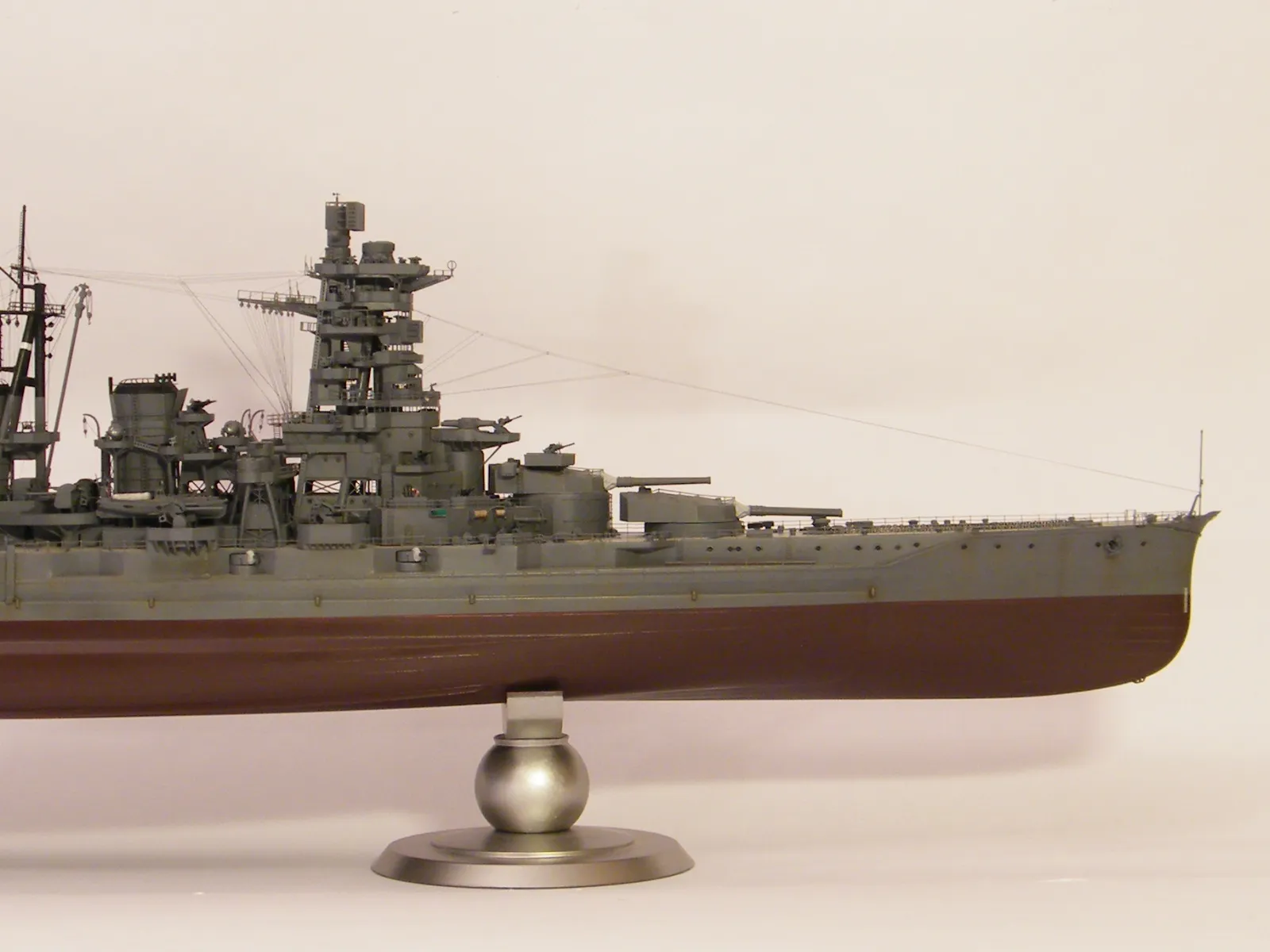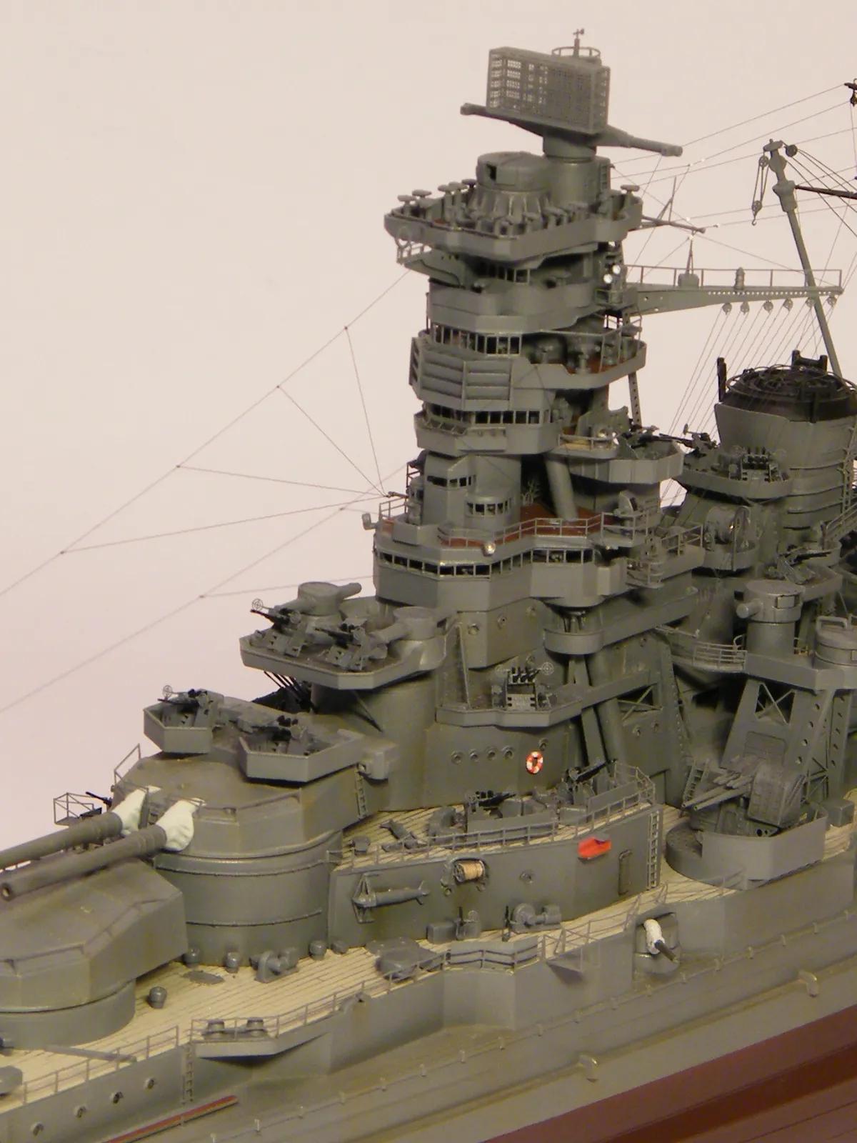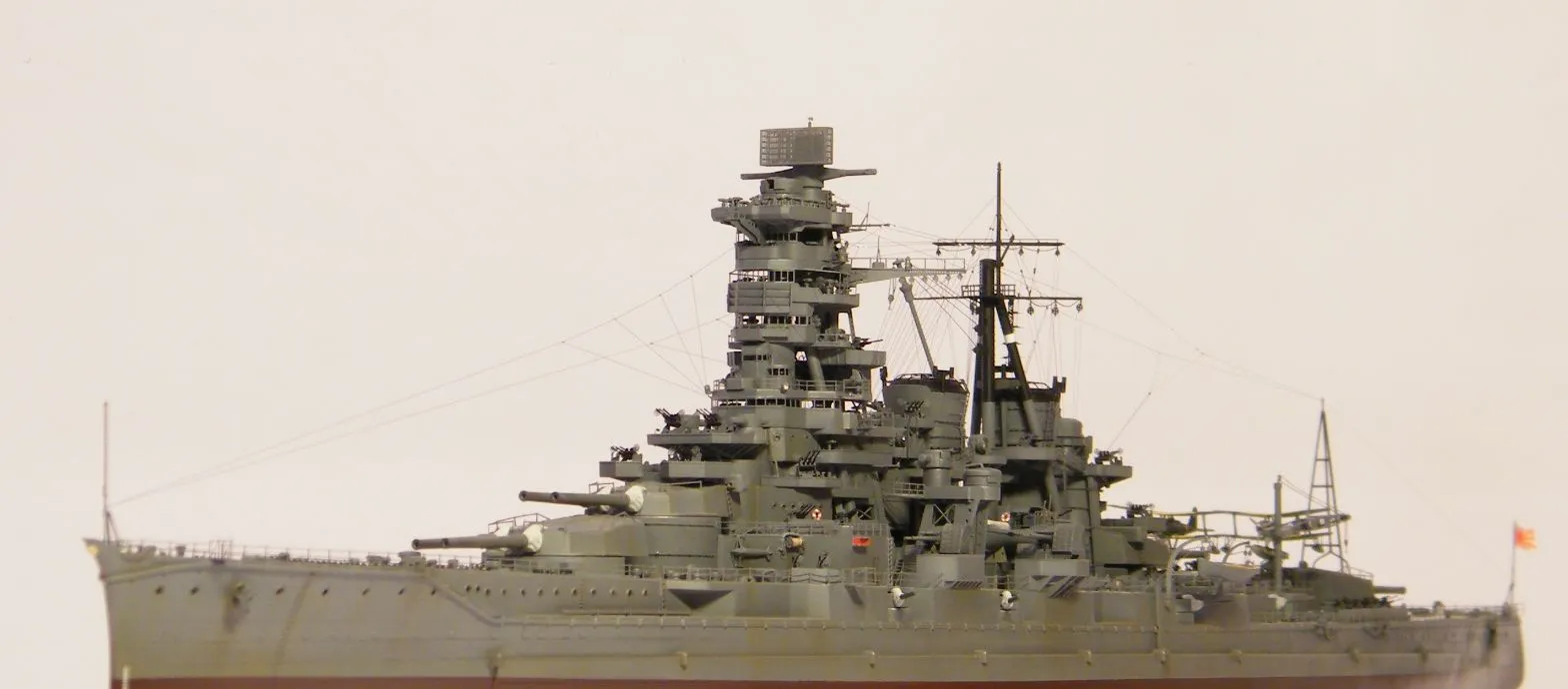 Пластиковая модель фирмы Fujimi, масштаб 1:350. Готовая модель повторяет конфигурацию корабля на момент гибели в 1944-м году. Использовался набор дополнительного травления Fujimi, некоторые пластиковые и травленые элементы других производителей. Часть рангоута, флагшток и гюйсшток заменены на металлические трубочки и стержни. Исправлена форма казематов. Немасштабные установки 127мм зениток заменены на травленые фирмы Voyager, 25мм зенитки заменены на травленку LionRoar. Стволы ГК, 152мм и 127мм - заменены на точеные . Такелаж - нитка от бантика. Окраска акрил Тамии, линейка "IJN" цветов. Попытался изобразить старение окраски - линкор использовался во время войны очень активно, и на момент гибели давно был в море: Корабль был торпедирован на переходе из Брунея в метрополию после катастрофического для японцев сражения в заливе Лейте.