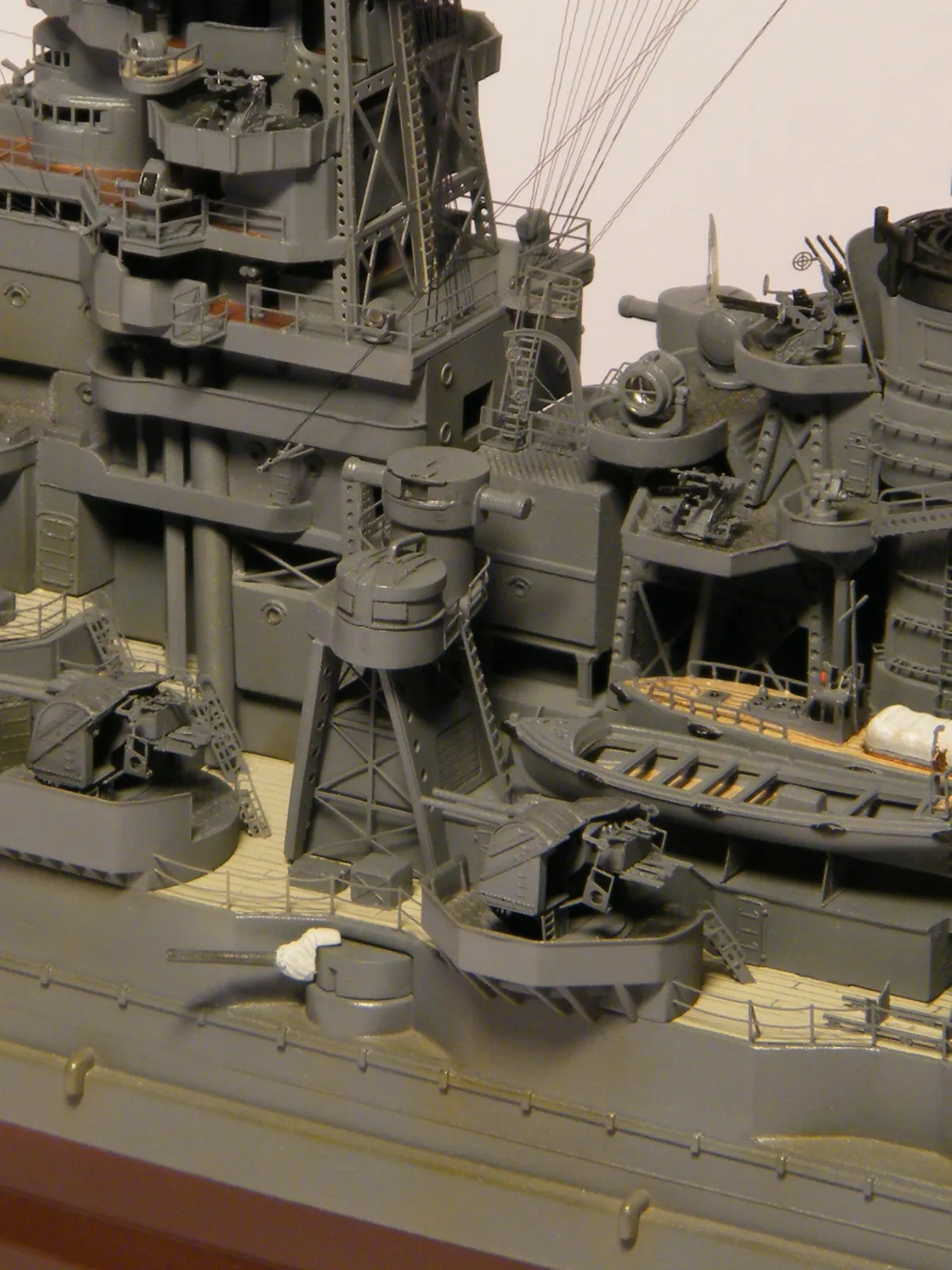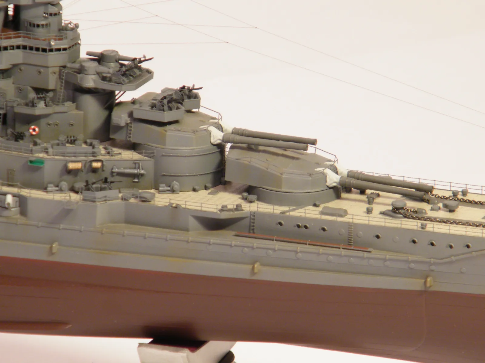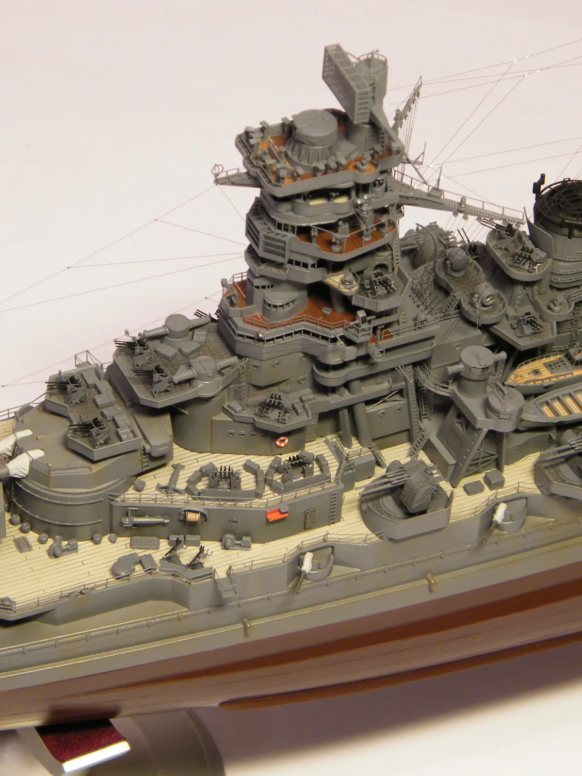 Пластиковая модель фирмы Fujimi, масштаб 1:350. Готовая модель повторяет конфигурацию корабля на момент гибели в 1944-м году. Использовался набор дополнительного травления Fujimi, некоторые пластиковые и травленые элементы других производителей. Часть рангоута, флагшток и гюйсшток заменены на металлические трубочки и стержни. Исправлена форма казематов. Немасштабные установки 127мм зениток заменены на травленые фирмы Voyager, 25мм зенитки заменены на травленку LionRoar. Стволы ГК, 152мм и 127мм - заменены на точеные . Такелаж - нитка от бантика. Окраска акрил Тамии, линейка "IJN" цветов. Попытался изобразить старение окраски - линкор использовался во время войны очень активно, и на момент гибели давно был в море: Корабль был торпедирован на переходе из Брунея в метрополию после катастрофического для японцев сражения в заливе Лейте.