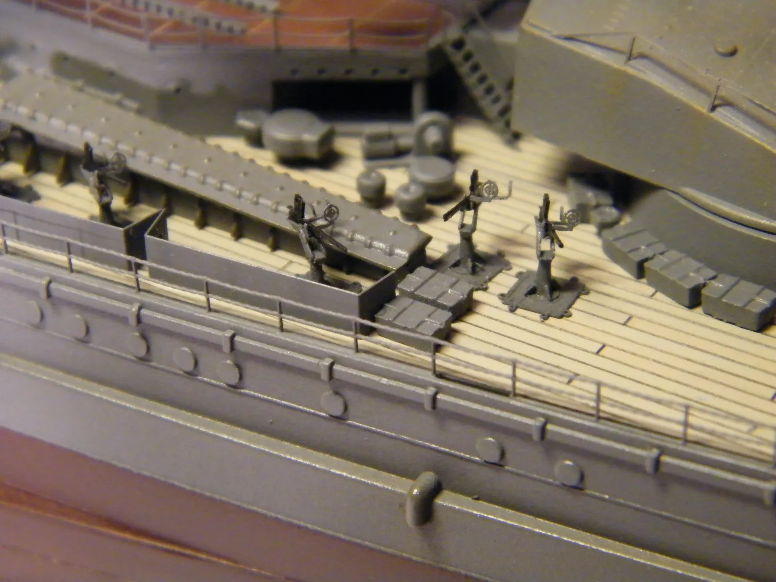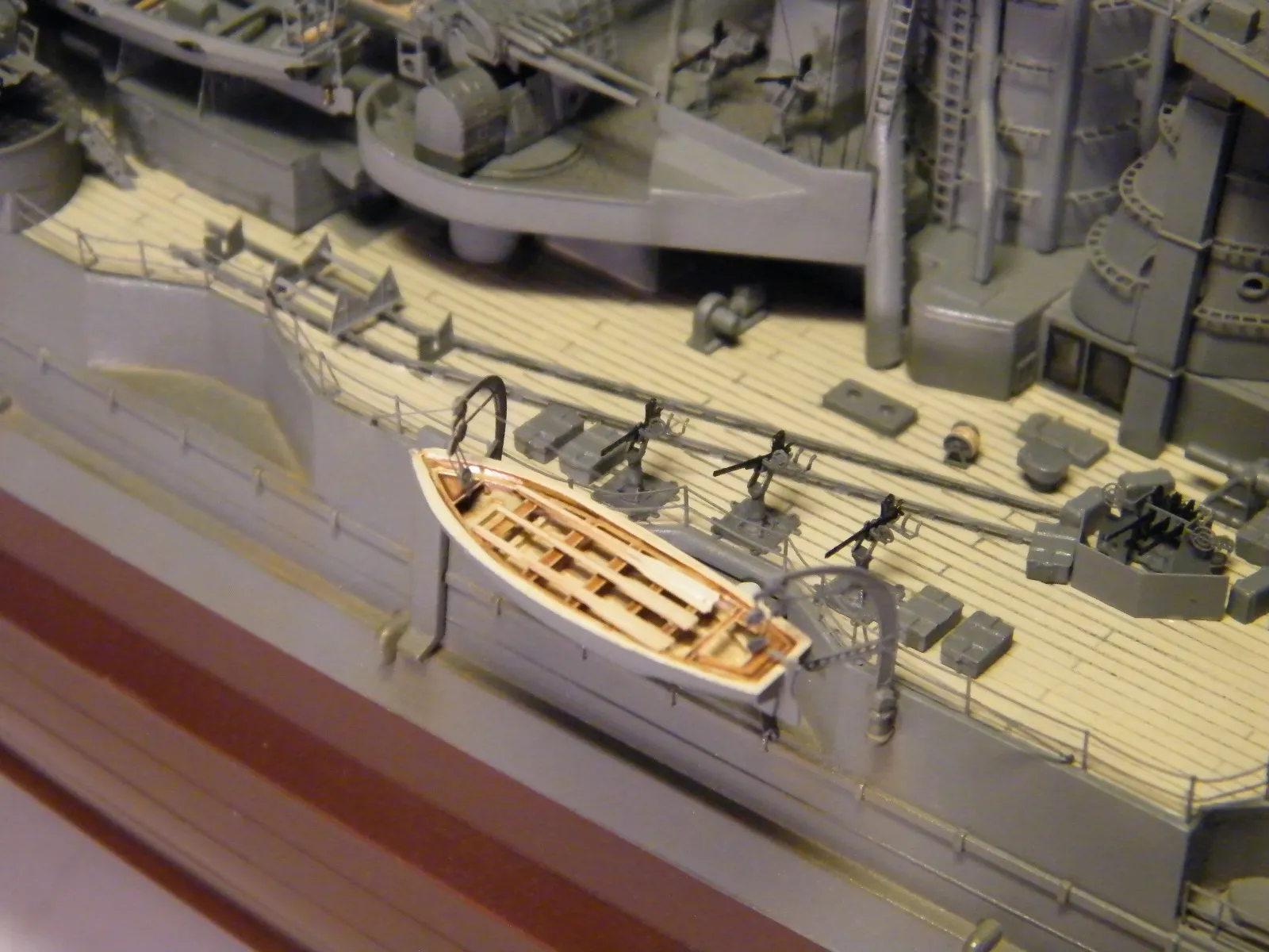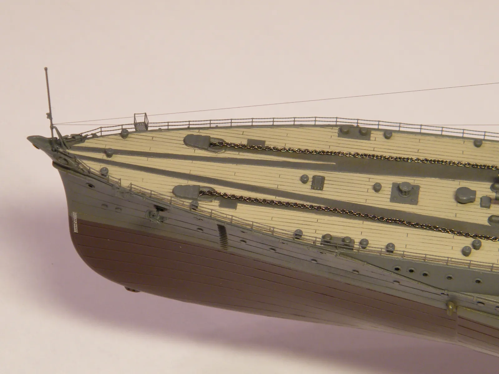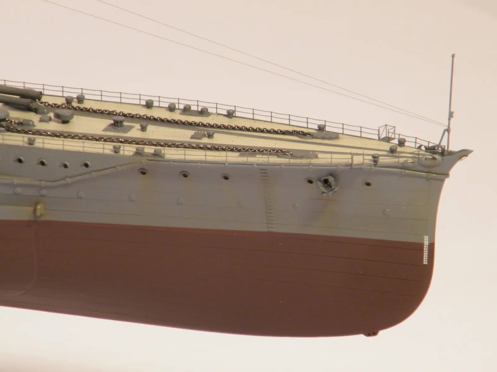 Пластиковая модель фирмы Fujimi, масштаб 1:350. Готовая модель повторяет конфигурацию корабля на момент гибели в 1944-м году. Использовался набор дополнительного травления Fujimi, некоторые пластиковые и травленые элементы других производителей. Часть рангоута, флагшток и гюйсшток заменены на металлические трубочки и стержни. Исправлена форма казематов. Немасштабные установки 127мм зениток заменены на травленые фирмы Voyager, 25мм зенитки заменены на травленку LionRoar. Стволы ГК, 152мм и 127мм - заменены на точеные . Такелаж - нитка от бантика. Окраска акрил Тамии, линейка "IJN" цветов. Попытался изобразить старение окраски - линкор использовался во время войны очень активно, и на момент гибели давно был в море: Корабль был торпедирован на переходе из Брунея в метрополию после катастрофического для японцев сражения в заливе Лейте.