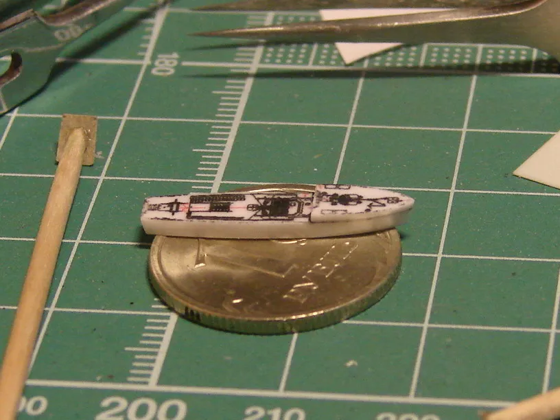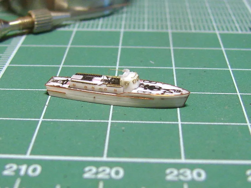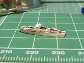 Модель изготовлена в масштабе 1/700 самостоятельно, из белого полистирола и окрашена кистью, водно-растворимыми красками АКАН. Мелкая деталировка изготавливалась из пластика, проволоки и пропитанной супер-клеем бумаги. Из фабричных деталей использовалось фототравление от GMM и WEM: леера, окна ходовой рубки, фигурки моряков. Флаги из декалей необходимого размера.