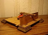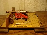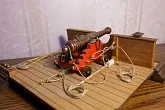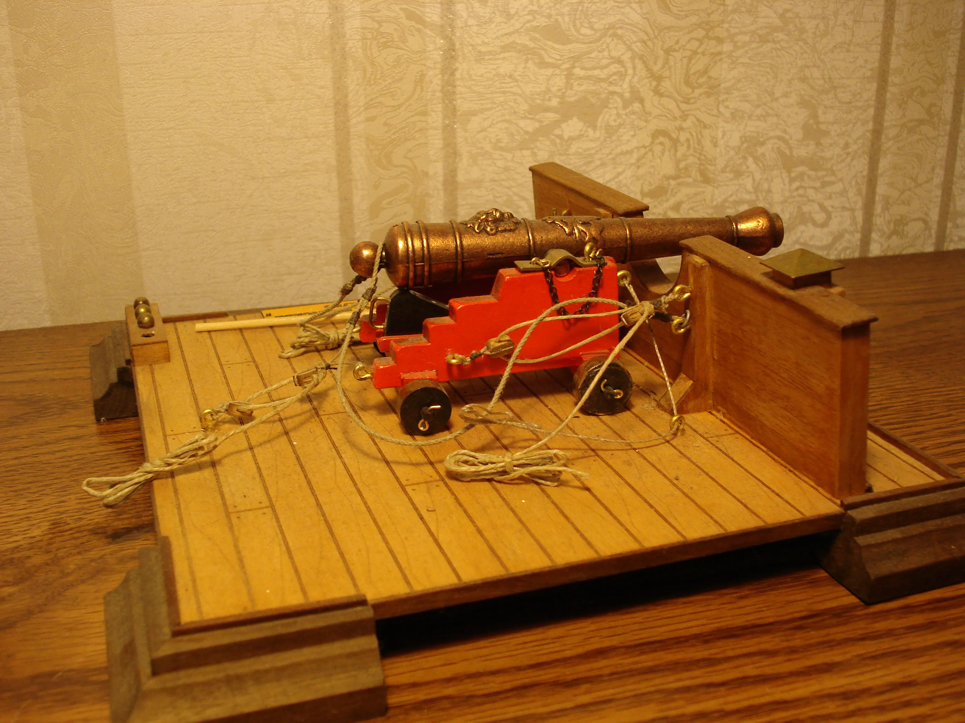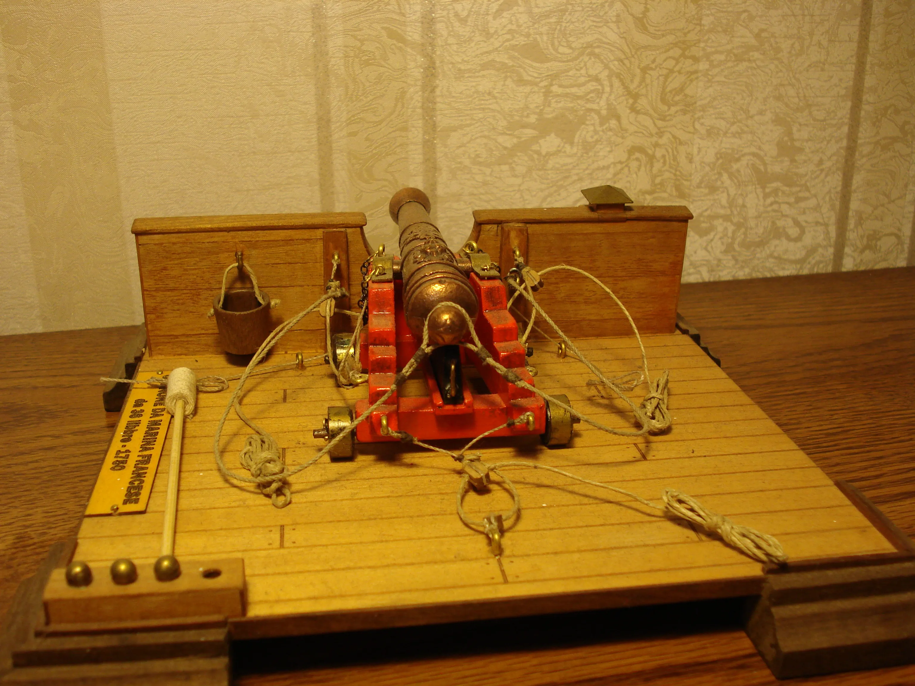 Обшивка фрагмента борта выполнена вразбежку в три доски, Вырез в борту облицован отдельными элементами "как делают бочки", Борт установлен с наклоном - так мне представляется более естественно, чем на фото в наборе. Колеса и элементы "блок-трос" - подвижные. Подъемный клин пушки - подвижный.