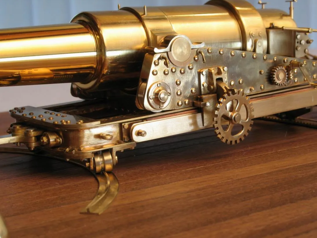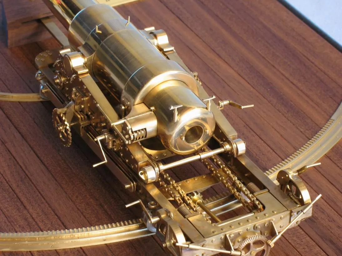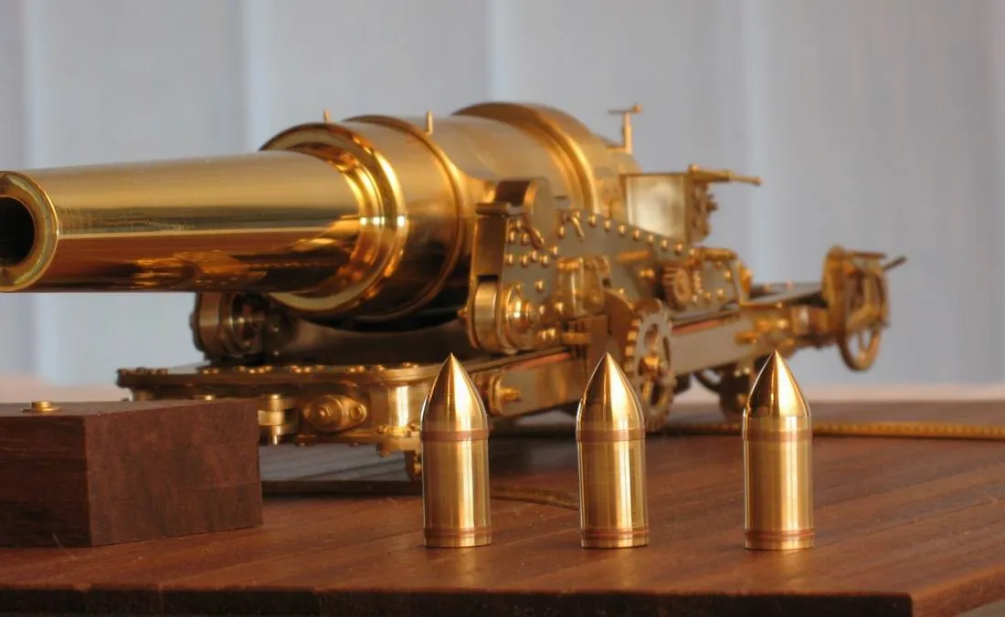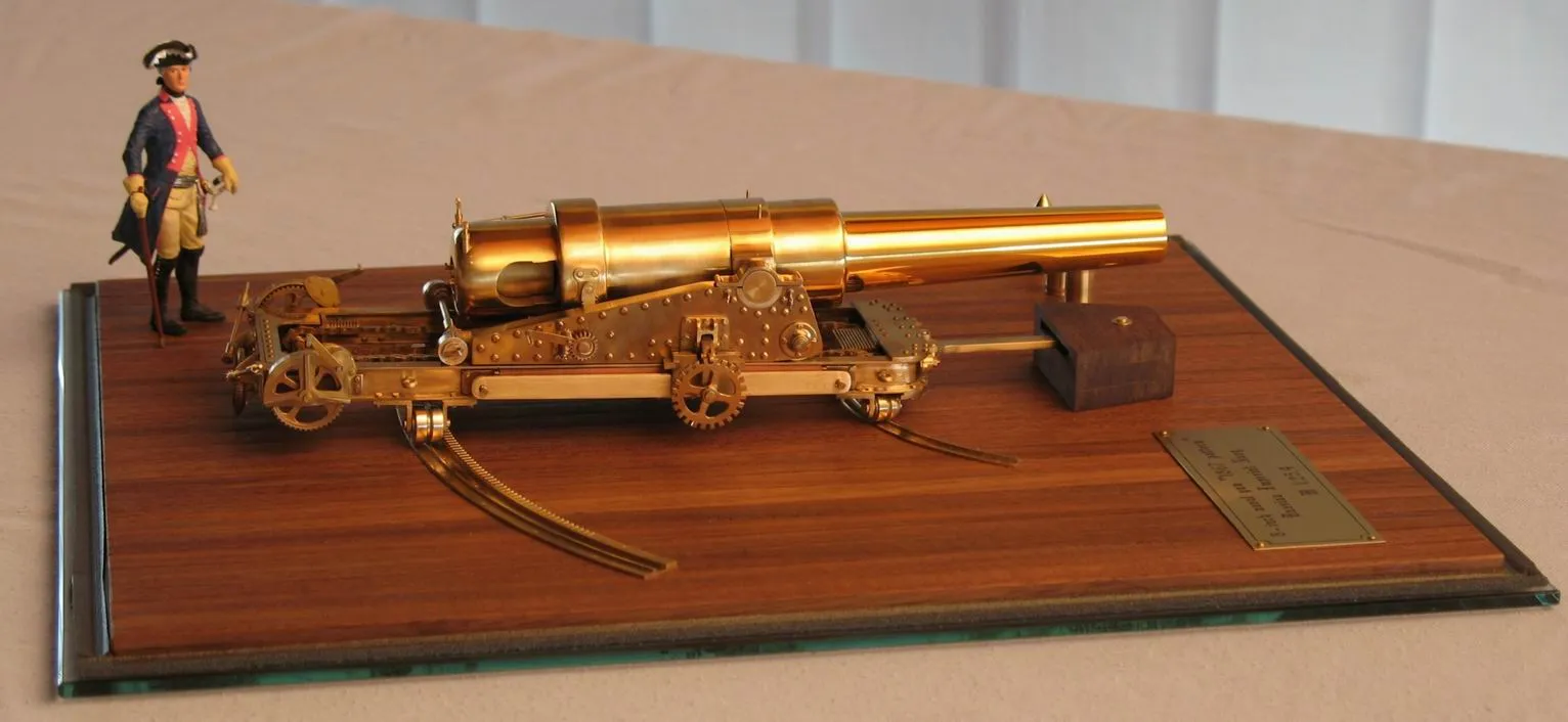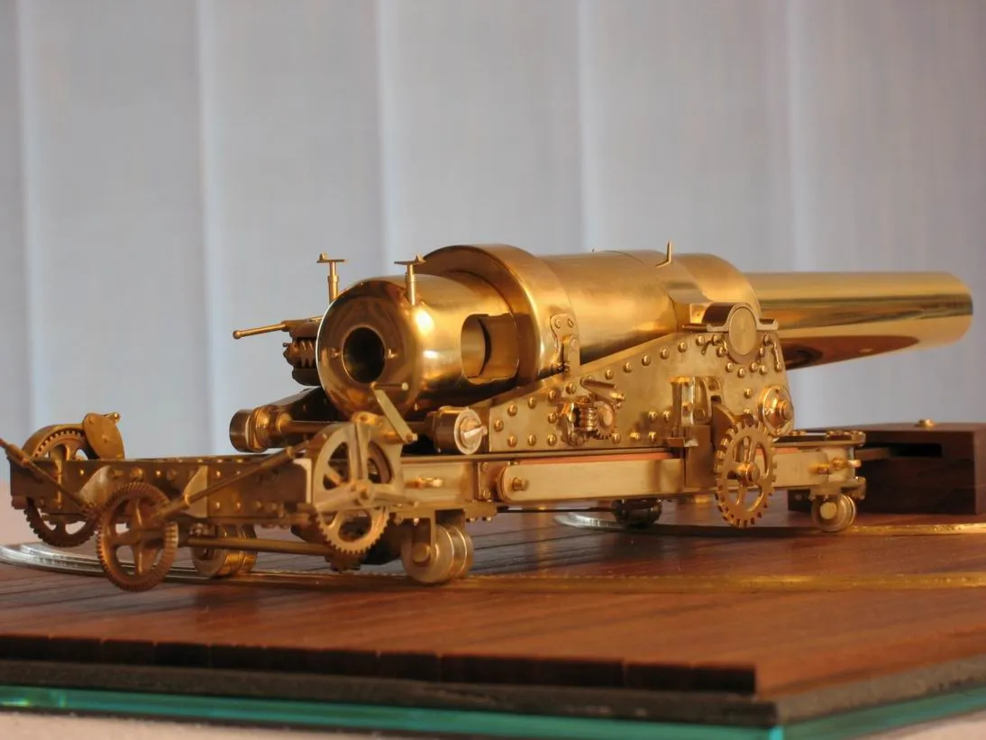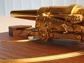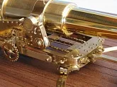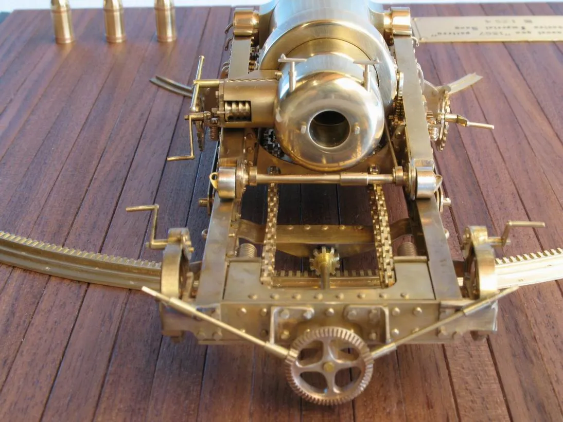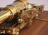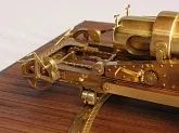 8-дюймовое орудие образца 1867 года на корабельном станке Скотта. Устанавливались на броненосных кораблях и фрегатах русского флота. Модель из латуни, частично с покрытием из серебра или меди. Все детали изготовлены самостоятельно по чертежам из журнала "Морской сборник" 18хх года, а также по книгам для артиллеристов и инженеров 19 века. Конструкция, по-возможности, сохранена оригинальной - практически отсутсвует пайка, только клепка (1-0.5мм) и болты(М1.2 М1 М0.8). Фигура человека - покупная и не соответствует эпохе, но изготовлена в том же масштабе 1:25.