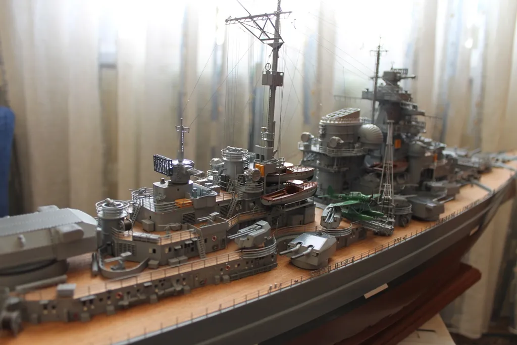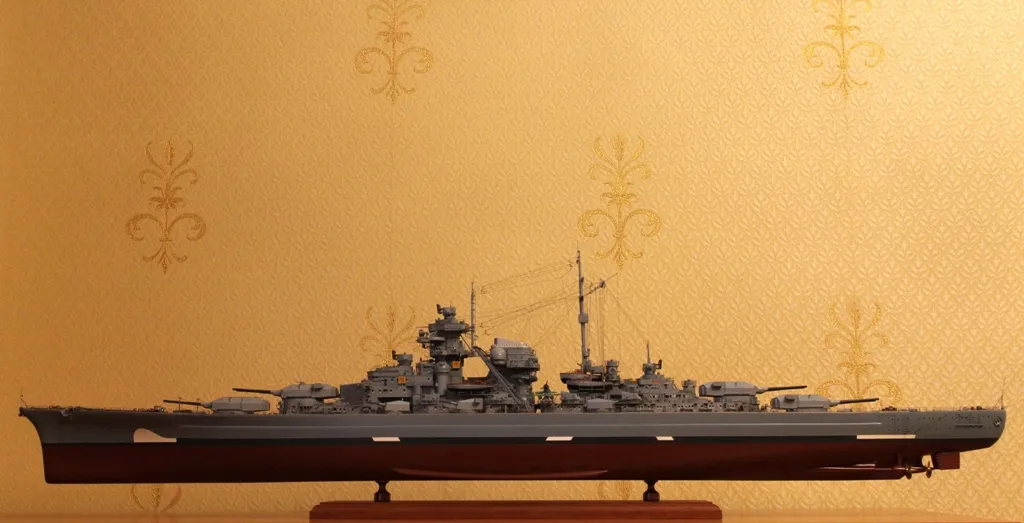 Проект модели линкора «Бисмарк» выполнен в масштабе 1:200, итальянской фирмой Amati на основе оригинальных чертежей, в мельчайших подробностях и с высоким уровнем достоверности каждого элемента. Размеры: длина 1250 мм; ширина 180 мм;