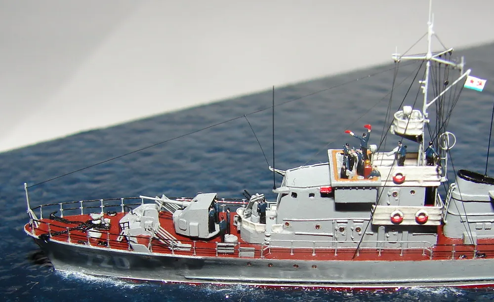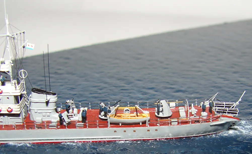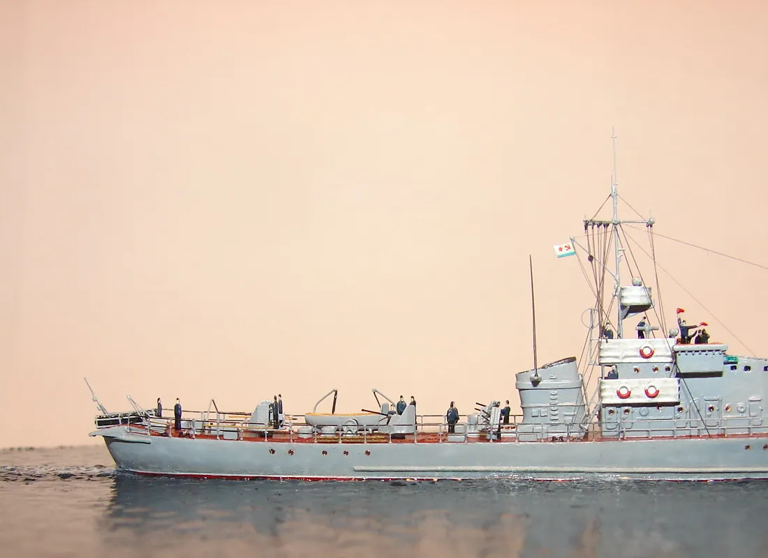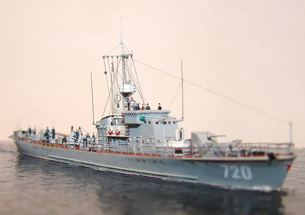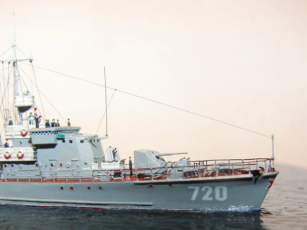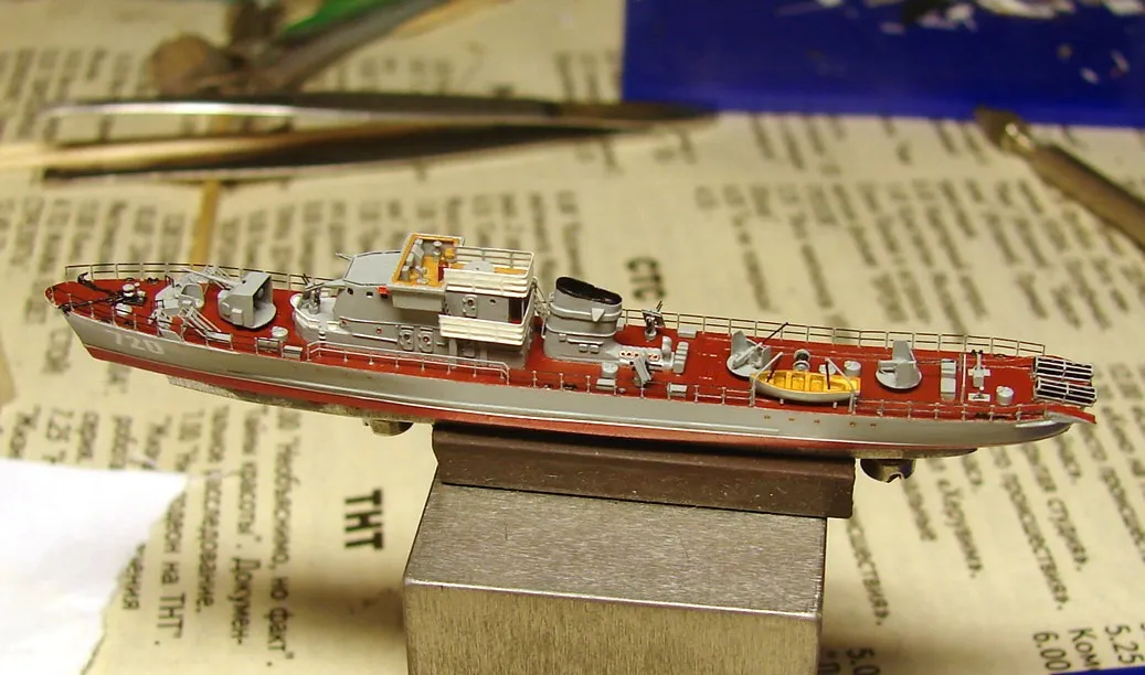 Модель построена в масштабе 1/700 практически "с нуля". За основу был взят набор от фирмы Комбриг, но так как все детали в наборе были "кривые" или с браком, проще было всё сделать самостоятельно. Модель строилась по чертежам и фотографиям из двух монографий посвящённых кораблям этого проекта и материалам из Интернета . Из набора взяты только три детали, которые более-менее можно было использовать в постройке модели: корпус, ходовая рубка, дымовая труба /на фотографиях процесса постройки они выглядят серо-зелёными/. Так как корпус тонкий и длинный, его повело «бананом». Для выравнивания, к нижней части корпуса было прикреплено металлическое ребро жесткости на двух винтиках с гайками. Вся остальная деталировка изготавливалась самостоятельно из пластика, проволоки, элементов разных фототравленых деталей и пропитанной супер-клеем бумаги. Такелаж изготовлен из тянутого литника и тонкой капроновой нити 0.03мм. Из фабричных деталей использовалось фототравление от GMM и WEM: леера, трапы, вьюшки, фигурки моряков. Бортовые номера, эмблема и флаги сделаны из декалей подходящего размера. Модель окрашены кистью водно-растворимыми красками АКАН. Модель из общей диорамы "Корабли Ленинградской ВМБ на учениях"