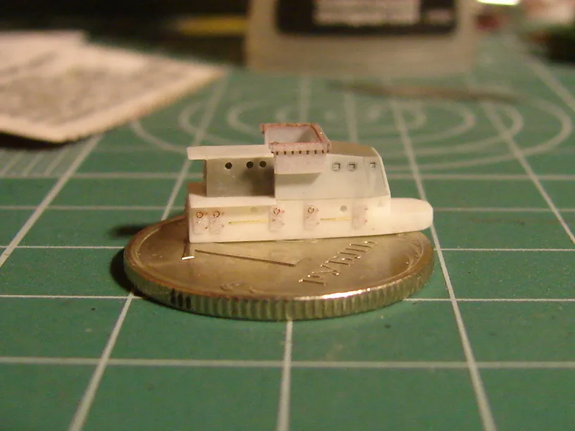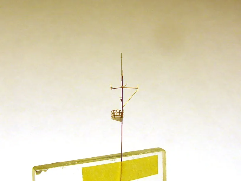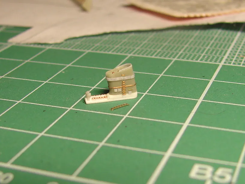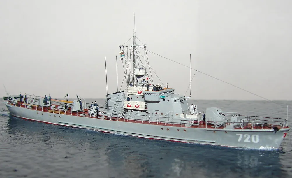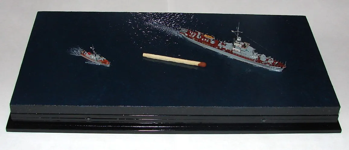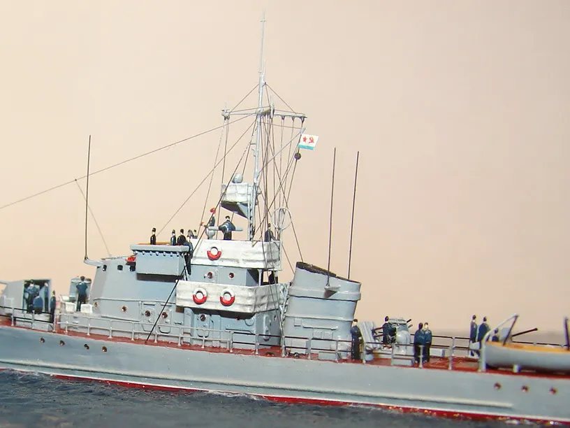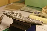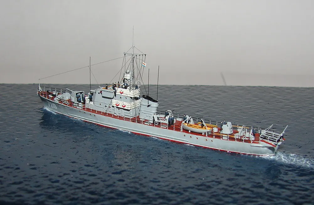 Модель построена в масштабе 1/700 практически "с нуля". За основу был взят набор от фирмы Комбриг, но так как все детали в наборе были "кривые" или с браком, проще было всё сделать самостоятельно. Модель строилась по чертежам и фотографиям из двух монографий посвящённых кораблям этого проекта и материалам из Интернета . Из набора взяты только три детали, которые более-менее можно было использовать в постройке модели: корпус, ходовая рубка, дымовая труба /на фотографиях процесса постройки они выглядят серо-зелёными/. Так как корпус тонкий и длинный, его повело «бананом». Для выравнивания, к нижней части корпуса было прикреплено металлическое ребро жесткости на двух винтиках с гайками. Вся остальная деталировка изготавливалась самостоятельно из пластика, проволоки, элементов разных фототравленых деталей и пропитанной супер-клеем бумаги. Такелаж изготовлен из тянутого литника и тонкой капроновой нити 0.03мм. Из фабричных деталей использовалось фототравление от GMM и WEM: леера, трапы, вьюшки, фигурки моряков. Бортовые номера, эмблема и флаги сделаны из декалей подходящего размера. Модель окрашены кистью водно-растворимыми красками АКАН. Модель из общей диорамы "Корабли Ленинградской ВМБ на учениях"