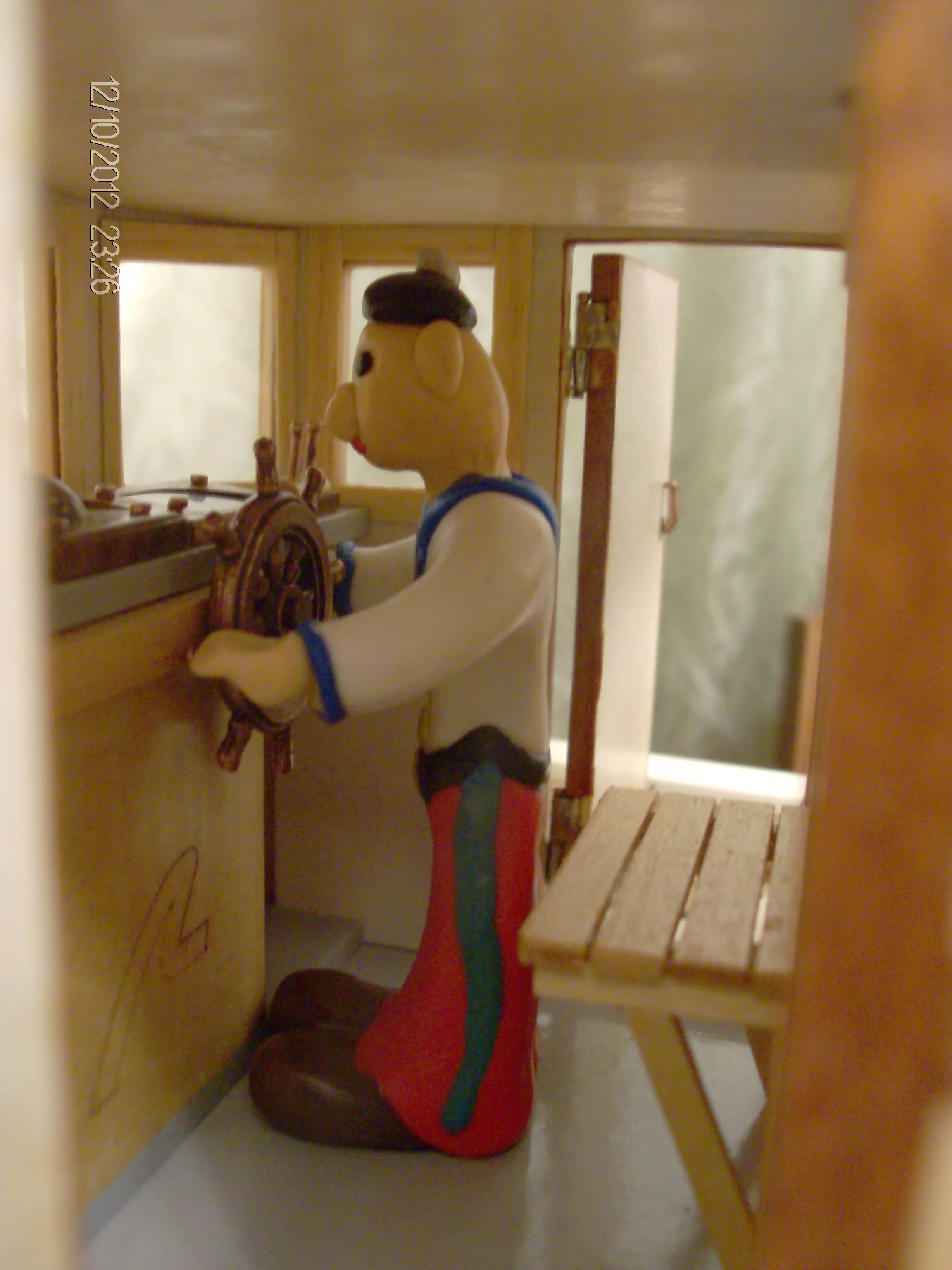 - сделать открывающиеся двери в рубке, минимальный внутренний интерьер рубки ( скамейку, приборы, т.к. в наборе предлагалось только укрепить штурвал);