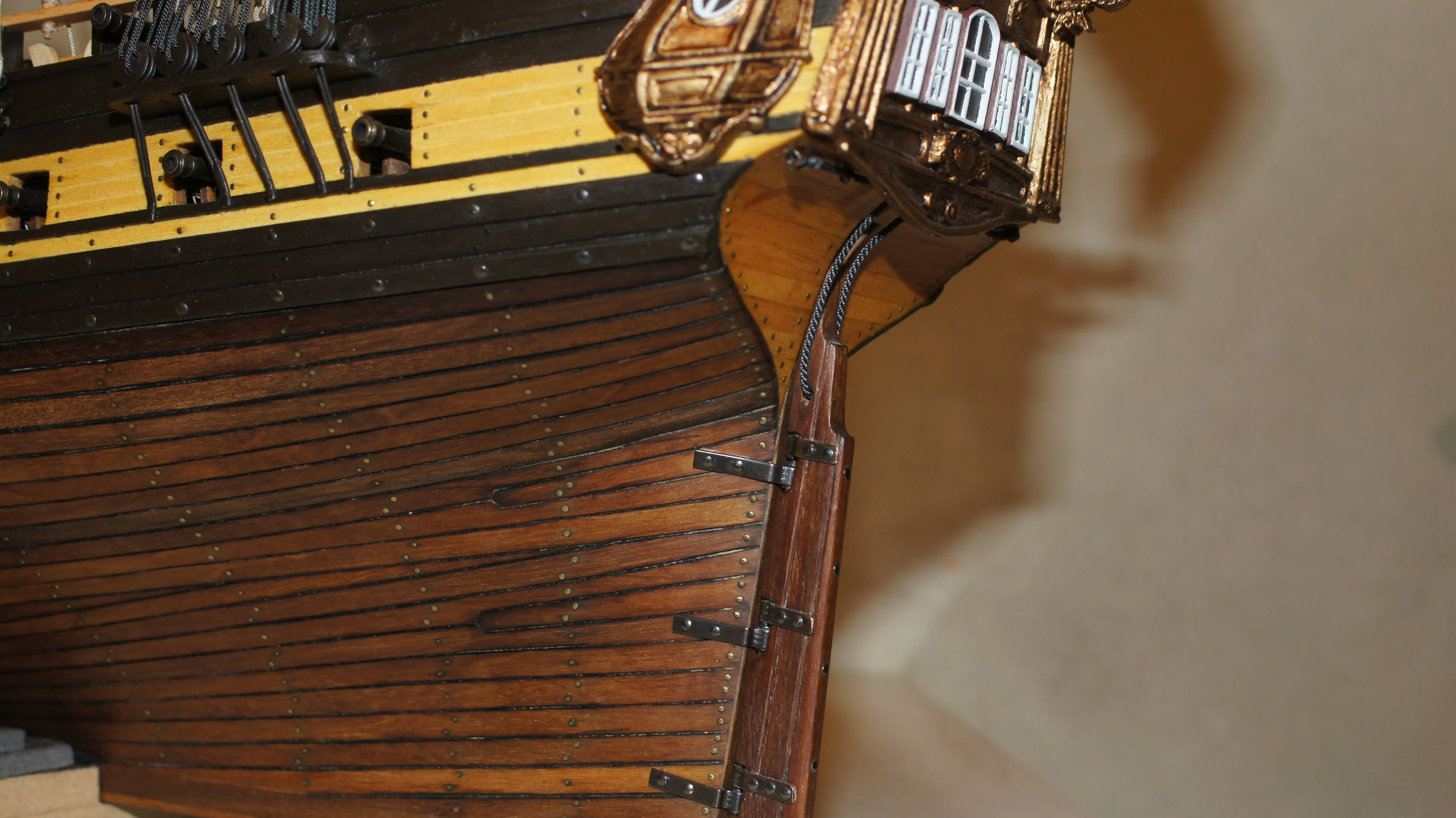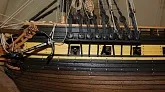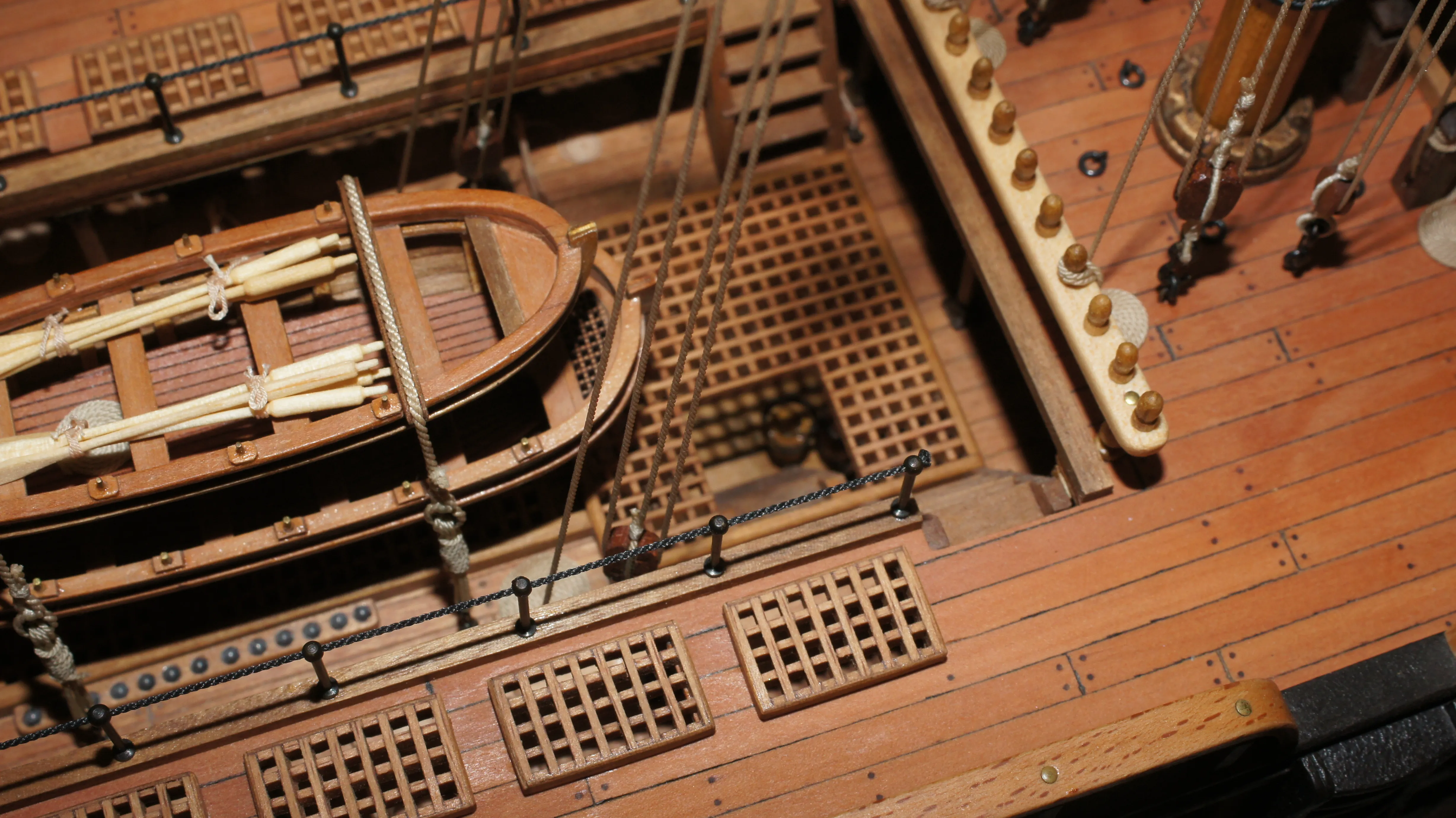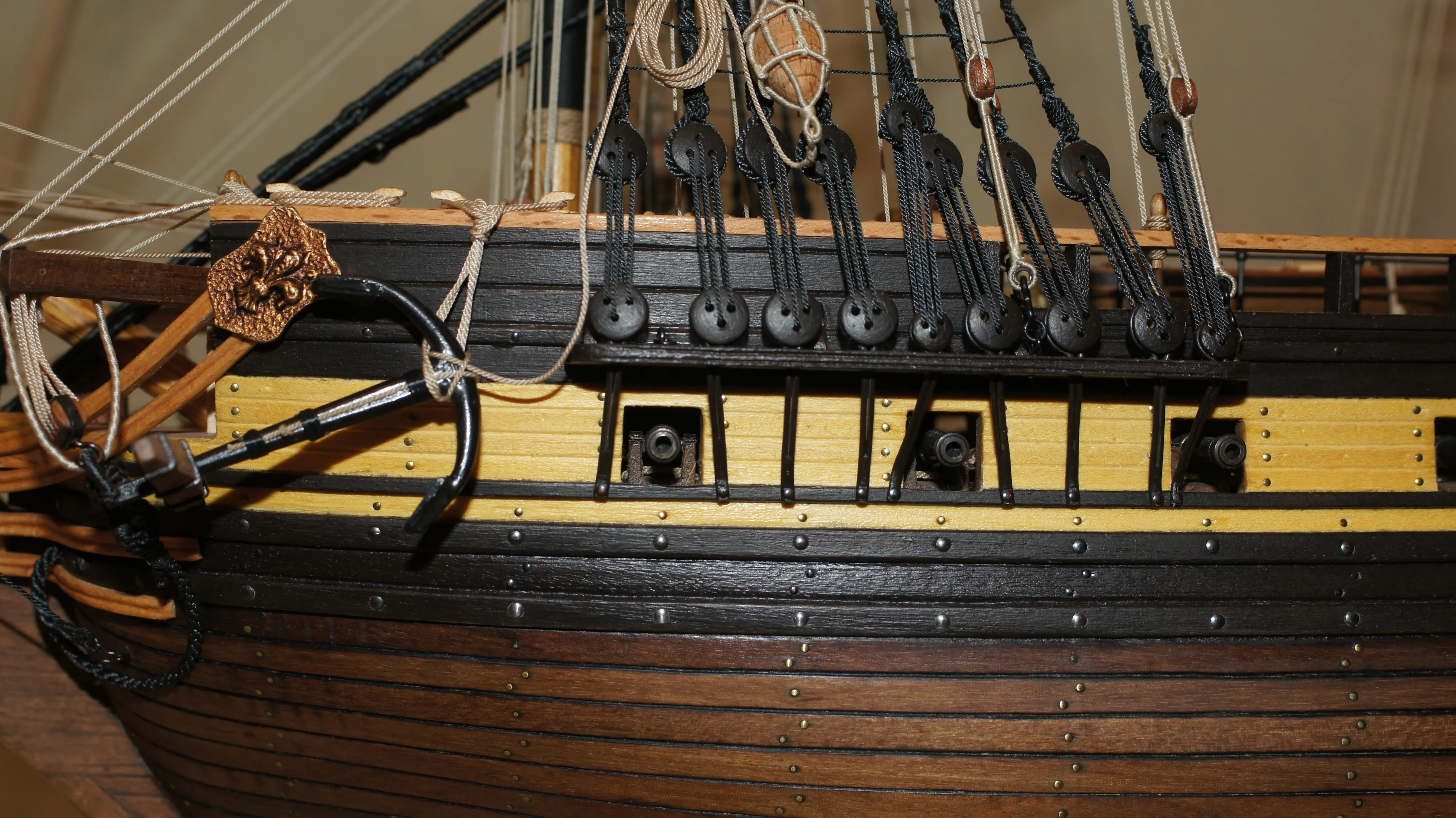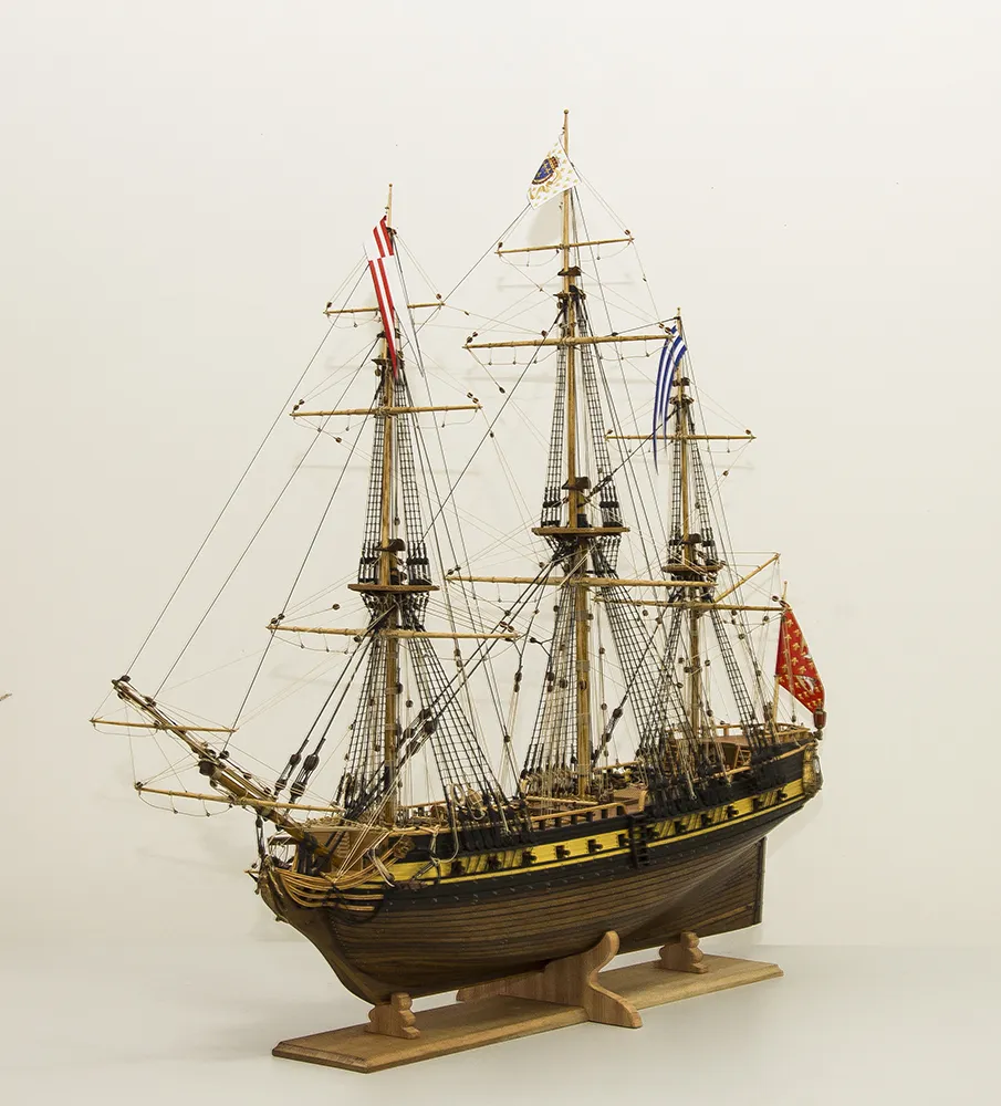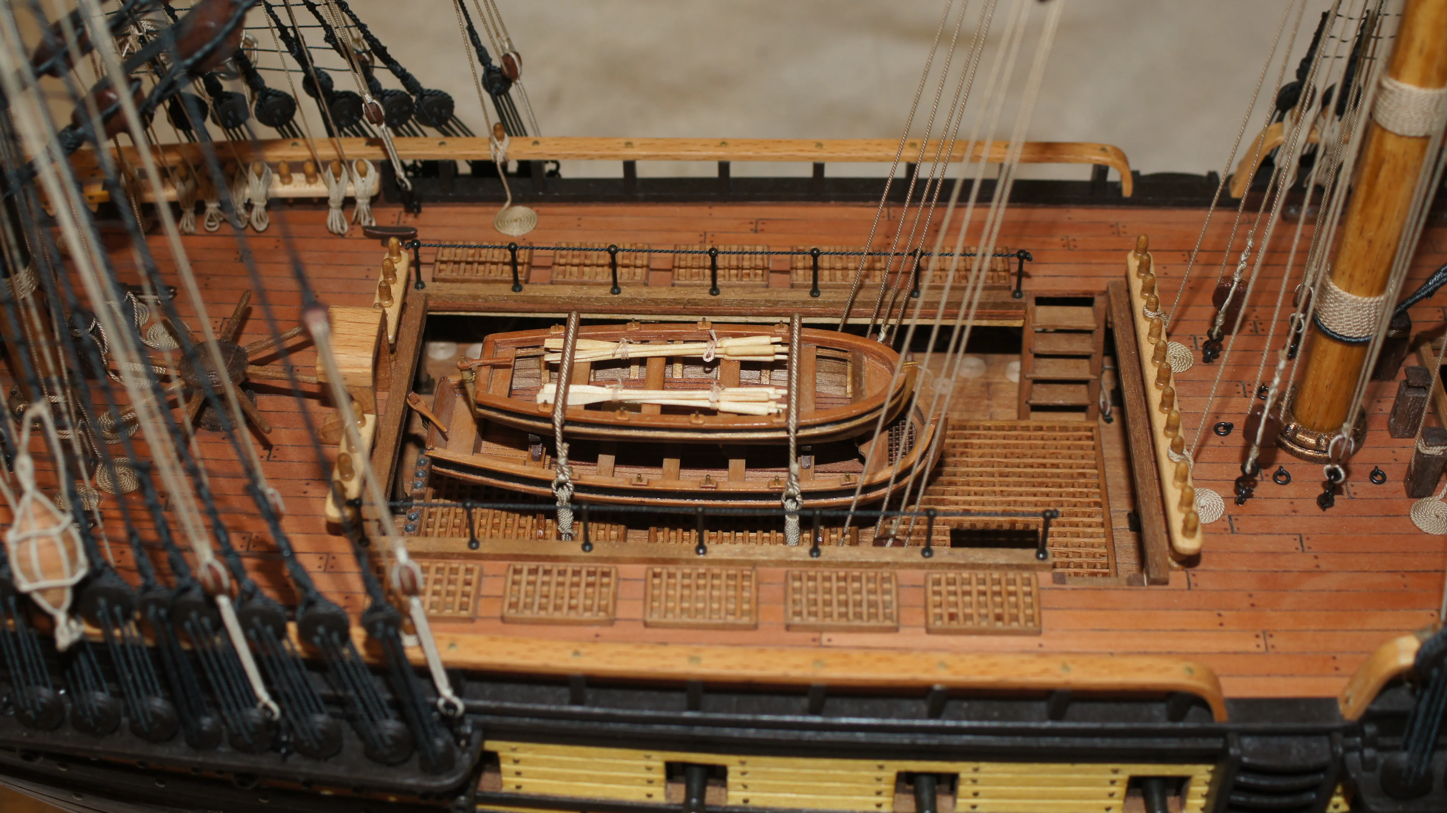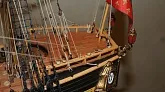 Модель фирмы COREL изготовлена в масштабе 1:75, длина 840мм, высота 705 мм, ширина 290 мм. Набор постигли глобальные переделки. В первую очередь прорезал нижнюю палубу. Потом довёл до ума пушки: сделал пушечные и откатные тали, противооткатный брюк, оковал железом колёса. В палубном настиле каждая точка – деревянный гвоздь. Добавил к набору шлюпки и кормовые фонари. Нижняя шлюпка – покупной набор, верхняя с вёслами - собственное творчество. Заменил все блоки , эзельгофты и нитки на кручёные канаты. К якорям добавил томбуи. В конце повесил новые флаги и вымпелы приобретённые на сайте «IMHOBBY.ru». Используемая литература: О.Курти «Постройка моделей судов», К.Х.Марквардт «Рангоут, такелаж и паруса судов XVIII века».