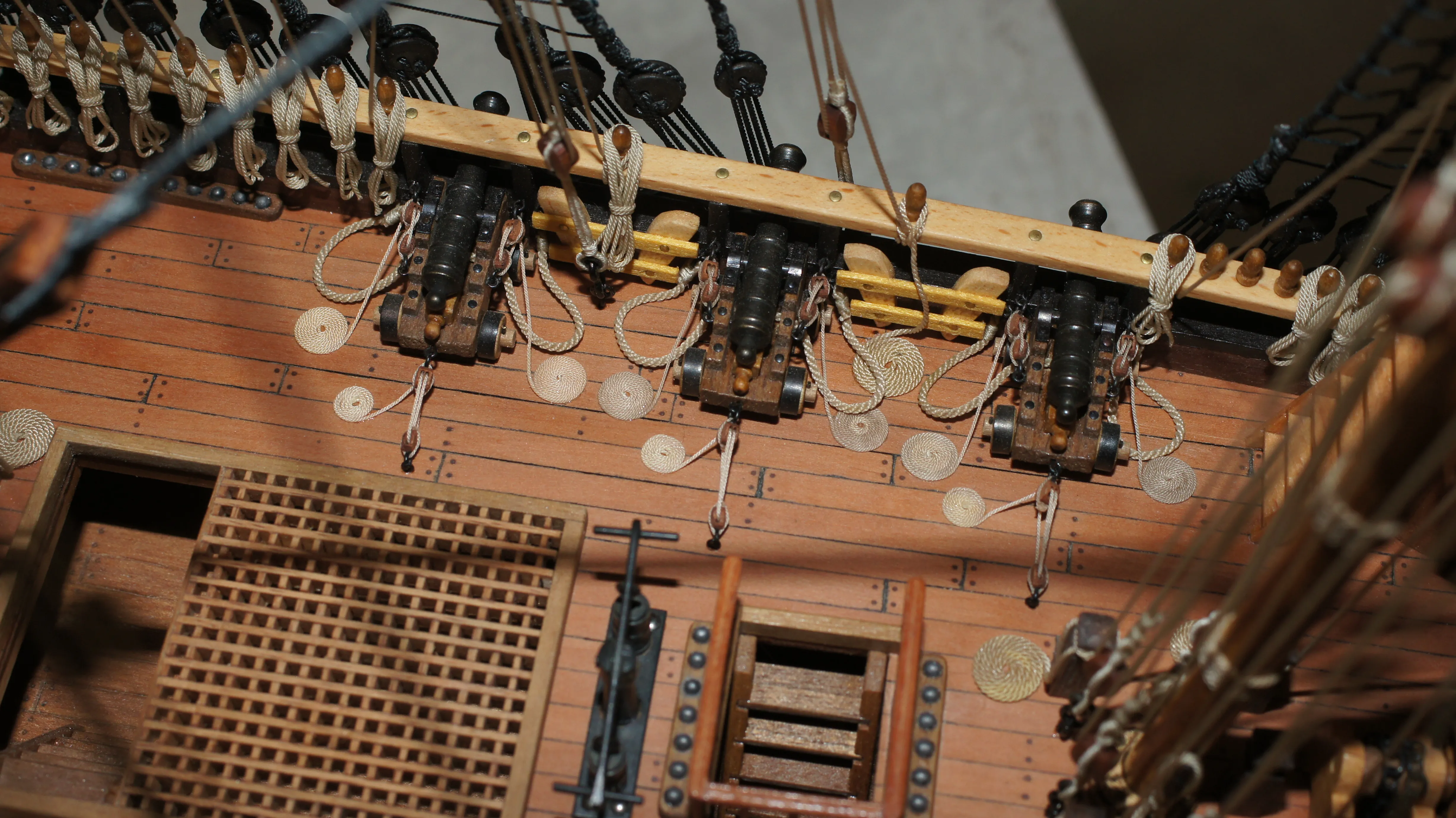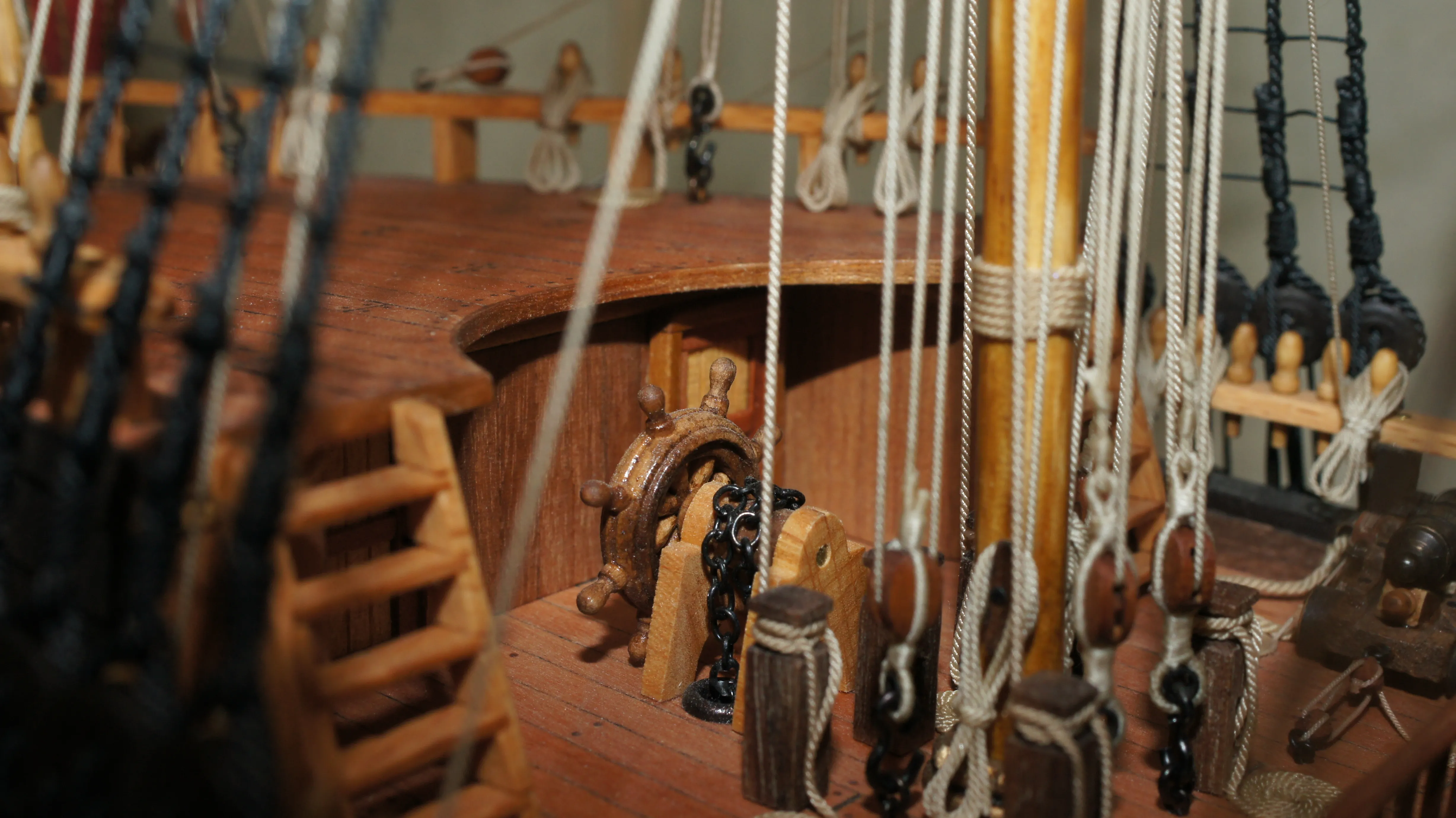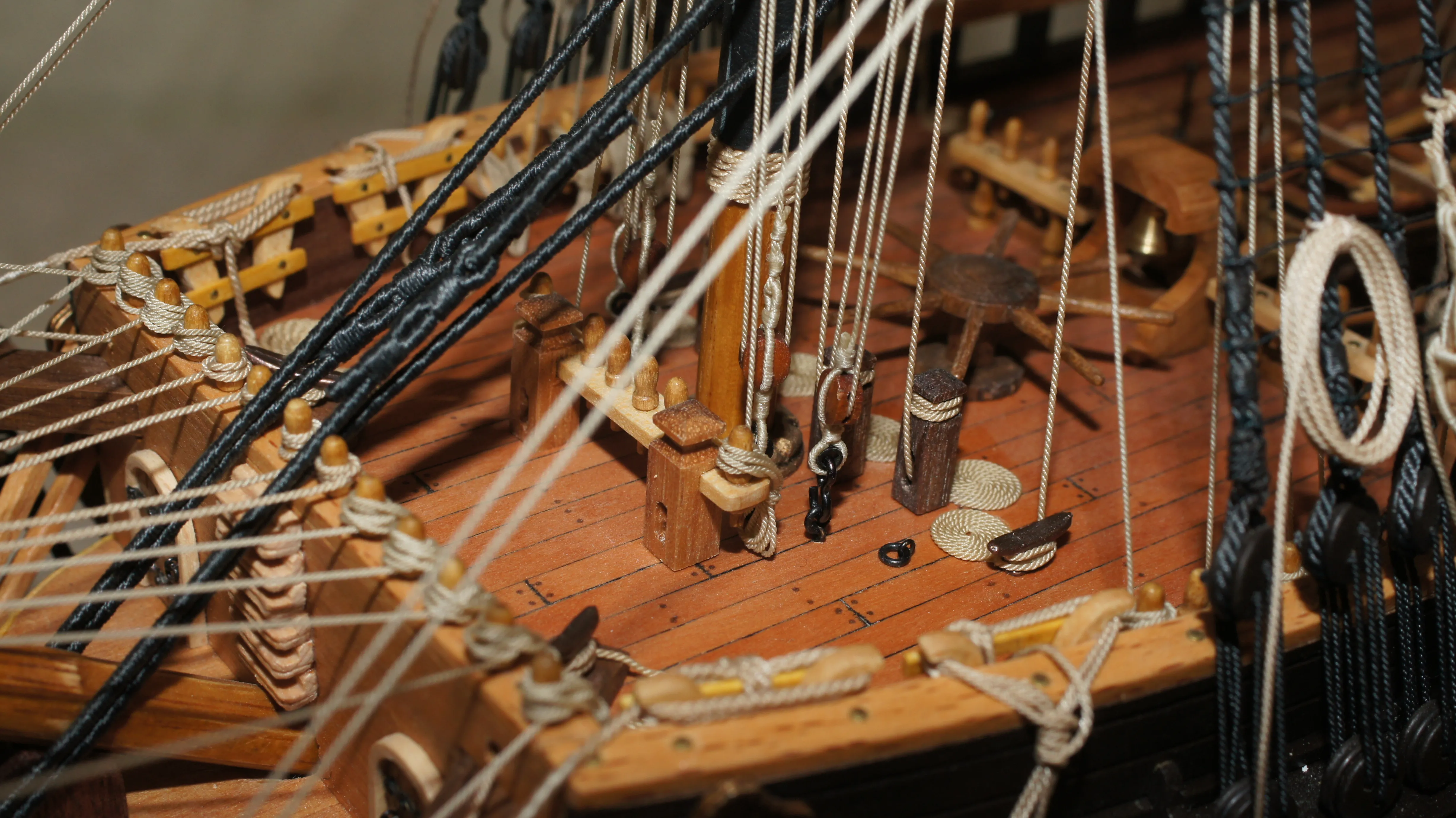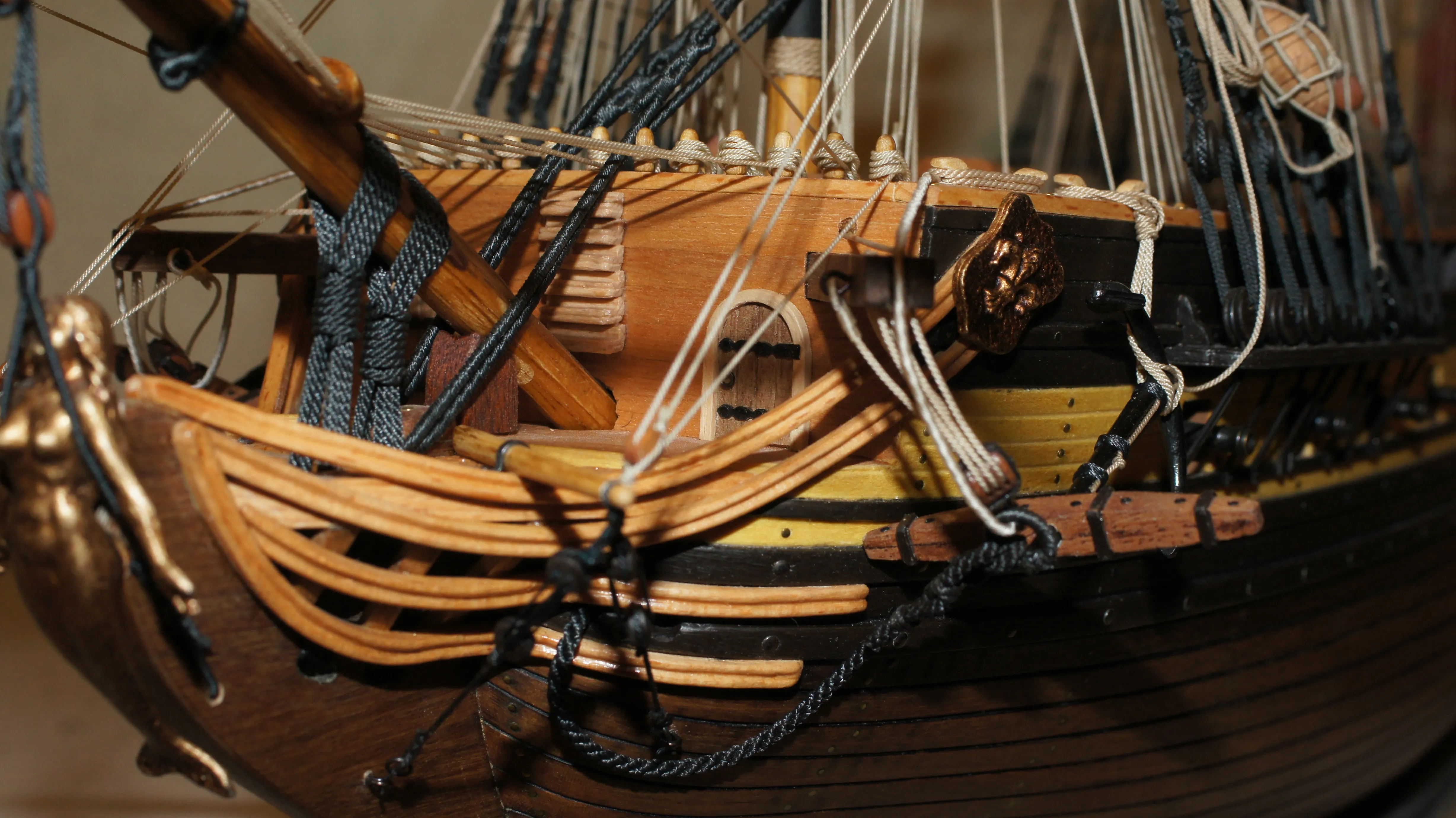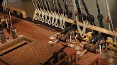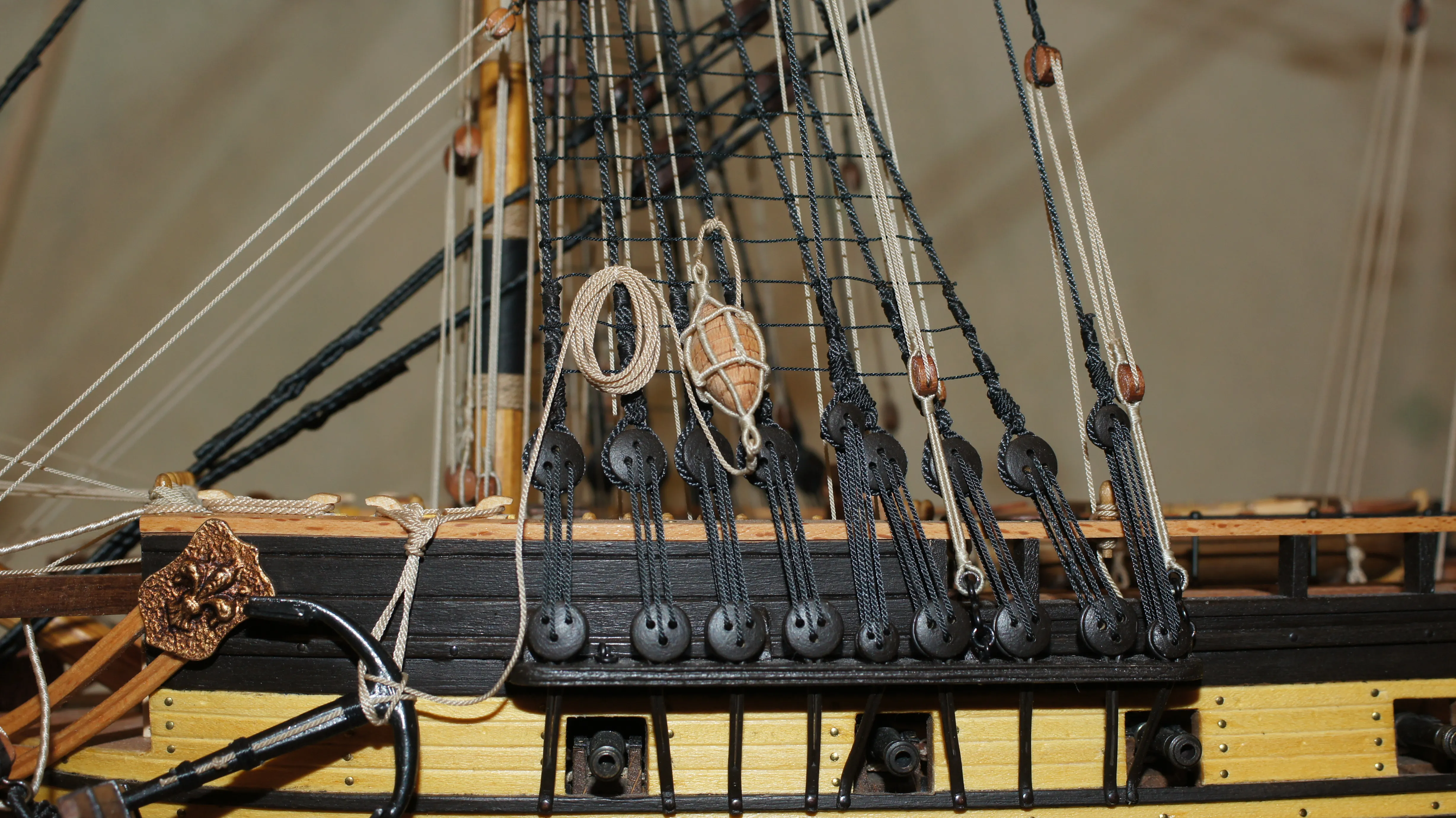 Модель фирмы COREL изготовлена в масштабе 1:75, длина 840мм, высота 705 мм, ширина 290 мм. Набор постигли глобальные переделки. В первую очередь прорезал нижнюю палубу. Потом довёл до ума пушки: сделал пушечные и откатные тали, противооткатный брюк, оковал железом колёса. В палубном настиле каждая точка – деревянный гвоздь. Добавил к набору шлюпки и кормовые фонари. Нижняя шлюпка – покупной набор, верхняя с вёслами - собственное творчество. Заменил все блоки , эзельгофты и нитки на кручёные канаты. К якорям добавил томбуи. В конце повесил новые флаги и вымпелы приобретённые на сайте «IMHOBBY.ru». Используемая литература: О.Курти «Постройка моделей судов», К.Х.Марквардт «Рангоут, такелаж и паруса судов XVIII века».
