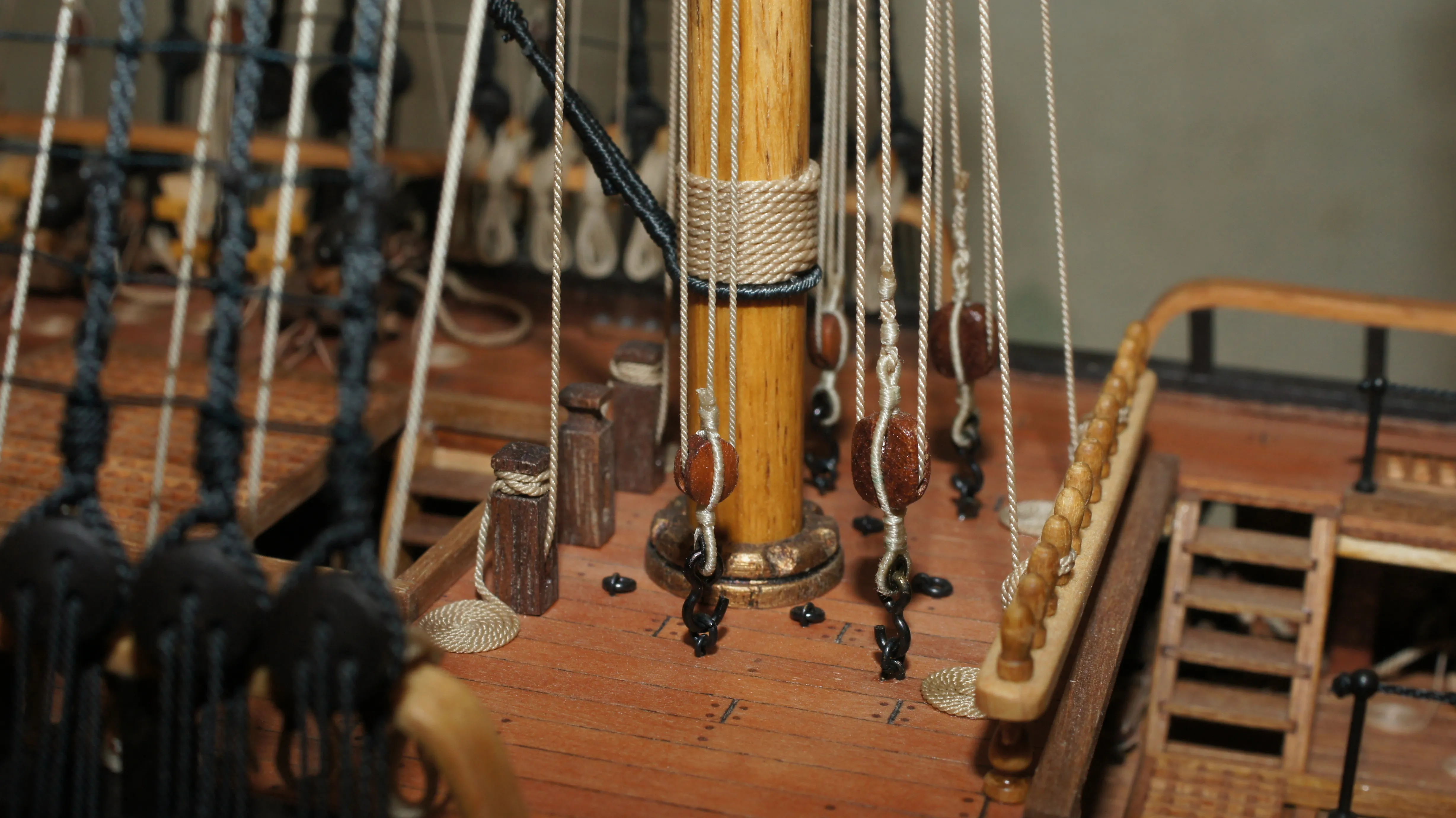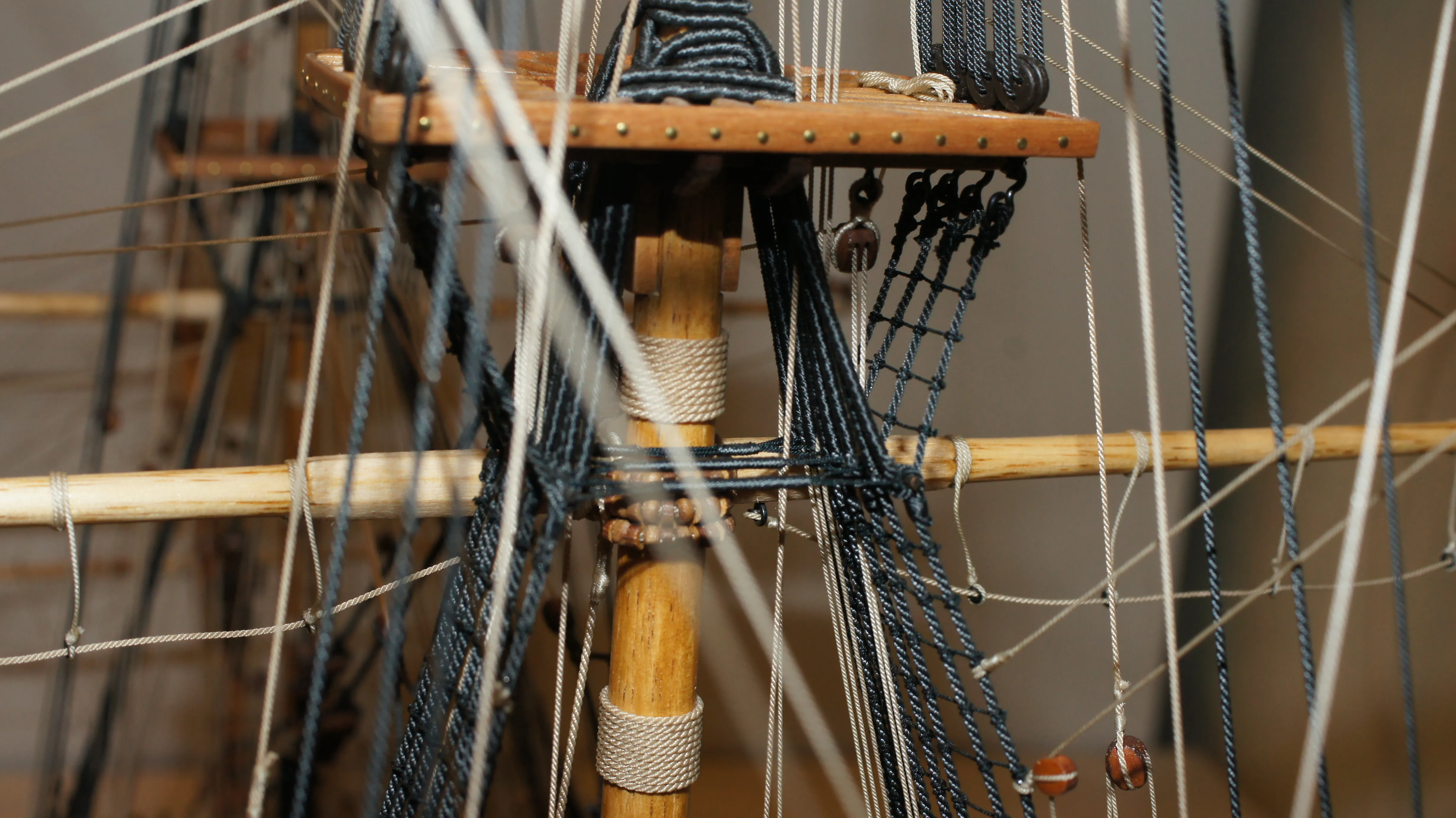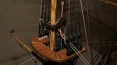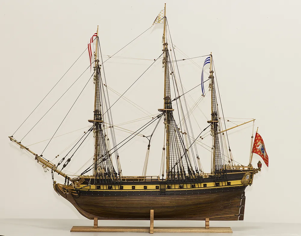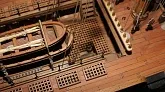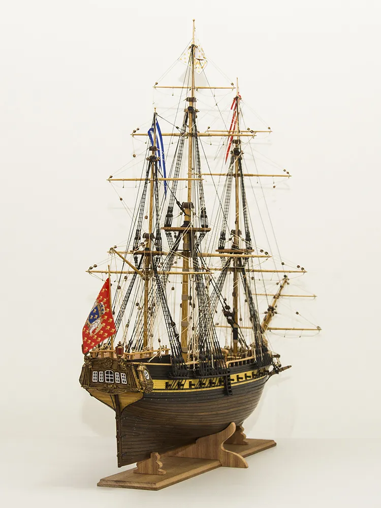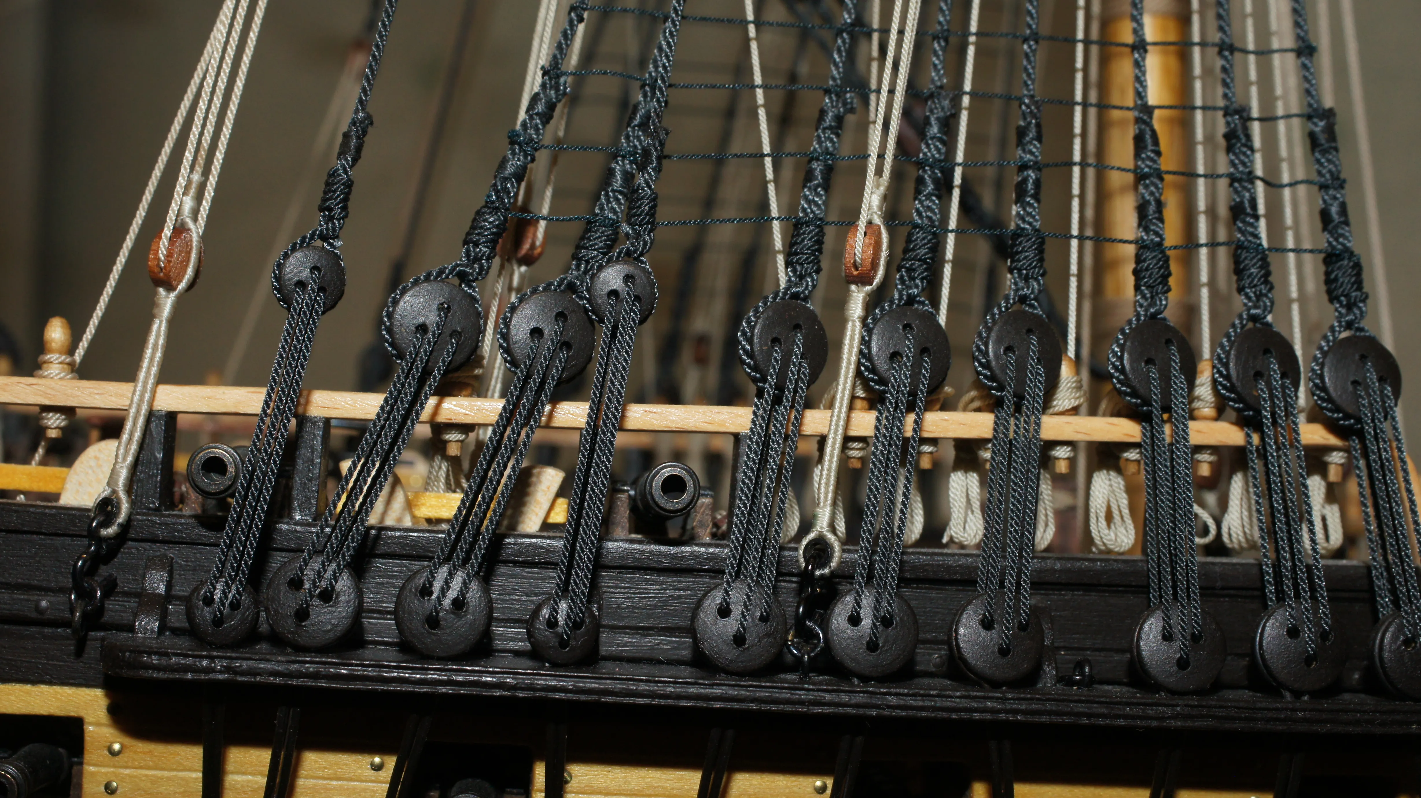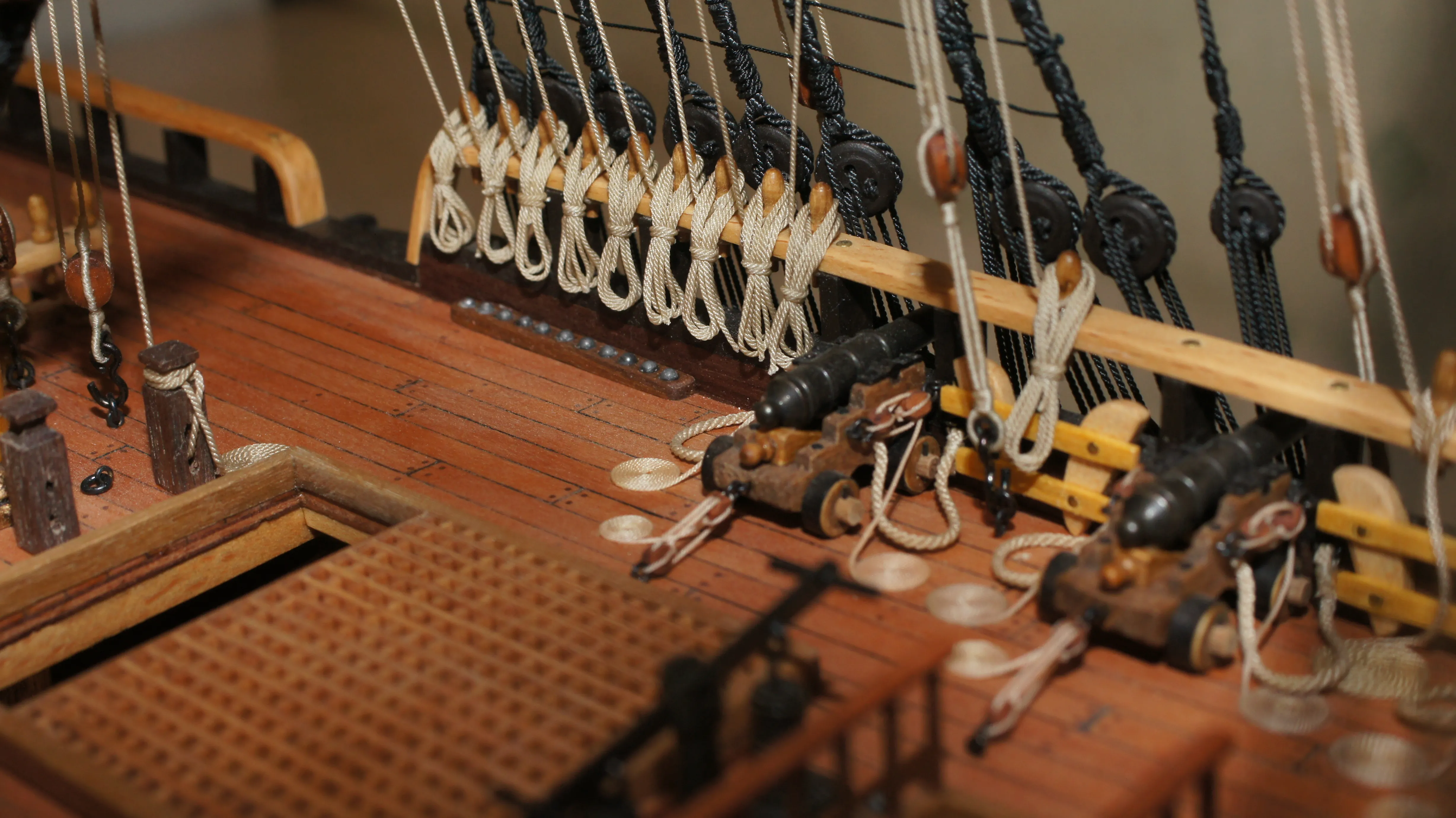 Модель фирмы COREL изготовлена в масштабе 1:75, длина 840мм, высота 705 мм, ширина 290 мм. Набор постигли глобальные переделки. В первую очередь прорезал нижнюю палубу. Потом довёл до ума пушки: сделал пушечные и откатные тали, противооткатный брюк, оковал железом колёса. В палубном настиле каждая точка – деревянный гвоздь. Добавил к набору шлюпки и кормовые фонари. Нижняя шлюпка – покупной набор, верхняя с вёслами - собственное творчество. Заменил все блоки , эзельгофты и нитки на кручёные канаты. К якорям добавил томбуи. В конце повесил новые флаги и вымпелы приобретённые на сайте «IMHOBBY.ru». Используемая литература: О.Курти «Постройка моделей судов», К.Х.Марквардт «Рангоут, такелаж и паруса судов XVIII века».