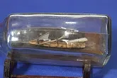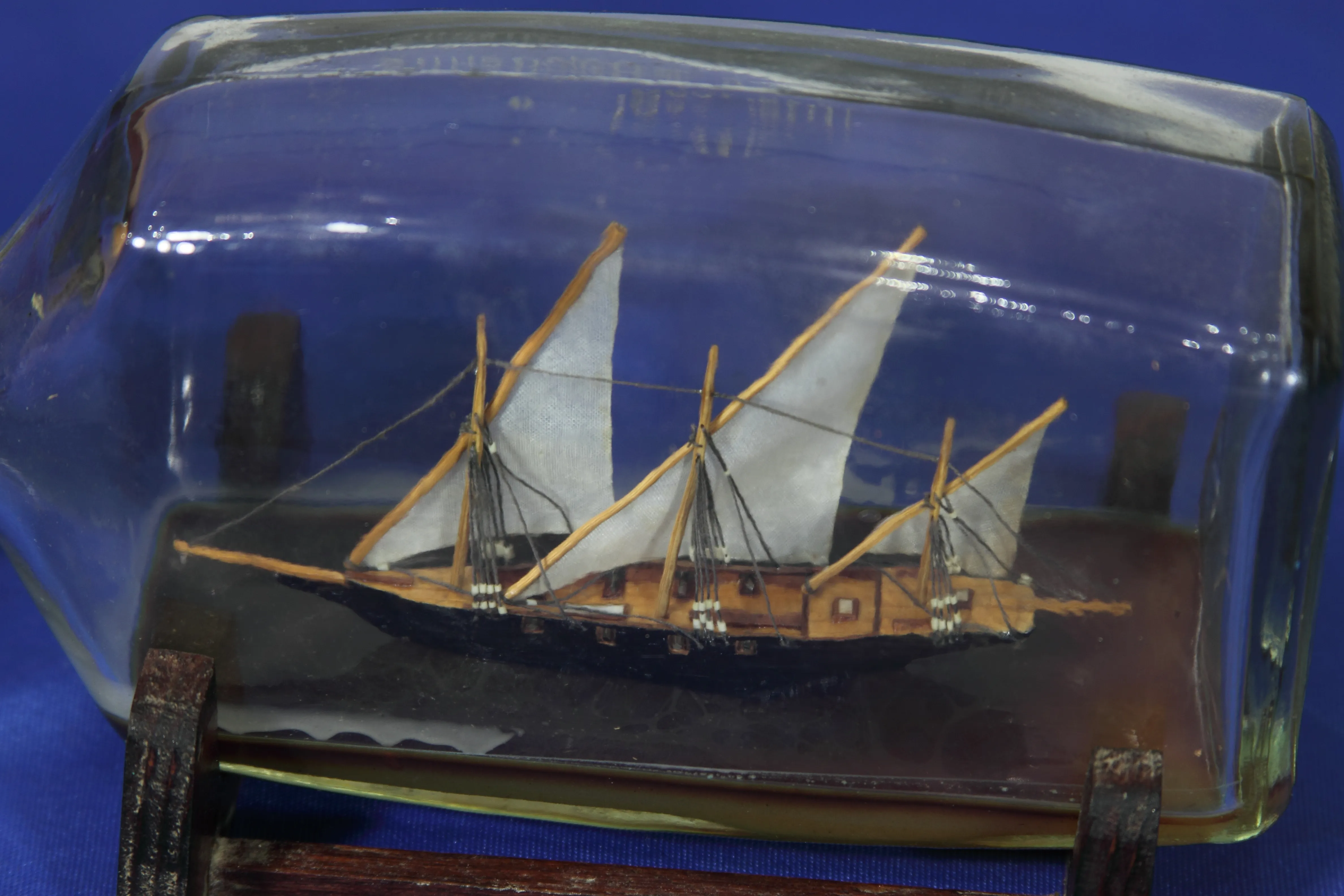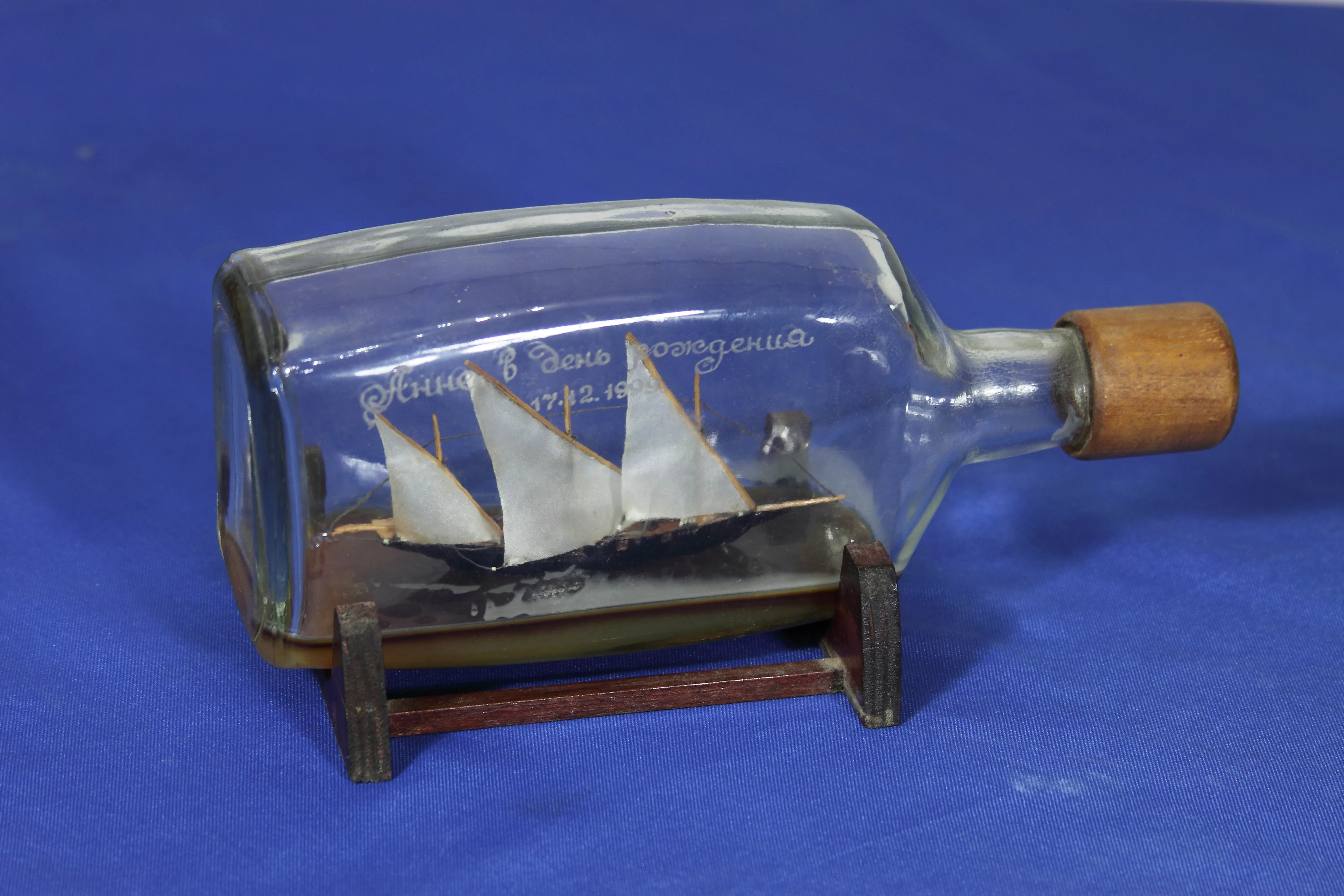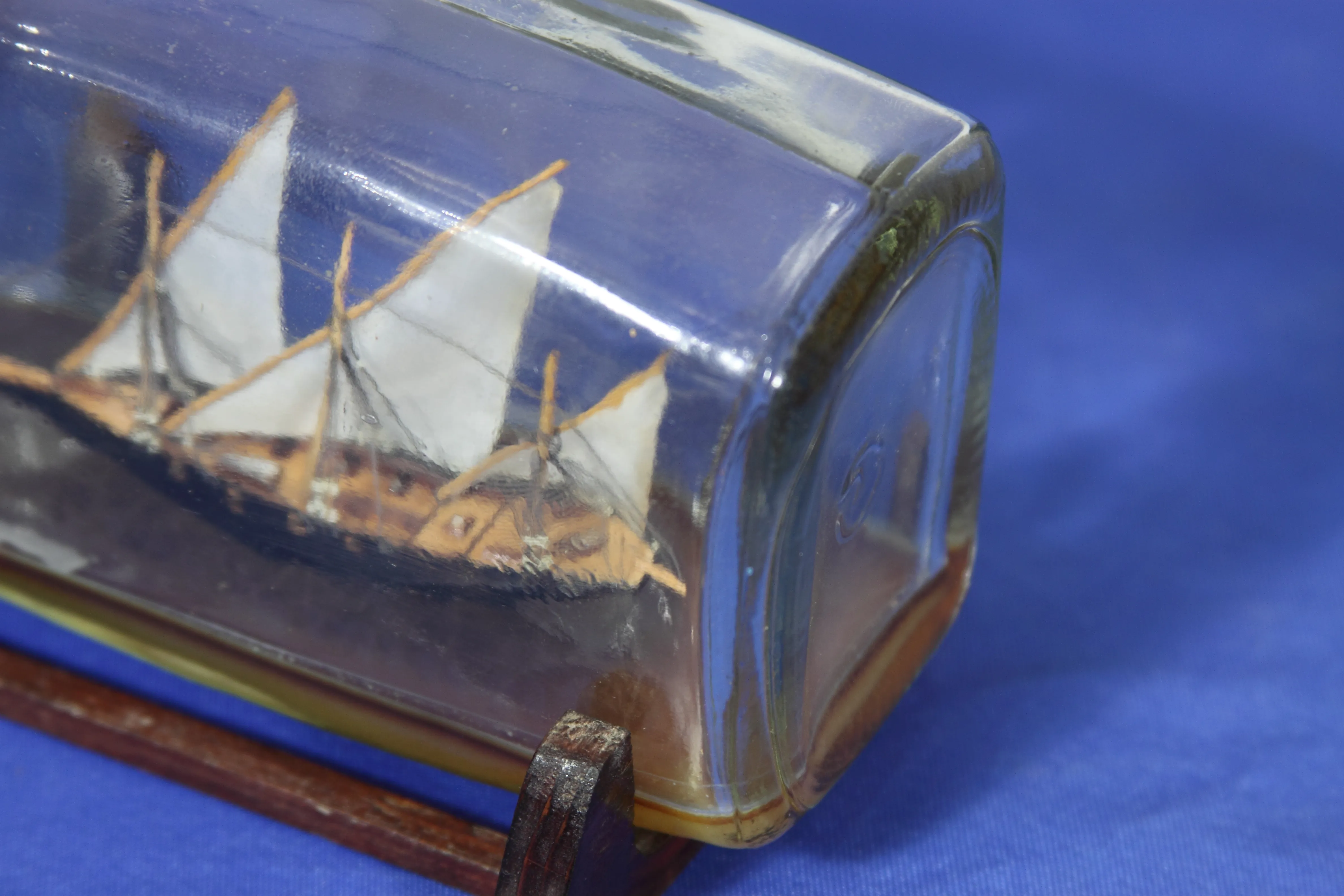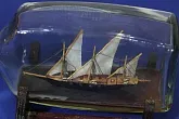 Сразу хочу извиниться за качество стекла. Модель была сделана как подарок еще в прошлом веке. Корпус изготовлен из сосны. Мачты-бамбук. Пушки из аллюминиевой проволоки ,покытой желтым лаком. В качесте воды истользовал эпоксидную смолу, подкрашенную чернилами.