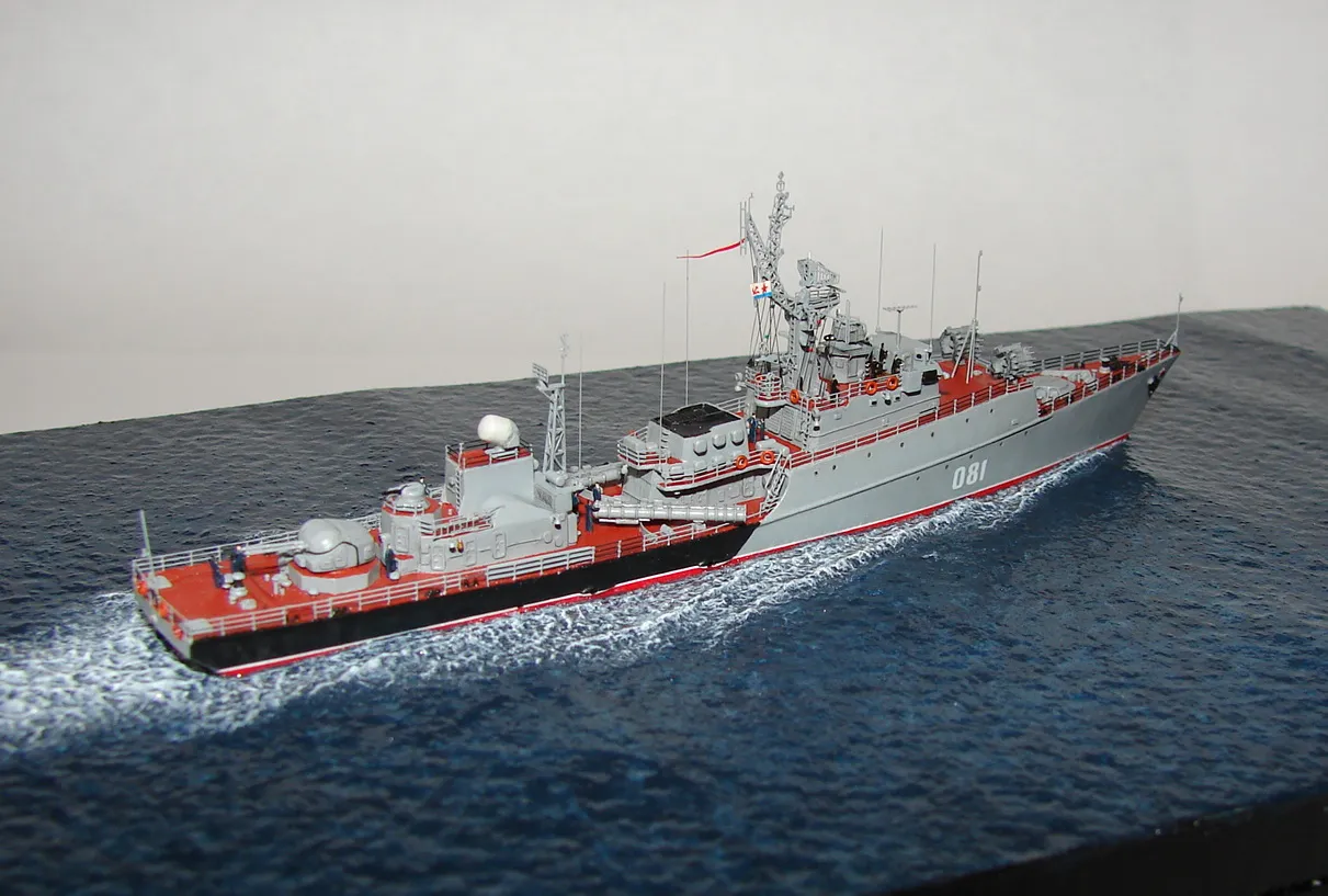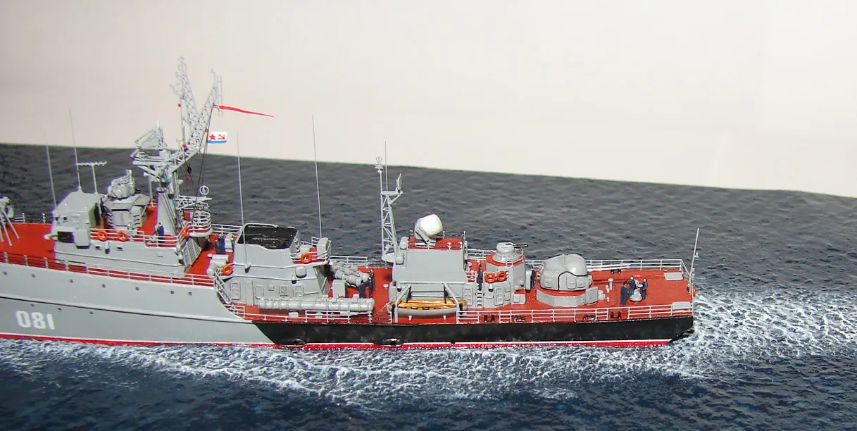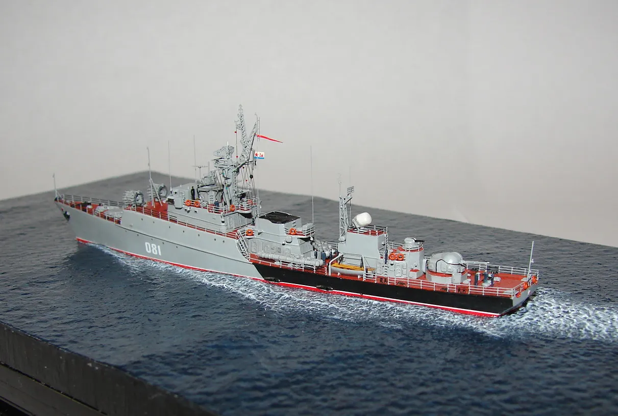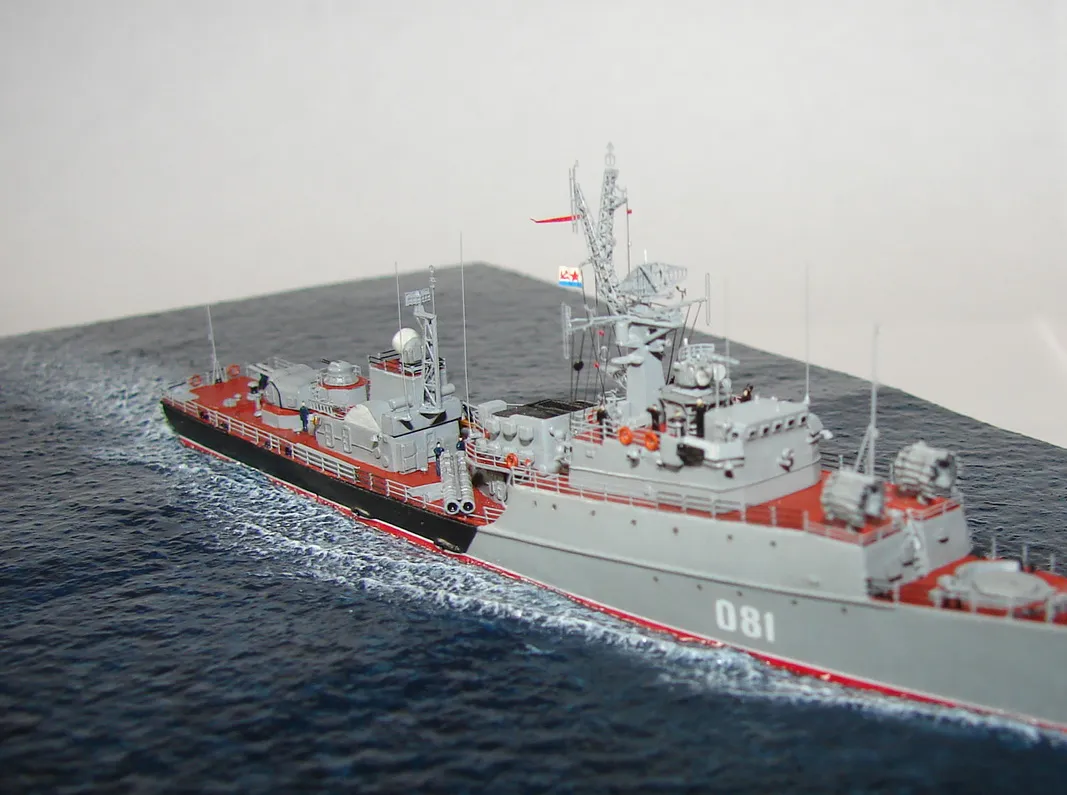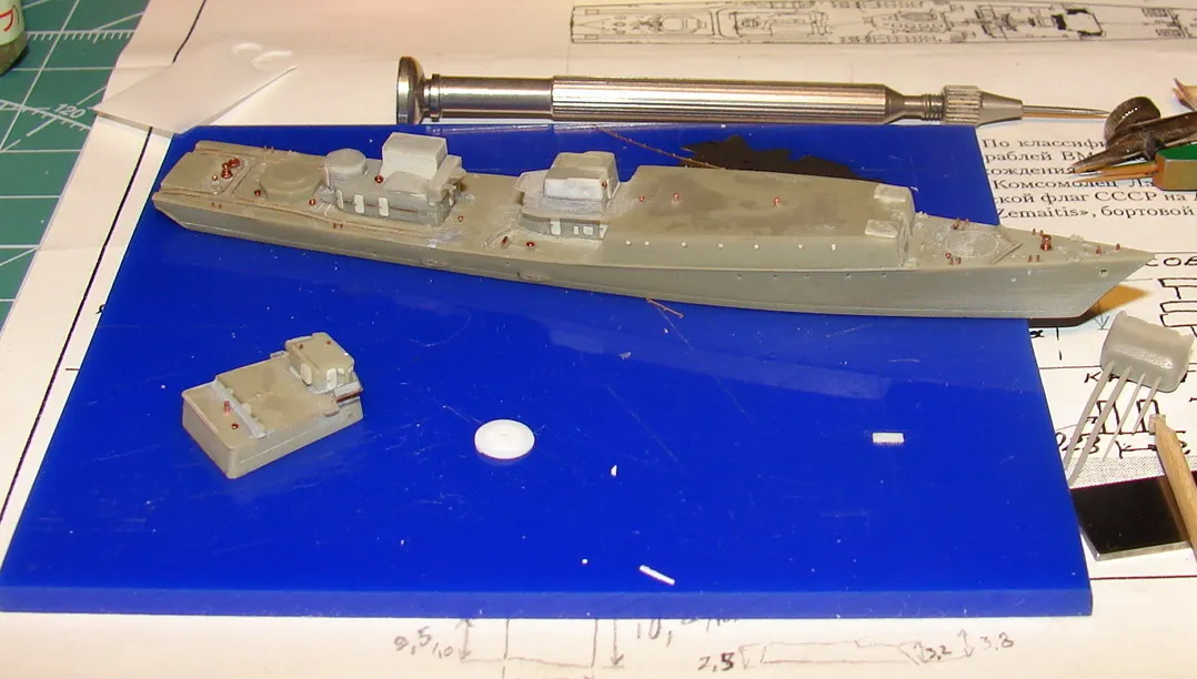 Данная модель изготовлена в масштабе 1/700, по технологии "самодел/набор". За основу был взят набор комбриговской модели "МПК-44". Из самого набора использовались только несколько деталей, которые подверглись исправлению и доработке по чертежам и фотографиям - это корпус, дымовая труба, первый ярус надстройки на спардеке и ходовая рубка, шлюпка, пирамидальная колонна мачты, башня АК-725, тумба под РЛС ЗРК "Оса". Кормовая надстройка и кожух дымовой трубы изготовлены самостоятельно. Единственные детали от набора, которых не коснулась доработка и исправление - это киповые планки. Они только были срезаны со своих мест на палубе, во время работ по исправлению и выравниванию корпуса. Некоторые детали были использованы в виде "клонов", скопированы и отлиты по технологии "resin kit" - это башенка "АК-630", РЛС "Вымпел" и двери. Некоторые детали были сделаны из отдельных элементов фототравления, не относящихся к данной модели, например, ажурная часть мачты без кронштейнов и антенн, собрана из тринадцати (13) отдельных элементов от разных фототравеных деталей, небольшая мачта на кормовой надстройке собрана из трёх (3) элементов. Вообще, в природе существует только несколько наборов фототравленых деталей для моделей современных кораблей отечественного флота в масштабе 1/700, так что, при постройке какой нибудь модели всегда приходится импровизировать из имеющегося. Из стандартных фототравленых деталей были использованы: леера, трапы, двери, рамы прямоугольных иллюминаторов, эмблемы-звёзды на носе корпуса, всевозможные антеннки и локаторы, фигурки человечков. Бортовые номера, герб на корме и флаг сделаны из фабричной детали подходящего размера. Вымпел изготовлен самостоятельно из кусочка детали. Остальная деталировка была сделана полностью самостоятельно из пластика, проволоки, пропитанной супер-клеем бумаги. Например, одна торпедная установка, вместе с палубными деталями для неё, состоит из сорока (40) отдельно изготовленных элементов, один ствол от АК-725 собран из семи (7) деталей (ствол, три кронштейна, две трубки и шланг охлаждения), одна установка "РБУ-6000" собрана из сорока двух (42) отдельных деталей, крышка ПУ ЗРК "Оса" со всей деталировкой собрана из одиннадцати (11) деталей, РЛС ЗРК "Оса" собрана из пятидесяти семи (57) отдельно сделанных элементов и деталей. Модель окрашена кистью, водорастворимыми красками АКАН. При работе над моделью использовались чертежи фирмы GMS Model Building, книга Костриченко В.В. "Альбатрос"- Дозорный в море и материалы из сети Интернет. Модель делалась по единственной и не очень крупной фотографии самого корабля, на интересующий меня период - середина 1980 гг. К сожалению, но других фотографий корабля того времени, мне не удалось найти и приходилось пользоваться фотографиями других кораблей этого типа в тот период службы. На модели есть некоторые неточности и "косяки", связанные с особенностями масштаба и некоторыми элементами фототравления, но в общем, это не сильно заметно и не сильно влияет на общую картину.