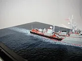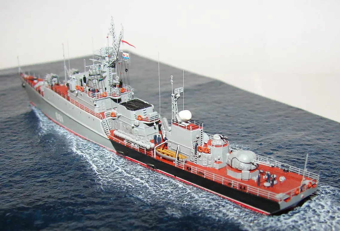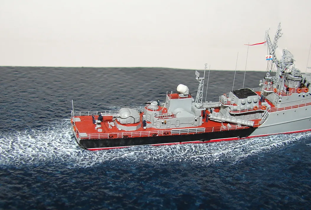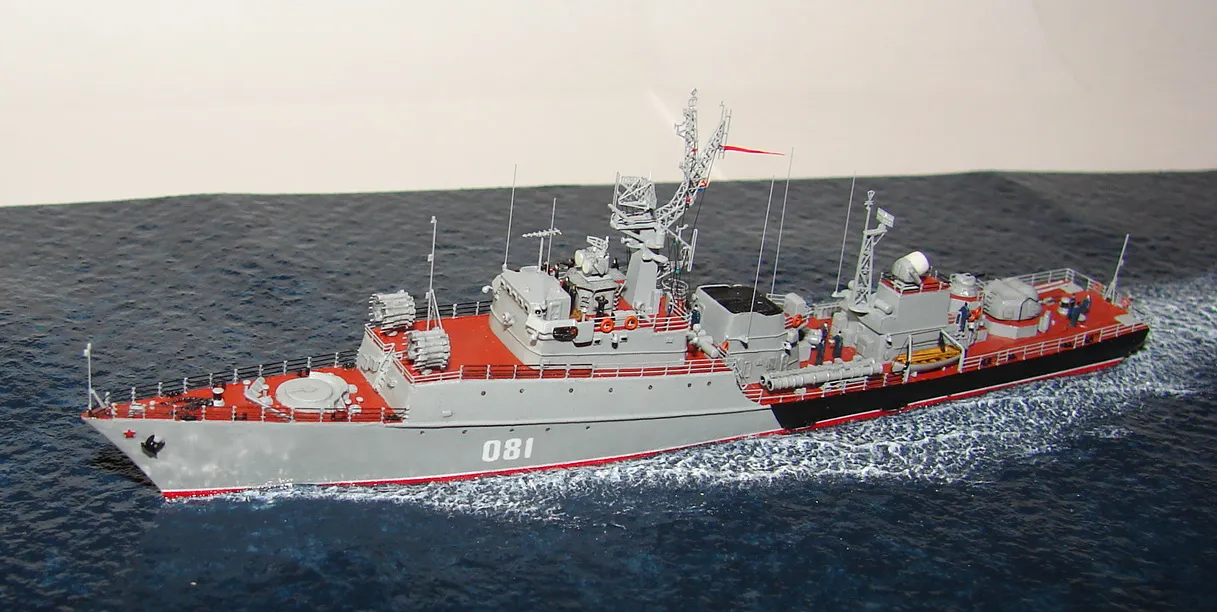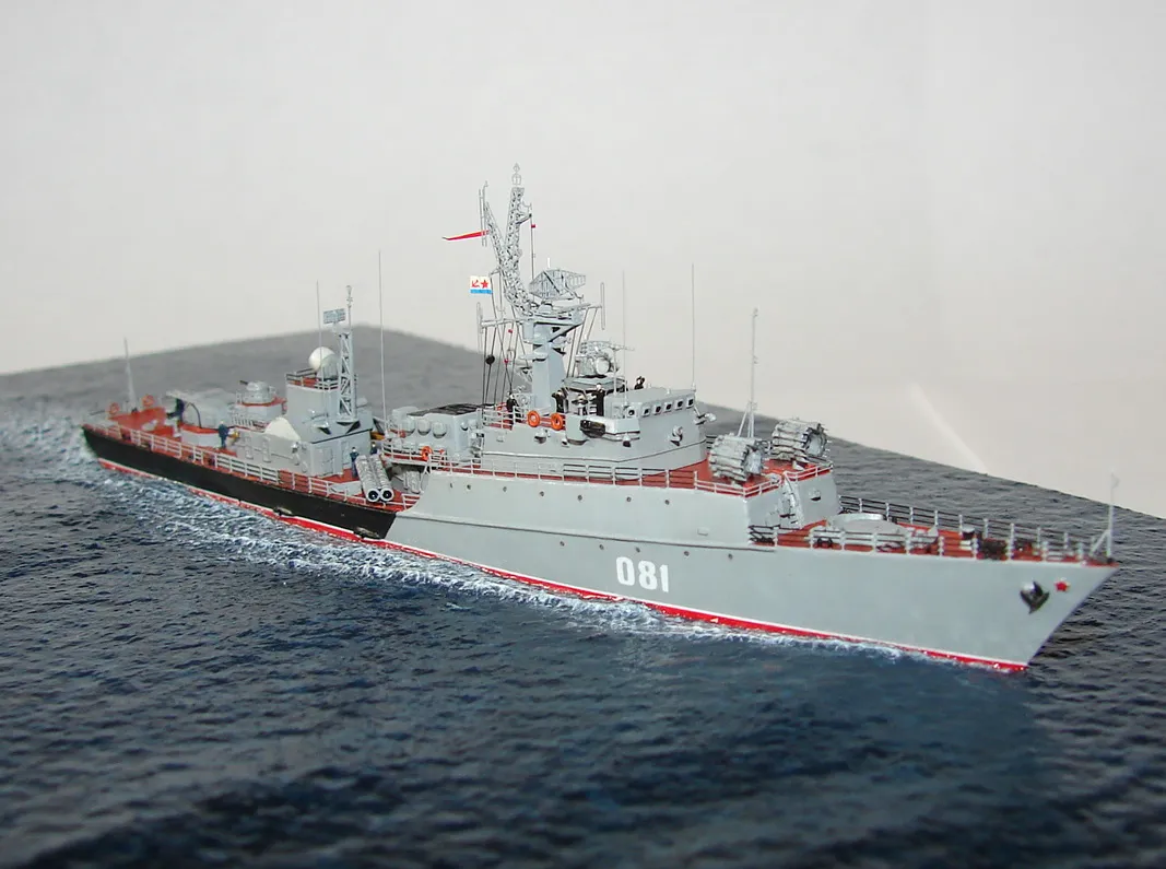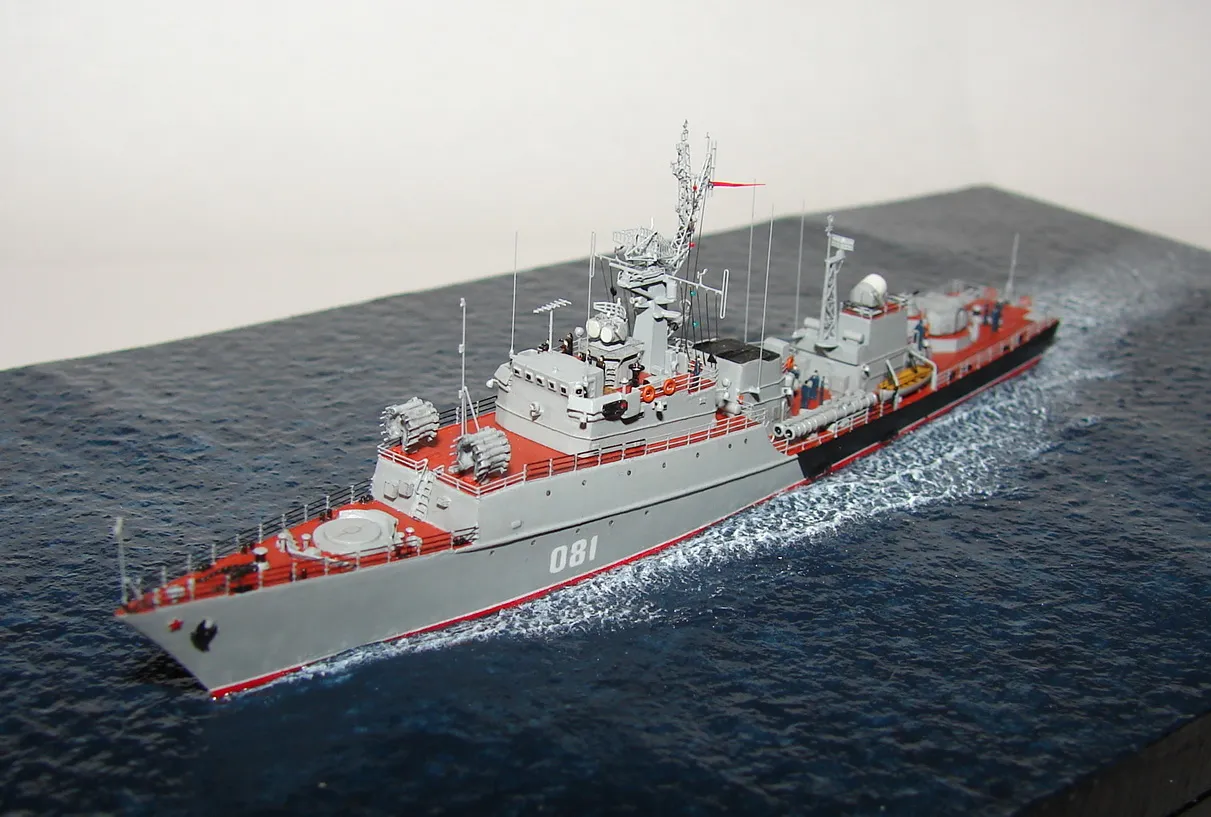 Данная модель изготовлена в масштабе 1/700, по технологии "самодел/набор". За основу был взят набор комбриговской модели "МПК-44". Из самого набора использовались только несколько деталей, которые подверглись исправлению и доработке по чертежам и фотографиям - это корпус, дымовая труба, первый ярус надстройки на спардеке и ходовая рубка, шлюпка, пирамидальная колонна мачты, башня АК-725, тумба под РЛС ЗРК "Оса". Кормовая надстройка и кожух дымовой трубы изготовлены самостоятельно. Единственные детали от набора, которых не коснулась доработка и исправление - это киповые планки. Они только были срезаны со своих мест на палубе, во время работ по исправлению и выравниванию корпуса. Некоторые детали были использованы в виде "клонов", скопированы и отлиты по технологии "resin kit" - это башенка "АК-630", РЛС "Вымпел" и двери. Некоторые детали были сделаны из отдельных элементов фототравления, не относящихся к данной модели, например, ажурная часть мачты без кронштейнов и антенн, собрана из тринадцати (13) отдельных элементов от разных фототравеных деталей, небольшая мачта на кормовой надстройке собрана из трёх (3) элементов. Вообще, в природе существует только несколько наборов фототравленых деталей для моделей современных кораблей отечественного флота в масштабе 1/700, так что, при постройке какой нибудь модели всегда приходится импровизировать из имеющегося. Из стандартных фототравленых деталей были использованы: леера, трапы, двери, рамы прямоугольных иллюминаторов, эмблемы-звёзды на носе корпуса, всевозможные антеннки и локаторы, фигурки человечков. Бортовые номера, герб на корме и флаг сделаны из фабричной детали подходящего размера. Вымпел изготовлен самостоятельно из кусочка детали. Остальная деталировка была сделана полностью самостоятельно из пластика, проволоки, пропитанной супер-клеем бумаги. Например, одна торпедная установка, вместе с палубными деталями для неё, состоит из сорока (40) отдельно изготовленных элементов, один ствол от АК-725 собран из семи (7) деталей (ствол, три кронштейна, две трубки и шланг охлаждения), одна установка "РБУ-6000" собрана из сорока двух (42) отдельных деталей, крышка ПУ ЗРК "Оса" со всей деталировкой собрана из одиннадцати (11) деталей, РЛС ЗРК "Оса" собрана из пятидесяти семи (57) отдельно сделанных элементов и деталей. Модель окрашена кистью, водорастворимыми красками АКАН. При работе над моделью использовались чертежи фирмы GMS Model Building, книга Костриченко В.В. "Альбатрос"- Дозорный в море и материалы из сети Интернет. Модель делалась по единственной и не очень крупной фотографии самого корабля, на интересующий меня период - середина 1980 гг. К сожалению, но других фотографий корабля того времени, мне не удалось найти и приходилось пользоваться фотографиями других кораблей этого типа в тот период службы. На модели есть некоторые неточности и "косяки", связанные с особенностями масштаба и некоторыми элементами фототравления, но в общем, это не сильно заметно и не сильно влияет на общую картину.