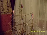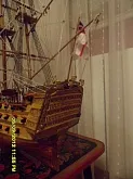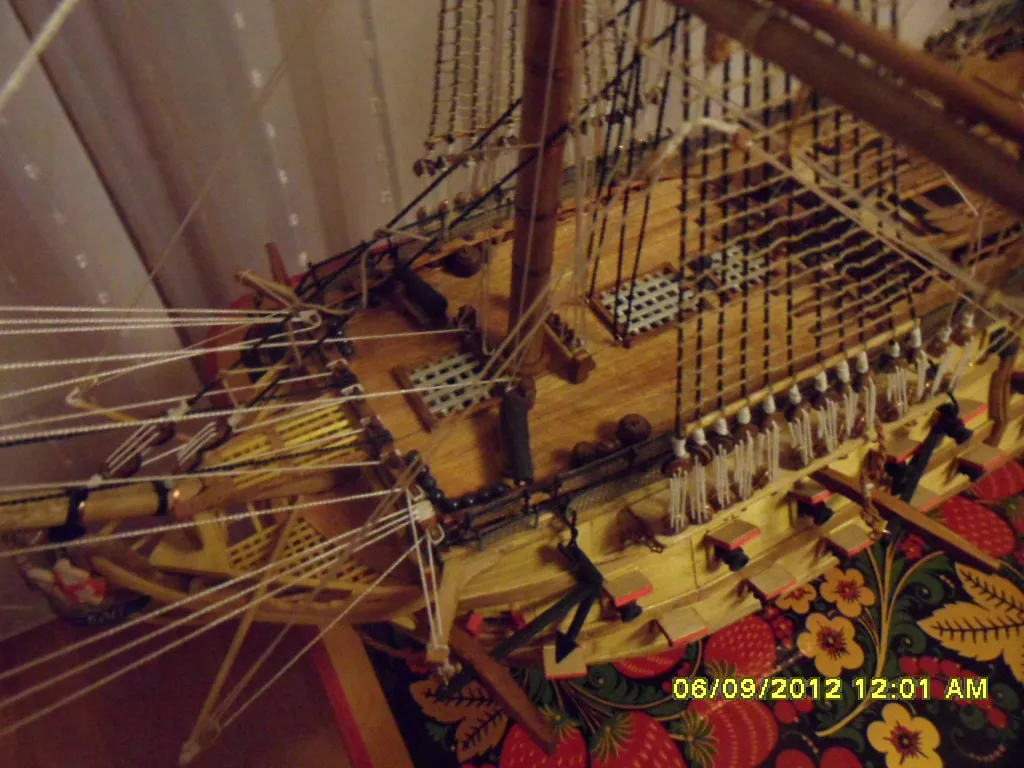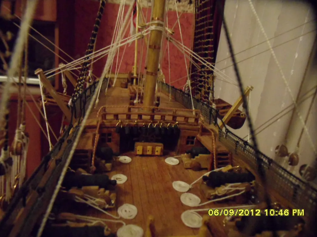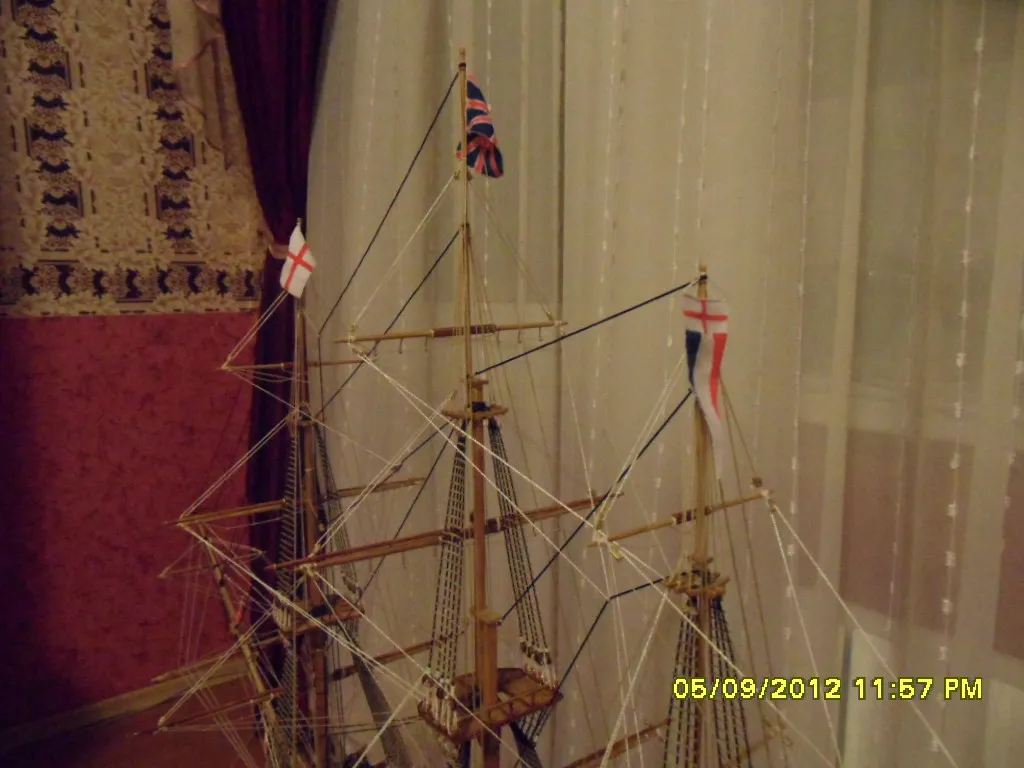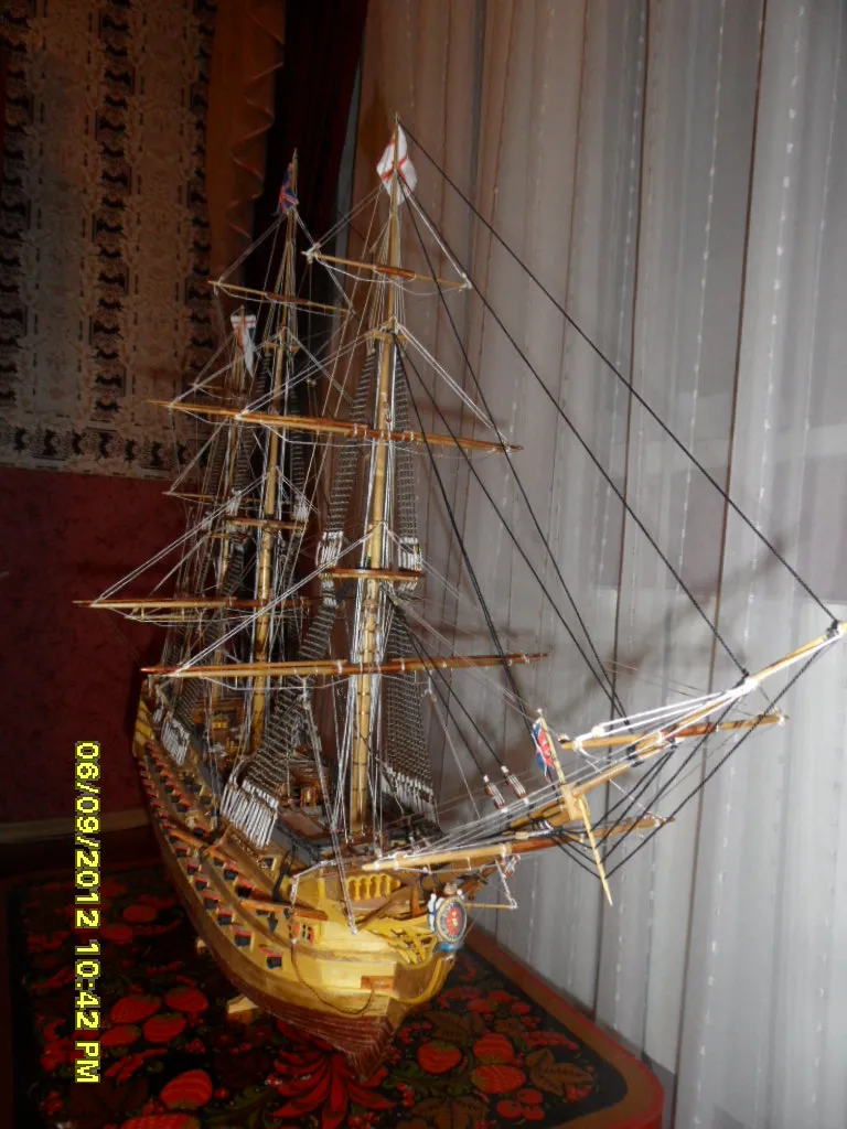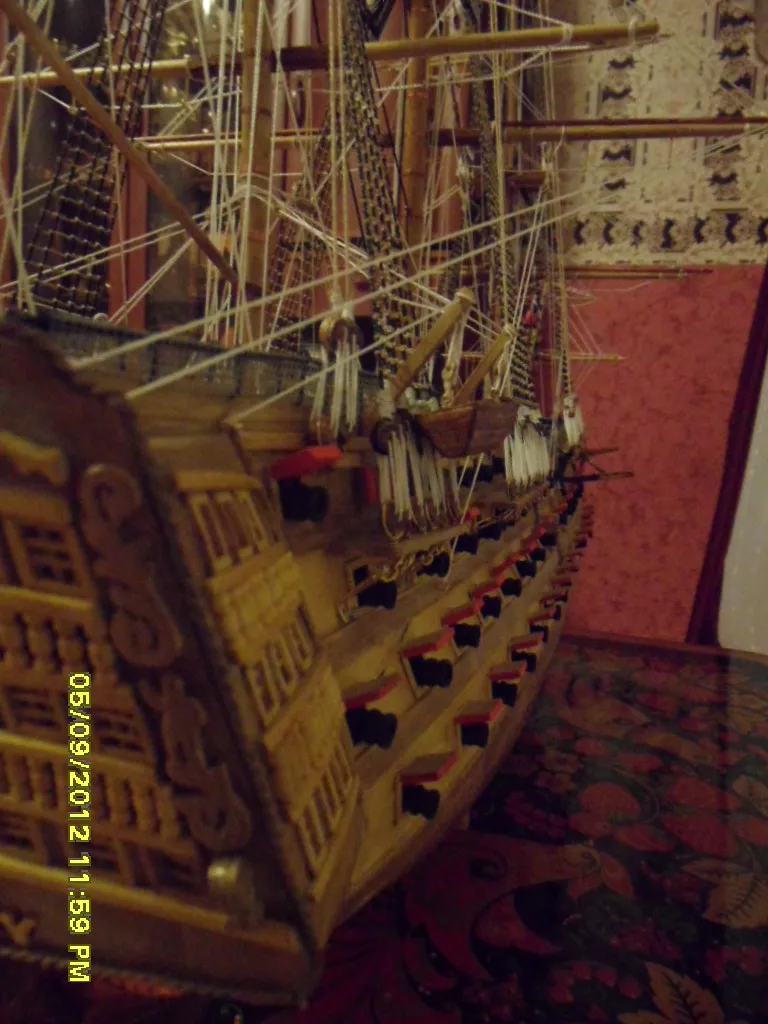 Модель построена полностью с нуля. При изготовлении использовал чертежи бумажной модели. Для постройки пользовался только ручным инструментом (кроме дрели). Из материалов использовал в основном фанеру 4 мм. Пушки выточены из дерева, днище обшито медью. Это моя первая модель, делал ее два года.